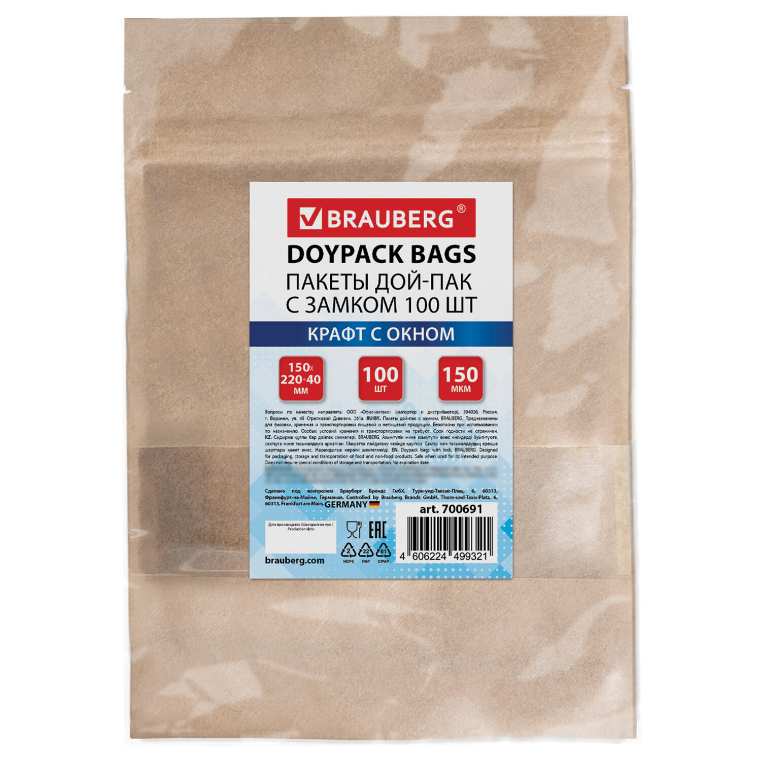 Пакеты дой-пак с замком ZIP LOCK, крафт с окном 50 мм, 150х220 + 40 мм, КОМПЛЕКТ 100 штук, 150 мкм, BRAUBERG Код товара: 700691 823,01 ₽ Купить Производитель:BRAUBERG Пакеты дой-пак BRAUBERG – современное решение для хранения и перевозки продуктов. Устойчивое дно и герметичная застёжка сохраняют свежесть, а компактный дизайн обеспечивает удобство и привлекательный внешний вид. Пакеты дой-пак BRAUBERG – современный формат упаковки, идеально подходящий для хранения и транспортировки самых разных продуктов: круп, орехов, сладостей, чая, кофе и др. Благодаря эргономичной форме они занимают минимум места, а застежка ZIP LOCK обеспечивает герметичность и защиту от влаги, воздуха и загрязнений. Снаружи изделия выполнены из крафт-бумаги, внутри – из прозрачного полиэтилена, и оснащены окошком 50х150 мм для удобной идентификации содержимого. Размер пакета: 150х220 мм. Ширина дна: 40 мм. Плотность: 150 мкм. Комплект – 100 штук.Производство: КитайТип товара: пакет с замкомРазмер: 150х220+40 ммТолщина материала: 150 мкмКоличество в комплекте: 100 шт.Материал: полиэтилен + крафт бумагаЦвет: крафтВес: 898 грРазмер упаковки: 4.7 × 33.3 × 15.3 смОбъём: 0.0024 м3Промежуточная упаковка: 30 штТранспортная упаковка: 30 штШтрих-код: 4606224499321 Сертификат-1.jpg Сертификат-2.jpg
