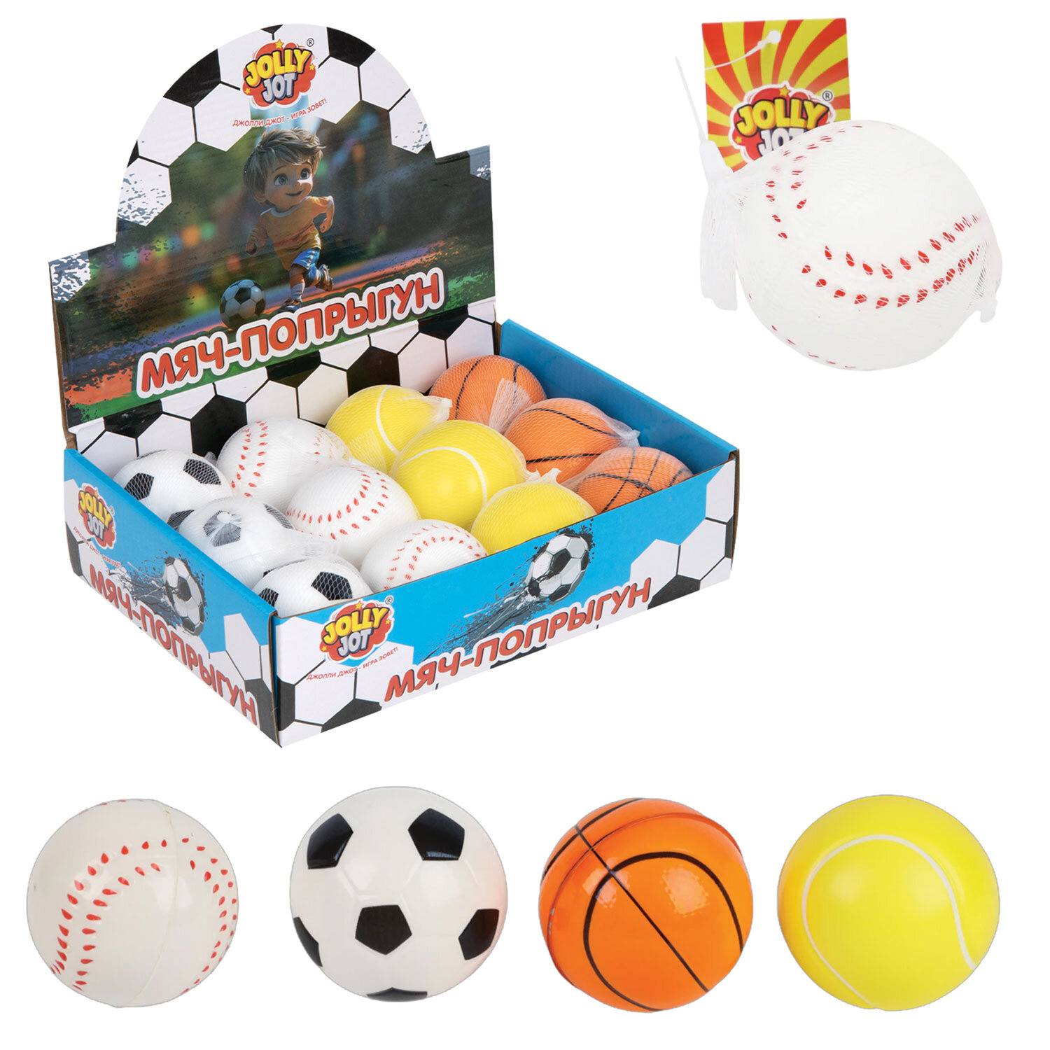 Мяч-попрыгун СПОРТ, 6 см, полиуретан ассорти, 4 вида, JOLLY JOT (ДЖОЛЛИ ДЖОТ) Код товара: 666127 99,45 ₽ Купить Производитель:JOLLY JOT Мяч-попрыгун JOLLY JOT – это действительно универсальное развлечение для детей и домашних питомцев! С таким разнообразием, как футбольные, бейсбольные, баскетбольные и теннисные мячи, каждый найдет себе что-то по душе. Что делает мяч попрыгун особенным? • Мяч-попрыгун JOLLY JOT обладает невероятной прыгучестью, легко отскакивает на высоту до 5 метров, принося массу удовольствия от игры. • Мяч-попрыгун JOLLY JOT – это игрушка-антистресс. Просто сжимайте мяч в руках или подбрасывайте в перерывах между делами. • Мяч-попрыгун JOLLY JOT изготовлен из надёжных полимерных материалов, благодаря которым он долго сохраняет яркость красок и упругость. Мяч-попрыгун JOLLY JOT понравится мальчикам, девочкам и взрослым. Это подарок на 23 февраля и день рождения, на 8 марта и детям в садик. Ассорти – 4 вида.Производство: КитайТип товара: мяч-попрыгунНазначение для: дома, пляжа, улицыДиаметр: 6 смЦвет: ассортиКоличество в комплекте: 1 шт.Материал: полиуретанСерия: спортВозраст: 3+Упаковка: сеткаВес: 0.037 гРазмер упаковки: 6.2 × 6.2 × 6.2 смОбъём: 0.0003 м3Промежуточная упаковка: 12 штТранспортная упаковка: 288 штШтрих-код: 4606224499161 Файлы Сертификат-1.jpg Сертификат-2.jpg Сертификат-3.jpg Сертификат-4.jpg Сертификат-5.jpg Сертификат-6.jpg
