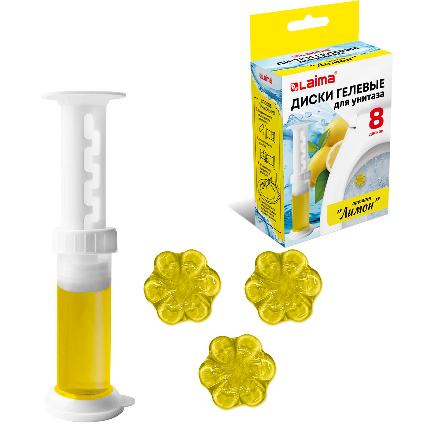Диски гелевые, освежитель и очиститель для унитаза / писсуара, 8 дисков 44 г, LAIMA, "Лимон", шприц