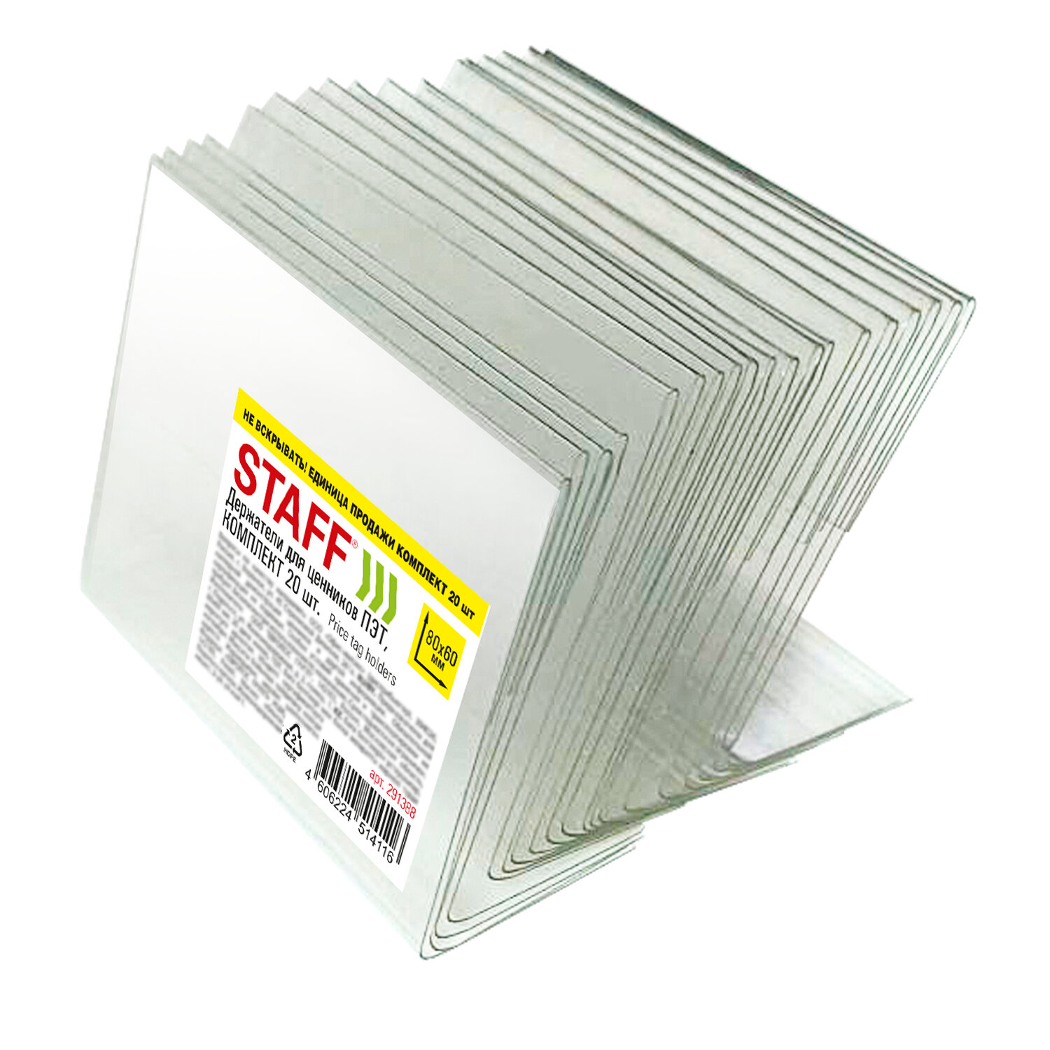 Держатели для ценников 80х60 мм, КОМПЛЕКТ 20 шт., ПЭТ, STAFF Код товара: 291388 326,35 ₽ Купить Производитель:STAFF Держатели для ценников STAFF предназначены для размещения бумажных ценников и рекламной информации. Идеальны для использования в магазинах, заведениях общепита и других учреждениях. Держатели для ценников изготовлены из плотного ПЭТ толщиной 0,5 мм. Данный материал характеризуется особой ударостойкостью, высокой механической прочностью, химической стойкостью и высокой пластичностью в холодном и в нагретом состоянии. Размер: 80х60 мм. Единица продажи: комплект из 20 штук, упакованный в термоусадочную пленку.Производство: РоссияТип товара: ценникодержательРасположение ценника: горизонтальноеКрепление: нетСерия: Price holderКоличество в упаковке: 20 шт.Материал: ПЭТЦвет: прозрачныйВысота: 60 ммШирина: 80 ммТолщина: 0.5 ммВес: 139 грРазмер упаковки: 3.9 × 8.3 × 8.1 смОбъём: 0.0008 м3Промежуточная упаковка: 16 штТранспортная упаковка: 16 штШтрих-код: 4606224514116 Файлы Сертификат-1.jpg Сертификат-2.jpg Сертификат-3.jpg Сертификат-4.jpg Сертификат-5.jpg Сертификат-6.jpg Сертификат-7.jpg Сертификат-8.jpg Сертификат-9.jpg