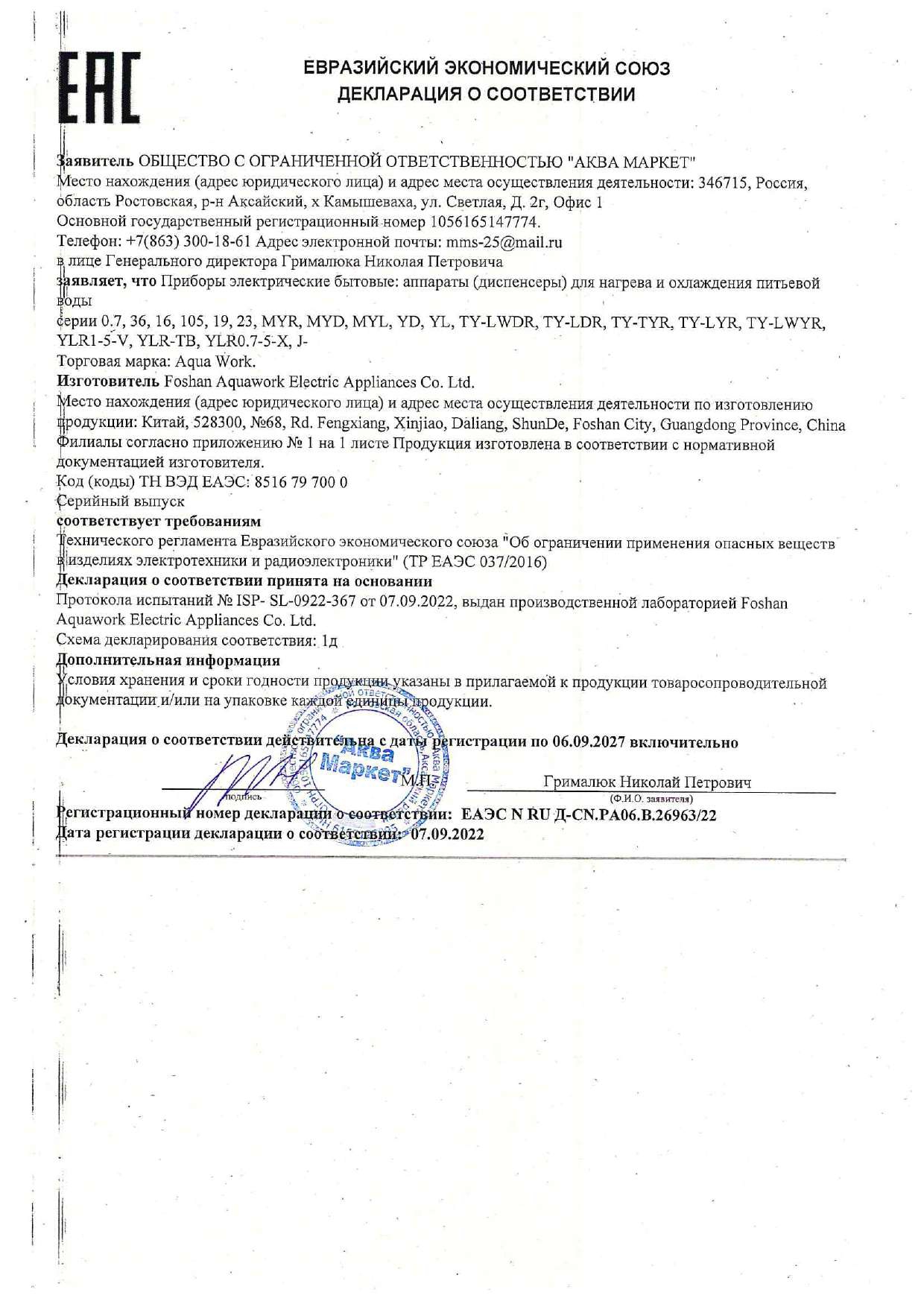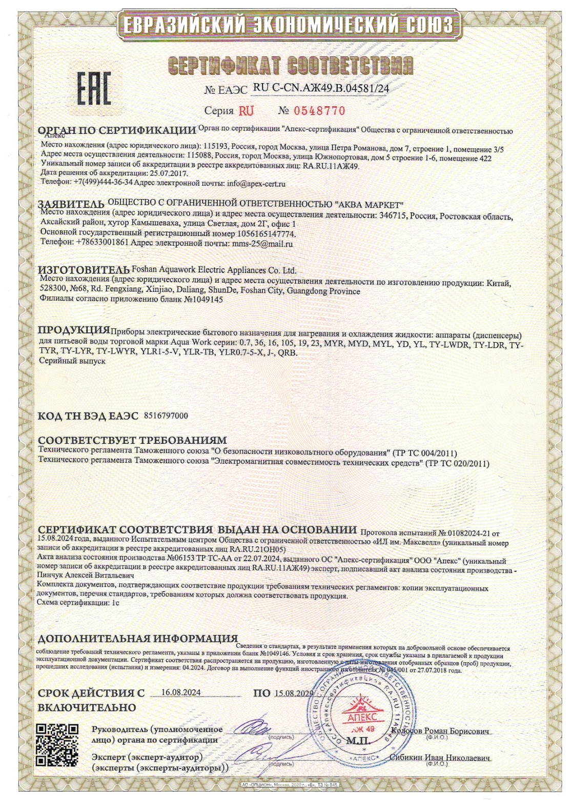 Кулер для воды AQUA WORK 16-LDR, напольный, НАГРЕВ/ЭЛЕКТРОННОЕ ОХЛАЖДЕНИЕ, 2 крана, белый Код товара: 458566 10 672,2 ₽ Купить Производитель:AQUA WORK Кулер для воды AQUA WORK 16-LDR – это проверенное временем и надёжное решение для комфортного доступа к горячей и охлаждённой воде в офисе, дома или общественном пространстве. Модель выполнена в строгом минималистичном дизайне, оснащена двумя кранами (нагрев и охлаждение) и подходит под разные типы стаканодержателей: магнитные и крепящиеся на шурупах. Устройство работает в двух режимах: нагрев воды до 90–96 °C со скоростью не менее 7 литров в час, что идеально подходит для приготовления чая, кофе и других напитков. Электронное охлаждение снижает температуру воды до 12–15 °C, выдавая не менее 1 литра охлаждённой воды в час. Мощность нагрева составляет 700 Вт, охлаждения — 70 Вт, бак нагрева — 1 литр, а установка бутыли производится сверху. Управление осуществляется через push-кран, индикация режимов работы — с помощью светодиодных индикаторов в верхней части корпуса. Корпус изготовлен из прочной стали, что повышает устойчивость и долговечность устройства. Габариты модели — 310х310х960 мм, вес — 7 кг, питание — от сети 220–240 В / 50 Гц. Произведён в России, что гарантирует высокое качество сборки, совместимость с местными условиями эксплуатации и быстрый ремонт в случае необходимости. Простой, но функциональный и практичный — отличный выбор для тех, кто ценит надёжность и экономию. Производитель оставляет за собой право без предварительного уведомления вносить изменения в технические характеристики, комплектацию и конструкцию, не ухудшающие эксплуатационные характеристики изделия.Производство: РоссияТип установки: напольныйТип охлаждения: электронныйПодача воды с нагревом: даПодача воды с охлаждением: даКоличество кранов подачи воды: 2 шт. Серия: LDRРекомендуемое количество пользователей: 7Крепление стаканодержателя: крепление винтами, крепление магнитомРазмещение бутыли с водой: верхняя загрузкаТип крана: нажим кружкойМощность нагрева: 700 ВтМощность охлаждения: 70 ВтПроизводительность нагрева: 7 л/часПроизводительность охлаждения: 1 л/часТемпература нагревания воды: 96 градусТемпература охлаждения воды: 12 градусЕмкость бака для горячей воды: 1 лЕмкость бака для холодной воды: 0.7 лТип нагревательного элемента: ТЭНОбъем холодильника: 0 лОбъем шкафчика: 0 лНапряжение: 220 ВМатериал корпуса: пластик/стальЦвет корпуса: белый/черныйДлина шнура: 1 мВысота: 960 ммШирина: 310 ммГлубина: 310 ммВес: 7 кгРазмер упаковки: 99 × 36.5 × 32.7 смОбъём: 0.1182 м3Промежуточная упаковка: 1 штТранспортная упаковка: 1 штШтрих-код: 4607157584412 Файлы Приложение-1.pdf Сертификат-1.jpg Сертификат-2.jpg Сертификат-3.jpg Сертификат-4.jpg Сертификат-5.jpg Сертификат-6.jpg Сертификат-7.jpg