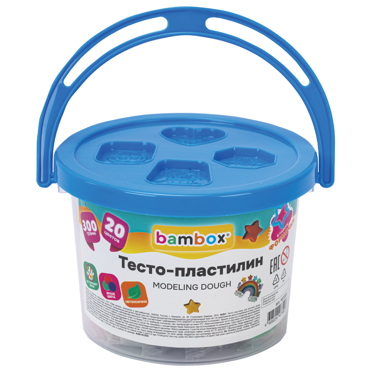 Тесто-пластилин для лепки СУПЕР ПЛАСТИЧНОЕ, 20 цветов 300 г, в пластиковом ведерке, формочки, BAMBOX (БАМБОКС) Код товара: 107251 269,88 ₽ Купить Производитель:BAMBOX Тесто-пластилин BAMBOX развивает и тренирует мелкую моторику рук ребенка, положительно влияет на его эмоциональное состояние. Тесто-пластилин BAMBOX – это пластилин на растительной основе с мягкой текстурой и безопасным составом. В набор входят 20 брусочков теста для лепки, 20 ярких цветов: красный, синий, желтый, зеленый, травянисто-зеленый, персиковый, оранжевый, коричневый, белый, черный, фиолетовый, серый, голубой, темно-синий, светло-розовый, розовый, темно-фиолетовый; 3 неоновых цвета: неоновый красный, неоновый желтый, неоновый салатовый. Цвета можно смешивать между собой и получать новые оттенки. Пластилин легко разминается, не липнет к рукам. Лучший вариант для тех, кто только учится лепить из пластилина. На открытом воздухе затвердевает через 24 часа. Каждый цвет упакован в индивидуальный пакетик, который не позволяет тесту высыхать, а также в набор входит 10 формочек для лепки. Тесто и формочки хранятся в пластиковом ведерке, которое удобно брать с собой. Благодаря натуральной рецептуре тесто безопасно для детей.Производство: КитайКоличество цветов в наборе: 20 шт.Тип: на растительной основе (тесто)Эффекты: неонНаличие аксессуара: формочкиМасса: 300 гМасса бруска: 15 гКоличество брусков в наборе: 20 шт.Серия: DoughВид упаковки: пластиковое ведерко с термоусадкойСрок годности: 48 месВес: 448 грРазмер упаковки: 9.4 × 14.1 × 13.5 смОбъём: 0.0023 м3Промежуточная упаковка: 12 штТранспортная упаковка: 24 штШтрих-код: 4606224477497 Файлы Сертификат-1.jpg Сертификат-2.jpg Сертификат-3.jpg Сертификат-4.jpg Сертификат-5.jpg Сертификат-6.jpg