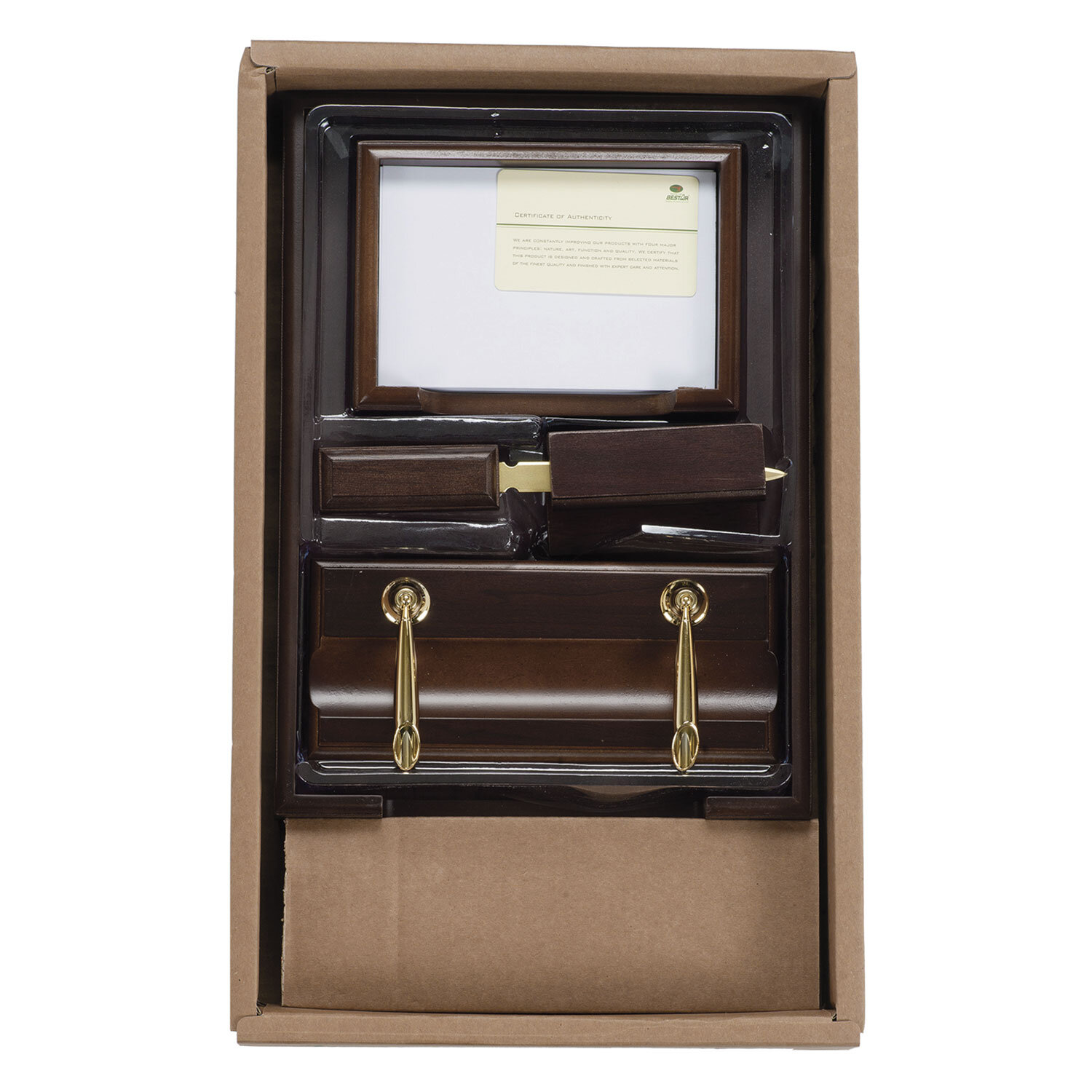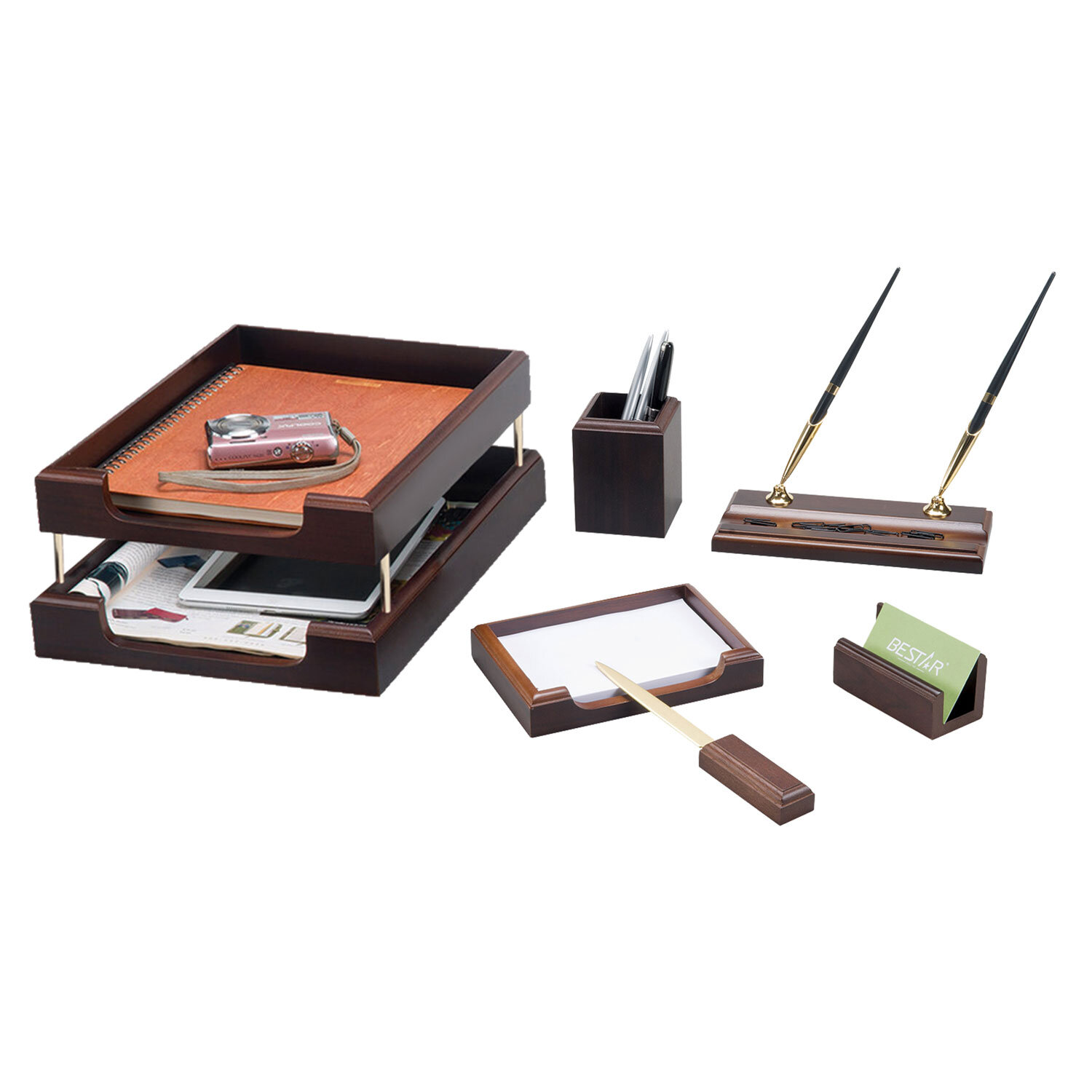 Набор подарочный настольный BESTAR "Apollon" из дерева, 6 предметов, цвет "орех" Код товара: 236352 12 827,87 ₽ Купить Производитель:BESTAR Настольный набор от BESTAR «Apollon» содержит оптимальный комплект принадлежностей, необходимых для работы с документами сотруднику на руководящей должности. Презентабельный вид аксессуаров подчеркивает высокий статус владельца. Набор состоит из 6 универсальных предметов: - двойной лоток (для бумаг формата А4); - подставка для ручек (2 шариковые ручки в комплекте); - стакан-подставка для письменных принадлежностей и канцелярских мелочей; - нож для вскрытия конвертов; - подставка под листы для записей (листы в комплекте); - подставка под визитки. Для изготовления набора использованы дерево в цвете "орех" и металл. Выдержан в лаконичном цвете. Набор упакован в подарочную коробку, а также дополнительно в защитный гофрокорб для транспортировки. Представленный набор относится к премиальному ценовому сегменту.Производство: Тайвань (Китай)Серия: ApollonЦвет: орехово-коричневыйКоличество предметов: 6 шт.Тип лотка: двойнойМатериал: МДФСрок годности: 60 месВес: 2,54 кгРазмер упаковки: 13.1 × 47.4 × 29 смОбъём: 0.0204 м3Промежуточная упаковка: 4 штТранспортная упаковка: 4 штШтрих-код: 4710899162593 Файлы Сертификат-1.jpg Сертификат-2.jpg Сертификат-3.jpg Сертификат-4.jpg Сертификат-5.jpg Сертификат-6.jpg Сертификат-7.jpg Сертификат-8.jpg Сертификат-9.jpg Сертификат-10.jpg Сертификат-11.jpg Сертификат-12.jpg Сертификат-13.jpg Сертификат-14.jpg Сертификат-15.jpg Сертификат-16.jpg Сертификат-17.jpg Сертификат-18.jpg Сертификат-19.jpg Сертификат-20.jpg Сертификат-21.jpg Сертификат-22.jpg Сертификат-23.jpg Сертификат-24.jpg Сертификат-25.jpg Сертификат-26.jpg