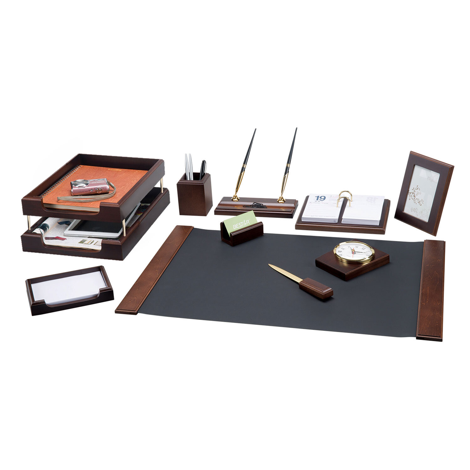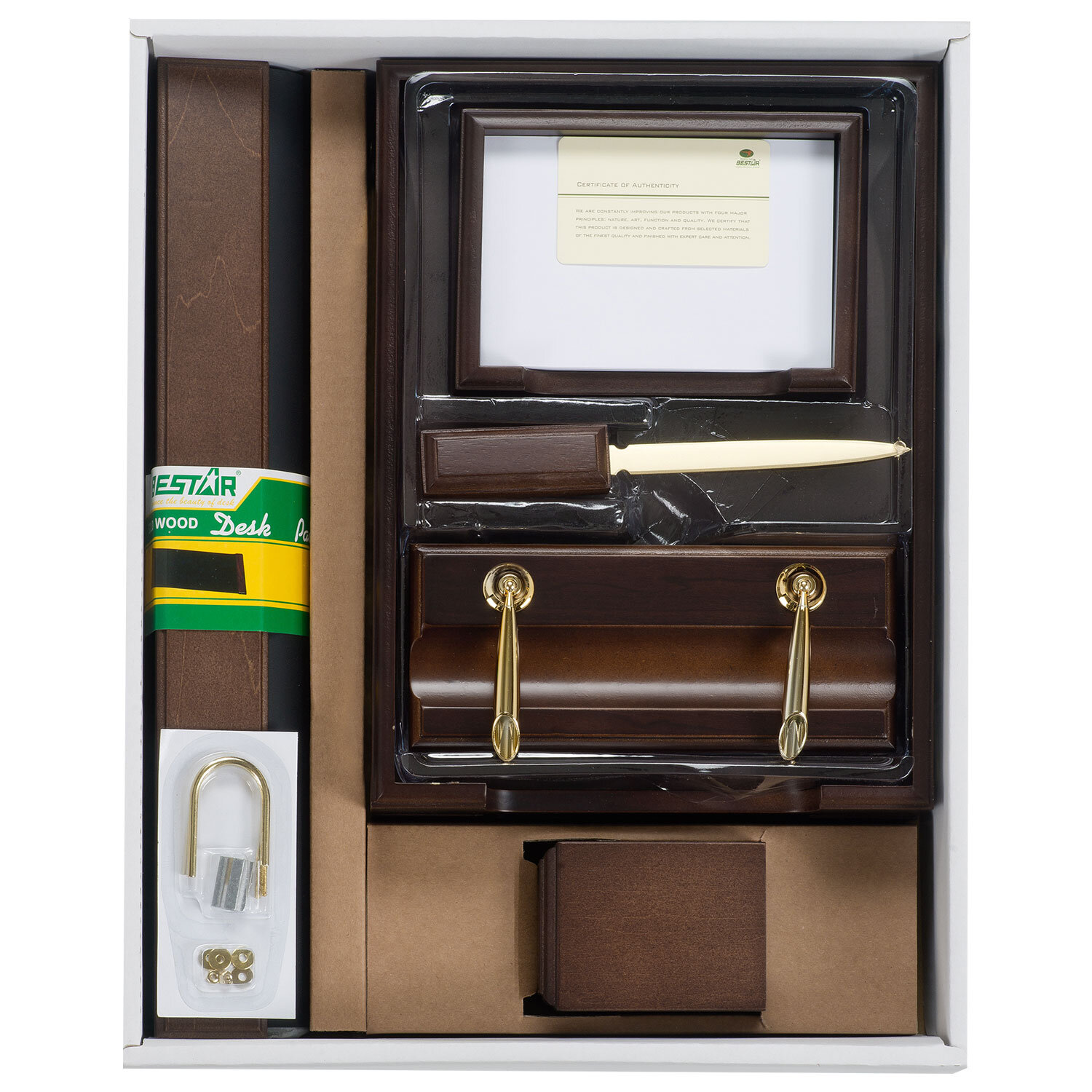 Набор подарочный настольный BESTAR "Artemis" из дерева, 10 предметов, цвет "орех" Код товара: 236357 19 124,19 ₽ Купить Производитель:BESTAR Настольный набор премиум-класса BESTAR "Artemis" - оригинальный подарок, отличающийся утонченным стилем и совершенством деталей. Набор состоит из 10 универсальных предметов: - коврик для письма (размер – 60х42 см) - двойной лоток (для бумаг формата А4); - подставка для ручек (2 шариковые ручки в комплекте); - стакан-подставка для письменных принадлежностей и канцелярских мелочей; - рамка для фото; - часы; - нож для вскрытия конвертов; - подставка под листы для записей (листы в комплекте); - подставка под визитки; - подставка для перекидного календаря. Все предметы изготовлены из дерева цвета "орех" с золотистой фурнитурой. Набор упакован в подарочную коробку, а также дополнительно в защитный гофрокорб для транспортировки. Представленный комплект относится к премиальному ценовому сегменту.Производство: Тайвань (Китай)Серия: ArtemisЦвет: орехово-коричневыйКоличество предметов: 10 шт.Тип лотка: двойнойЧасы: даФоторамка: даМатериал: МДФФирменная подарочная коробка: даСрок годности: 60 месВес: 4,5 кгРазмер упаковки: 12.5 × 50.4 × 38.5 смОбъём: 0.0279 м3Промежуточная упаковка: 4 штТранспортная упаковка: 4 штШтрих-код: 4710899102599 Сертификат-1.jpg Сертификат-2.jpg