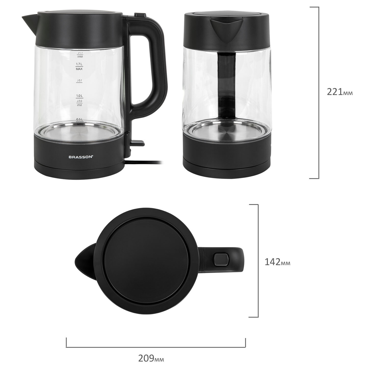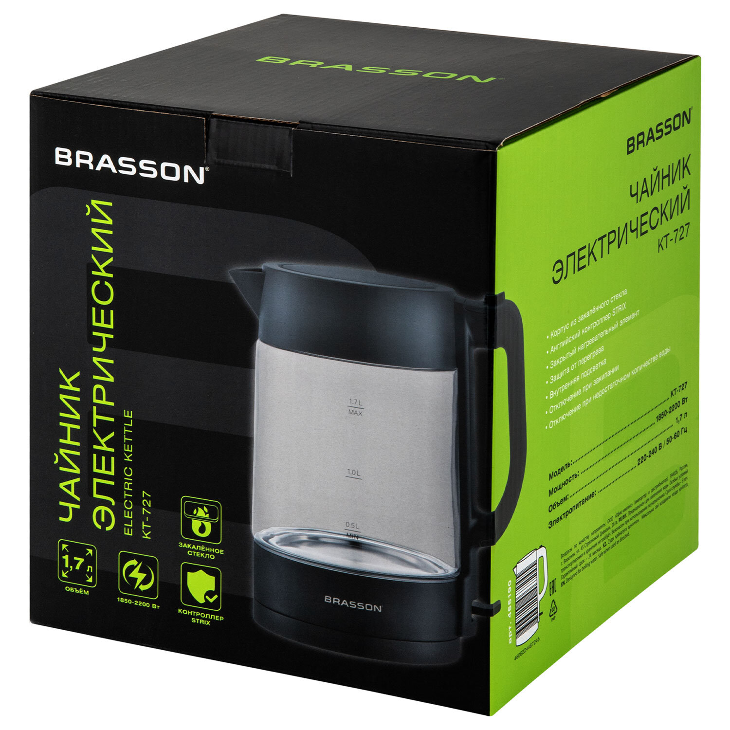 Чайник BRASSON (БРАССОН) KT-727, 1,7 л, 2200 Вт, стекло, графит, подсветка Код товара: 455190 2 077,83 ₽ Купить Производитель:BRASSON Электрический чайник BRASSON KT-727 превратит рутинное кипячение воды в приятный и безопасный процесс. Современный дизайн и отличная функциональность делают его незаменимым помощником на каждой кухне. Мощность прибора составляет 2200 Вт, что позволит воде закипеть за считаные минуты. На ручке чайника находится кнопка открывания, что делает удобнее его эксплуатацию. Корпус изготовлен из термостойкого стекла. Скрытый нагревательный элемент увеличит срок службы. Индикатор уровня воды позволит с легкостью определить количество воды в чайнике. LED-подсветка проинформирует о том, что он включен, и процесс нагрева воды запущен. Шнур, при необходимости, можно спрятать в специальный отсек, расположенный в подставке. Контактная группа STRIX обеспечивает защиту от перегрева. Устройство работает стабильно благодаря контроллеру, рассчитанному на длительный срок службы. Чайник автоматически отключается при закипании, имеет защиту от перегрева и включения без воды. В носике расположен съёмный фильтр от накипи, который легко извлечь и очистить.Производство: КитайОбъем: 1.7 лМощность: 2200 ВтМатериал корпуса: пластик, термостойкое стеклоВид нагревательного элемента: закрытыйАвтоотключение при закипании: даСерия: KTОтключение при отсутствии воды: даИндикация уровня воды: даВращение на 360°: даПодсветка: даФильтр от накипи: даДлина шнура: 0.75 мЦвет корпуса: графитовыйШирина: 142 ммВысота: 221 ммГлубина: 209 ммВес (без упаковки): 0.93 кгВес: 1,44 кгРазмер упаковки: 21.5 × 24.4 × 21.7 смОбъём: 0.0138 м3Промежуточная упаковка: 4 штТранспортная упаковка: 4 штШтрих-код: 4606224467245 Файлы Сертификат-1.jpg Сертификат-2.jpg Сертификат-3.jpg Сертификат-4.jpg Сертификат-5.jpg Сертификат-6.jpg Сертификат-7.jpg