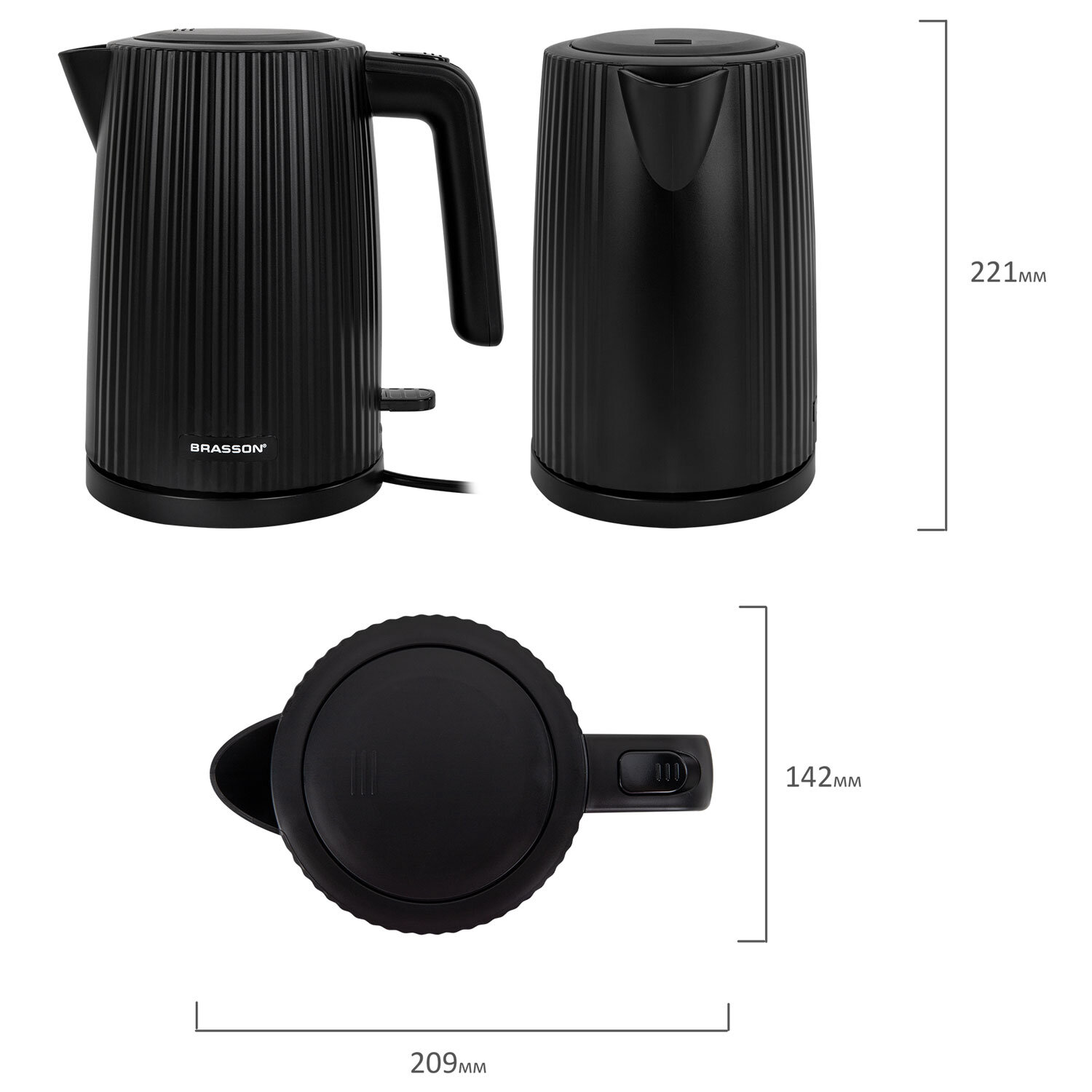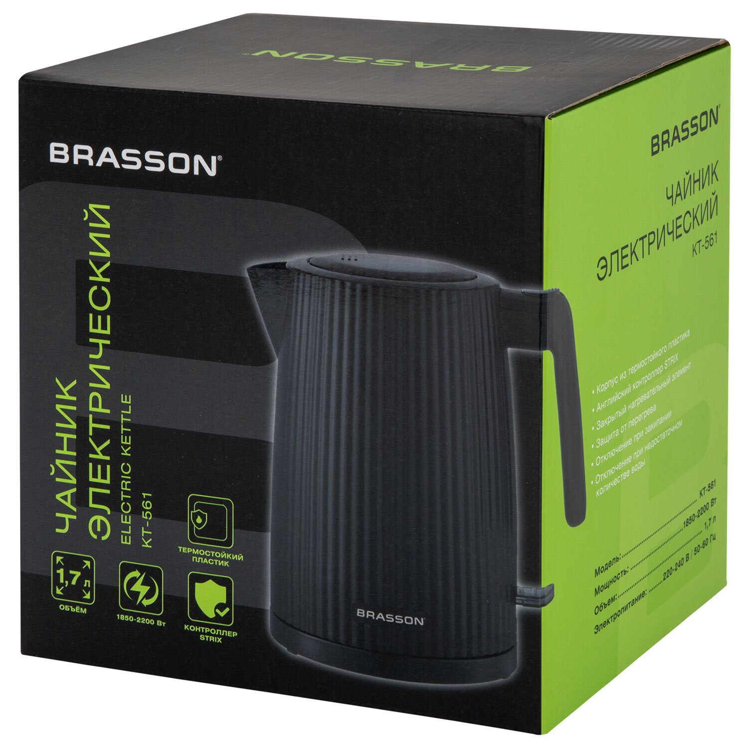 Чайник BRASSON (БРАССОН) KT-561, 1,7 л, 2200 Вт, пластик, подсветка, индикатор уровня воды, черный Код товара: 455191 1 603,34 ₽ Купить Производитель:BRASSON Электрический чайник BRASSON KT-561 превратит рутинное кипячение воды в приятный и безопасный процесс. Современный дизайн и отличная функциональность делают его незаменимым помощником на каждой кухне. Чайник BRASSON KT-561 – это надёжный и функциональный помощник на вашей кухне. Стильный рифленый корпус идеально впишется в любой интерьер, а высококачественный термостойкий пластик обеспечивает долговечность и безопасность использования. Мощность чайника составляет 2200 Вт, что позволяет вскипятить воду всего за несколько минут. Объёма 1,7 л достаточно для приготовления кофе или других напитков на 6-7 человек за один раз. Он подойдёт как для большой семьи, так и для офиса. Индикация включения и индикатор уровня воды делают использование чайника ещё более удобным. Контактная группа STRIX обеспечивает защиту от перегрева. Устройство работает стабильно благодаря контроллеру, рассчитанному на длительный срок службы. Чайник автоматически отключается при закипании, имеет защиту от перегрева и включения без воды. В носике расположен съёмный фильтр от накипи, который легко извлечь и очистить.Производство: КитайОбъем: 1.7 лМощность: 2200 ВтМатериал корпуса: пластикВид нагревательного элемента: закрытыйАвтоотключение при закипании: даСерия: KTОтключение при отсутствии воды: даИндикатор включения: даИндикация уровня воды: даВращение на 360°: даФильтр от накипи: даДлина шнура: 0.75 мЦвет корпуса: черныйШирина: 142 ммВысота: 221 ммГлубина: 209 ммВес (без упаковки): 0.93 кгВес: 1 кгРазмер упаковки: 17.5 × 22.2 × 21.5 смОбъём: 0.0095 м3Промежуточная упаковка: 12 штТранспортная упаковка: 12 штШтрих-код: 4606224467252 Файлы Сертификат-1.jpg Сертификат-2.jpg Сертификат-3.jpg Сертификат-4.jpg Сертификат-5.jpg Сертификат-6.jpg Сертификат-7.jpg