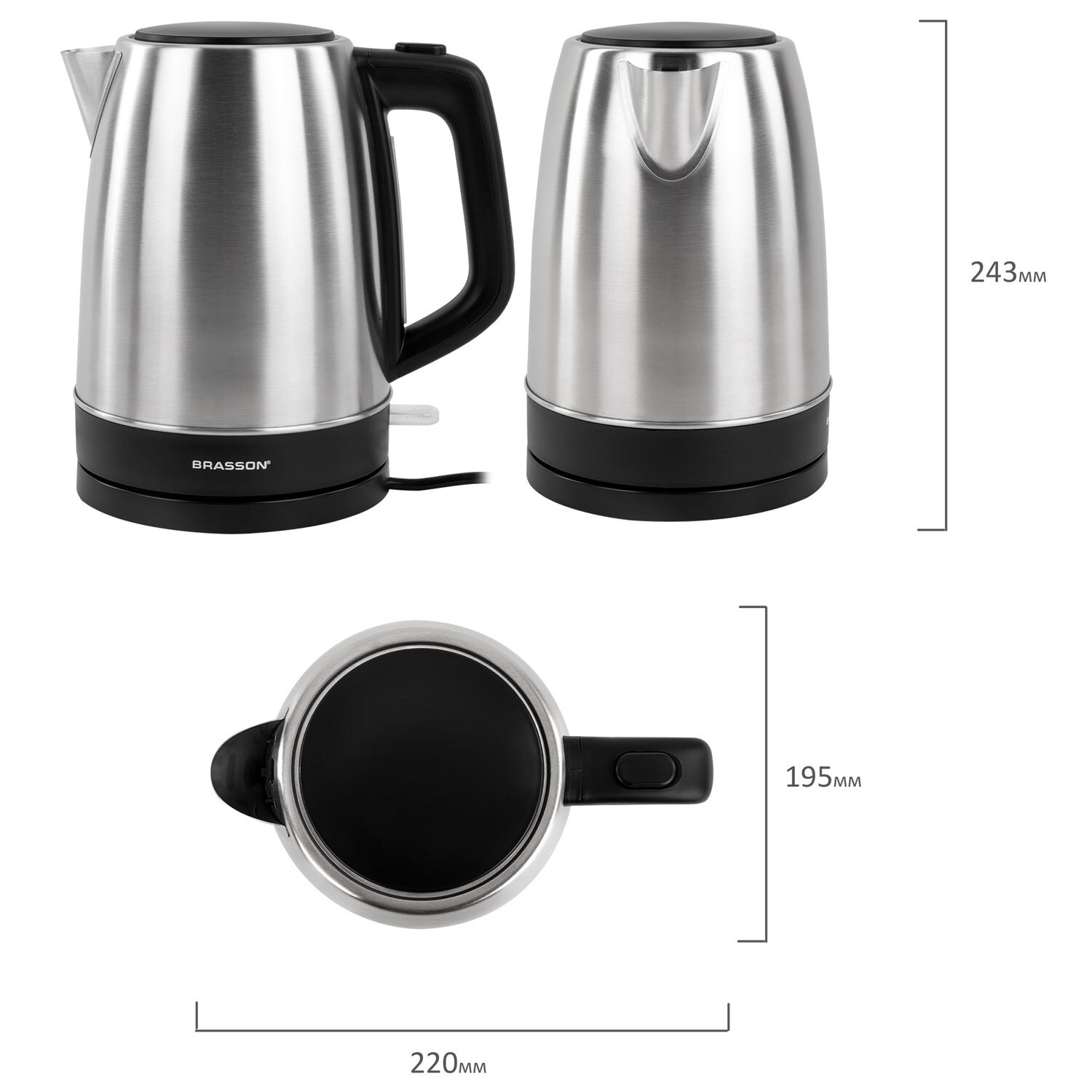 Чайник BRASSON (БРАССОН) KT-040, 1,7 л, 2200 Вт, индикатор уровня воды, сталь, черный Код товара: 455192 1 885,2 ₽ Купить Производитель:BRASSON Электрический чайник BRASSON KT-040 превратит рутинное кипячение воды в приятный и безопасный процесс. Современный дизайн и отличная функциональность делают его незаменимым помощником на каждой кухне. Чайник BRASSON KT-040 – это надёжный и функциональный помощник на вашей кухне. Стильный корпус идеально впишется в любой интерьер, а высококачественная нержавеющая сталь обеспечивает долговечность и безопасность использования. Мощность чайника составляет 2200 Вт, что позволяет вскипятить воду всего за несколько минут. Объёма 1,7 л достаточно для приготовления кофе или других напитков на 6-7 человек за один раз. Он подойдёт как для большой семьи, так и для офиса. Индикация включения и индикатор уровня воды делают использование чайника ещё более удобным. Контроллер STRIX обеспечивает надежность и безопасность устройства. Благодаря такому контроллеру чайник автоматически отключается при закипании, имеет защиту от перегрева и включения без воды. В носике расположен съёмный фильтр от накипи, который легко извлечь и очистить.Производство: КитайОбъем: 1.7 лМощность: 2200 ВтМатериал корпуса: нержавеющая стальВид нагревательного элемента: закрытыйАвтоотключение при закипании: даСерия: KTОтключение при отсутствии воды: даИндикатор включения: даИндикация уровня воды: даВращение на 360°: даФильтр от накипи: даДлина шнура: 0.75 мЦвет корпуса: стальнойШирина: 195 ммВысота: 243 ммГлубина: 220 ммВес (без упаковки): 0.93 кгВес: 1,07 кгРазмер упаковки: 17.6 × 21.6 × 19.8 смОбъём: 0.0092 м3Промежуточная упаковка: 6 штТранспортная упаковка: 6 штШтрих-код: 4606224467269 Файлы Сертификат-1.jpg Сертификат-2.jpg Сертификат-3.jpg Сертификат-4.jpg Сертификат-5.jpg Сертификат-6.jpg Сертификат-7.jpg
