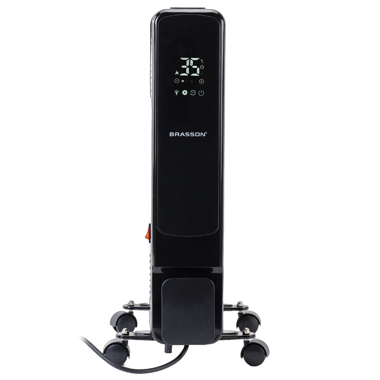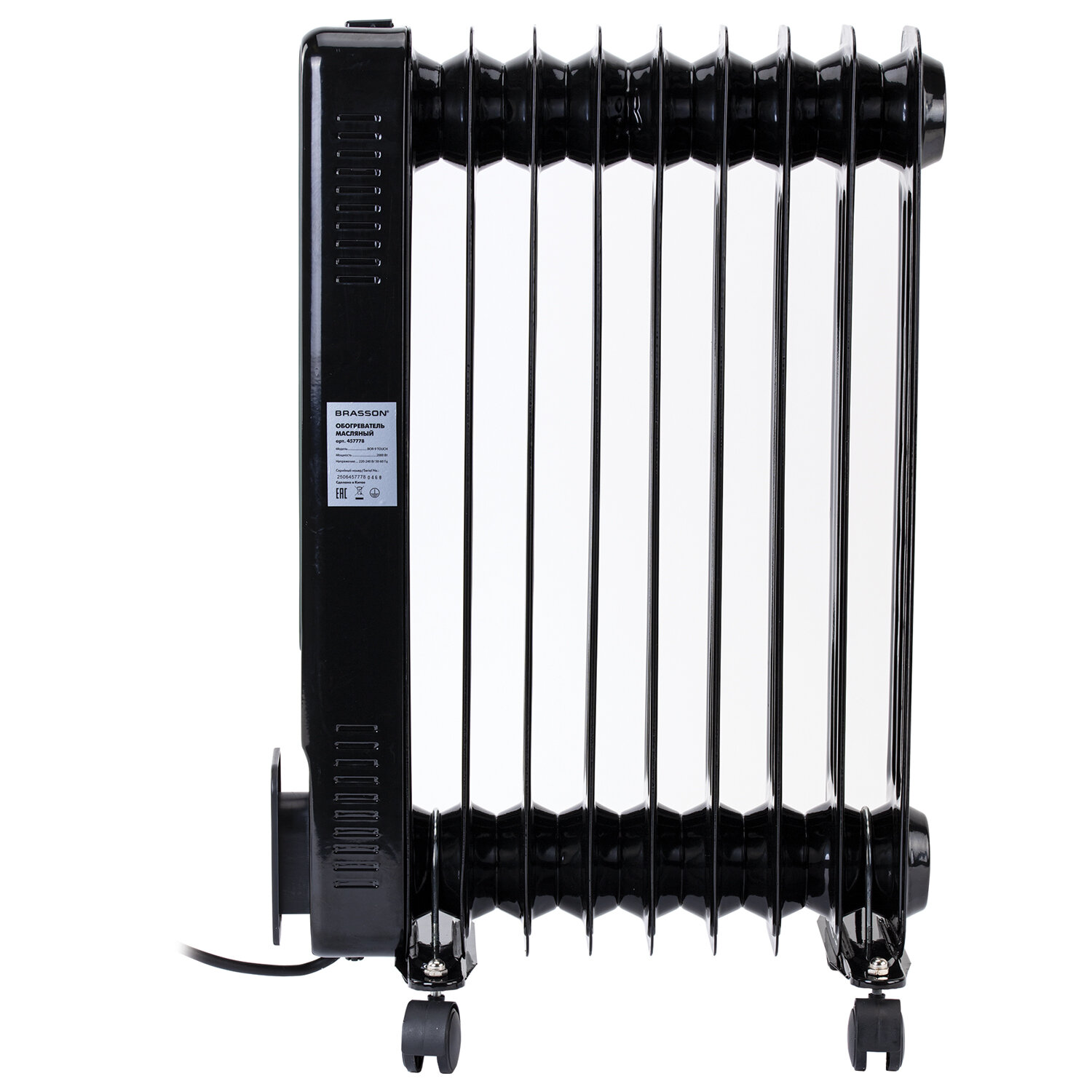 Обогреватель масляный BRASSON (БРАССОН) BOR-7 TOUCH, 7 секций, 1500 Вт, 3 режима, сенсор, пульт ДУ, черный Код товара: 457777 6 275,22 ₽ Купить Производитель:BRASSON Масляный обогреватель BRASSON BOR-7 TOUCH – комфорт и тепло в каждом уголке Вашего дома. Модель BOR-7 TOUCH – стильный и современный обогреватель мощностью 1500 Вт, способный обеспечить быстрый и эффективный обогрев помещения площадью до 15 м2. Сенсорная панель управления позволяет легко настроить работу обогревателя, а с помощью пульта дистанционного управления Вы сможете контролировать работу устройства из любой точки помещения. Обогреватель безопасен в эксплуатации, обладает функцией защиты от перегрева и опрокидывания. Модель BOR-7 TOUCH оборудована встроенным термостатом, а также функцией защиты от детей, за счет чего предотвращается случайное изменение настроек устройства. Для создания комфортных условий в помещении Вы можете выбрать один из трех режимов работы обогревателя: ECO – экологичный энергосберегающий режим, Comfort – комфортный режим, при котором обогреватель работает на максимальной мощности, обеспечивая быстрый нагрев помещения, Antifrost – режим защиты от замерзания. Обогреватель можно свободно перемещать по помещению, так как он оснащен ножками на колесах, также предусмотрено место для хранения шнура. Благодаря современному минималистичному дизайну обогреватель органично впишется как в офисный, так и в домашний интерьер.Производство: КитайМощность: 1500 ВтКоличество секций: 7 шт.Рекомендованная площадь обогрева: 15 м2Тип управления: сенсорноеТермостат (терморегулятор): даИндикация: даСерия: BORДисплей: даПульт ДУ: даОтключение при перегреве: даТаймер: даНожки-колесики в комплекте: даМесто для хранения шнура: даДлина шнура: 1.5 мВысота товара: 590 ммШирина товара: 240 ммГлубина товара: 335 ммЦвет: черныйВес (без упаковки): 7 кгВес: 7,14 кгРазмер упаковки: 63.1 × 37.2 × 13.7 смОбъём: 0.0322 м3Промежуточная упаковка: 1 штТранспортная упаковка: 1 штШтрих-код: 4606224486437 Файлы Приложение-1.pdf Сертификат-1.jpg Сертификат-2.jpg Сертификат-3.jpg Сертификат-4.jpg Сертификат-5.jpg Сертификат-6.jpg Сертификат-7.jpg Сертификат-8.jpg Сертификат-9.jpg Сертификат-10.jpg Сертификат-11.jpg Сертификат-12.jpg
