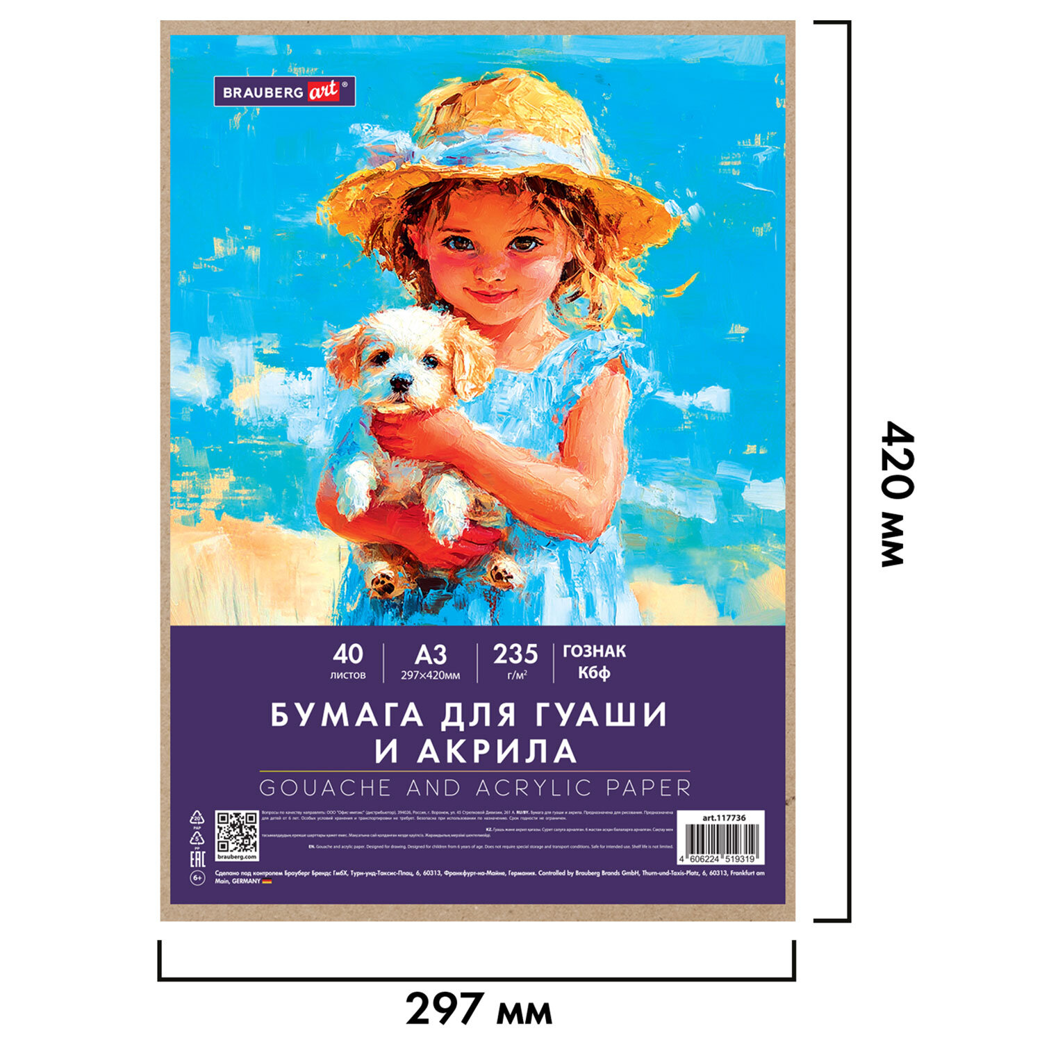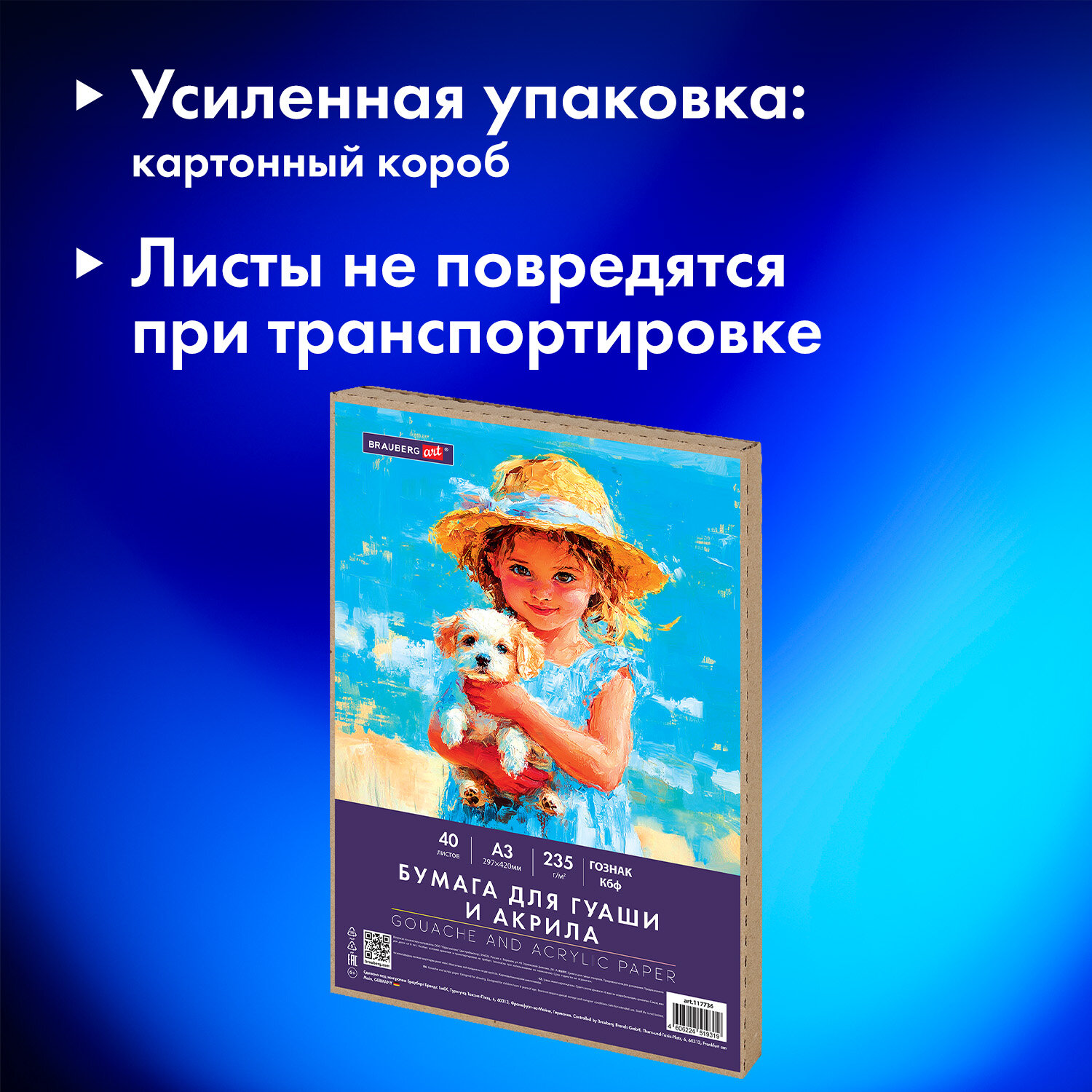 Бумага для гуаши и акрила А3 40 л., 235 г/м2, в коробке, BRAUBERG ART CLASSIC, "Девочка с собачкой" Код товара: 117736 547,25 ₽ Купить Производитель:BRAUBERG ART Бумага для гуаши и акрила BRAUBERG ART "CLASSIC" предназначена для рисования водорастворимыми красками (гуашь, акрил, акварель), а также подойдет для рисования карандашами, тушью, ручками и фломастерами. Подходит для профессионального занятия живописью. Рекомендована преподавателями художественных школ. Качественные листы высокой плотности 235 г/м2 устойчивы к истиранию, воздействию влаги, обеспечивают чистую, реалистичную передачу цвета. Текстура бумаги подходит для разных техник рисования, позволяя краскам ложиться на лист ровно и ярко. Бумага упакована в короб из микрогофрокартона, что позволяет сохранить товар в привлекательном виде при транспортировке. Коробка содержит 40 листов формата А3 (297х420 мм). Белизна 100%.Производство: РоссияФормат: А3Серия: ClassicПлотность внутреннего блока: 235 г/м2Тип товара: бумага для гуаши и акрила в коробкеКоличество листов: 40Внутренний блок: бумага для гуаши и акрилаШирина: 297 ммДлина: 420 ммТекстура: нетЦвет внутреннего блока: белыйБелизна 100%: даБез кислот: даОбложка: плотный картонТип скрепления: папкаДизайн обложки: Девочка с собачкойКоличество дизайнов в упаковке: 1 шт.Индивидуальная упаковка: даВес: 1,36 кгРазмер упаковки: 1.7 × 43.5 × 30.5 смОбъём: 0.0028 м3Промежуточная упаковка: 5 штТранспортная упаковка: 5 штШтрих-код: 4606224519319 Сертификат-1.jpg Сертификат-2.jpg Сертификат-3.jpg