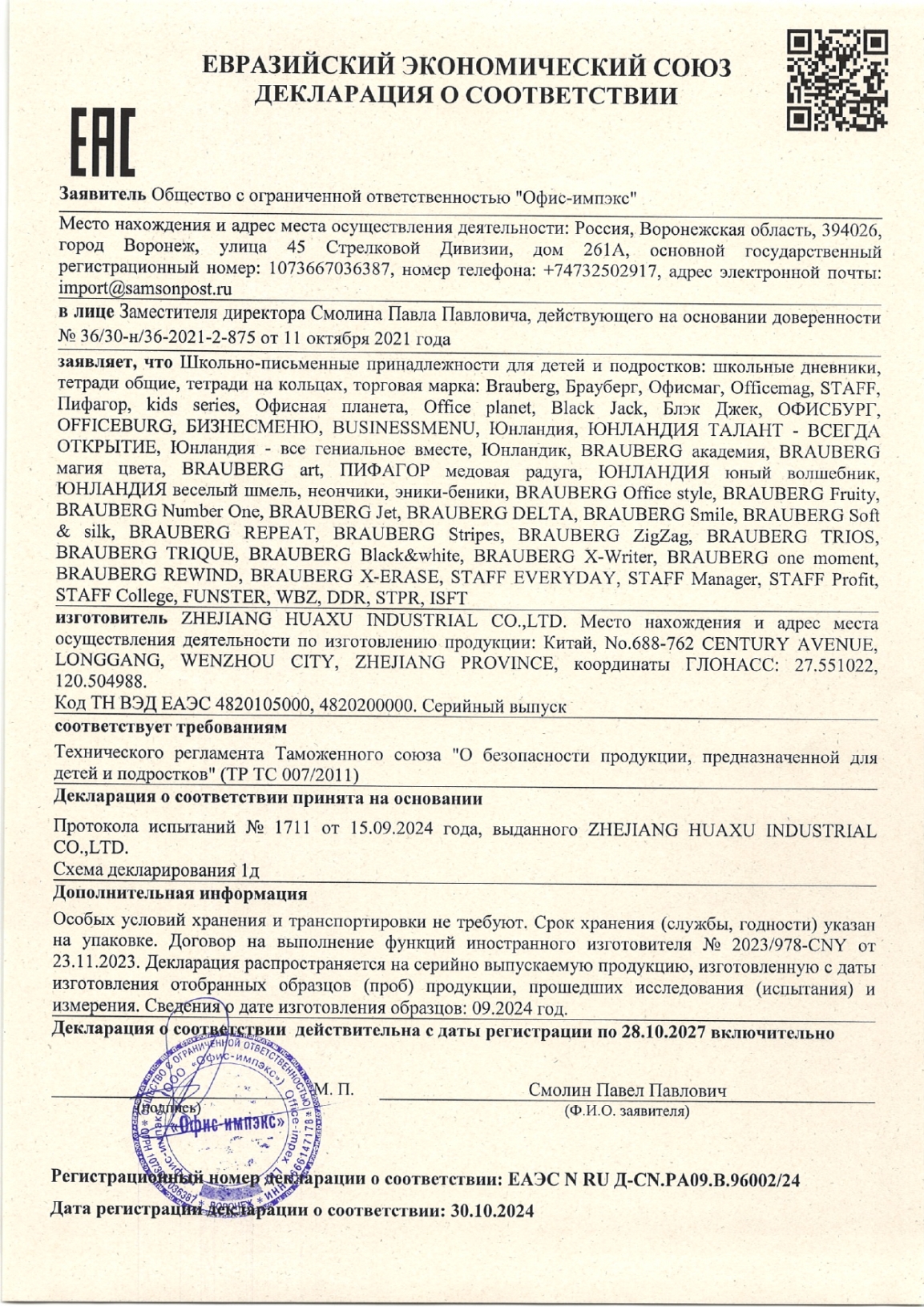 Дневник 1-11 класс 48 л., твердый, BRAUBERG, матовая ламинация, резинка, закладка-ляссе, с подсказом, "Гусь" Код товара: 107237 189,08 ₽ Купить Производитель:BRAUBERG Школьный дневник BRAUBERG выполняет функции журнала регистрации оценок и домашних заданий, полученных на уроках, замечаний по поведению и прилежанию, а также служит средством общения для учителей и родителей. Предназначен для учащихся 1-11 классов. Твердая обложка с матовой ламинацией надежно защищает бумагу и сохраняет привлекательный внешний вид. Благодаря резинке-фиксатору дневник не раскроется в портфеле и листы не помнутся. Дневник снабжен закладкой-ляссе. Внутренний блок содержит 48 листов офсетной белой бумаги плотностью 60 г/м2. Дневник снабжен полезным справочным материалом для учащихся.Производство: КитайТип изделия: дневник твердый с резинкойТип обложки: твердый книжный переплетТип спецэффектов на обложке: матовая ламинацияОсновной цвет обложки: с дизайномПол ребенка: универсальныйВнутренний блок: офсетСерия: PrintДизайн: ГусьПлотность внутренного блока: 60 г/м2Цвет внутреннего блока: белыйСправочный материал: даЗакладка-ляссе: даТип застежки: нетИндивидуальная упаковка: даВес: 215 грРазмер упаковки: 1 × 21.6 × 17.2 смОбъём: 0.0004 м3Промежуточная упаковка: 36 штТранспортная упаковка: 36 штШтрих-код: 4606224477343 Сертификат-1.jpg Сертификат-2.jpg Сертификат-3.jpg