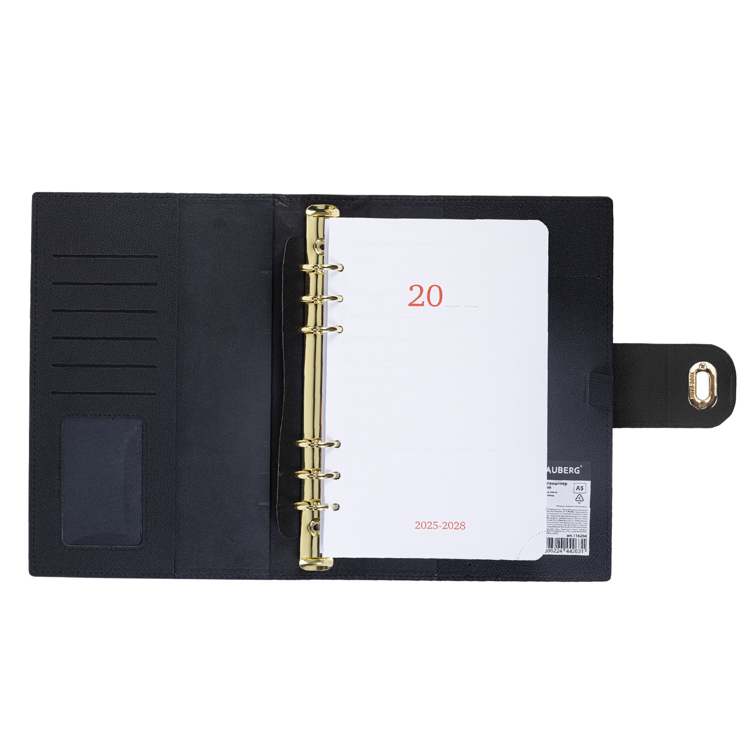 Ежедневник-органайзер недатированный B5, 167х240 мм, BRAUBERG "Nova", под кожу, 160 л., черный Код товара: 116204 731,98 ₽ Купить Производитель:BRAUBERG Недатированный ежедневник-органайзер BRAUBERG "Nova" выполнен в оригинальном стиле. Сочетает в себе удобство ежедневника и функциональность органайзера. Твердая обложка с кольцевым механизмом оснащена дополнительными карманами для хранения бумаг, карточек и мелочей. Съемный внутренний блок включает 160 листов белой бумаги плотностью 70 г/м2. Благодаря формату B5 (167х240мм) ежедневник удобно использовать как в офисе, так и на выездных деловых встречах. Ежедневник снабжен стильной застежкой с поворотным механизмом, благодаря чему он не откроется в сумочке или портфеле, и листы не помнутся. Дополнением является держатель для ручки, что позволяет держать при себе все самое необходимое. Ежедневник содержит обширный справочный материал, а также 7 страниц для записей и заметок. Уголки – закругленные.Производство: КитайТип ежедневника: недатированныйФормат: В5Обложка: под кожуВид обложки: твердаяКоличество листов: 160 шт.Особенности: перфорация уголков, скругленные углы, справочная информация, фиксатор для ручкиСерия: NovaТип застежки: ремешок и застёжкаОсновной цвет обложки: черныйДополнительный цвет обложки: нетЦвет среза: нетЦвет внутреннего блока: белыйПлотность внутреннего блока: 70 г/м2Высота строки для записи: 5 ммТип крепления: кольцевой механизмПечать блока: 2 краскиПодходит для блинтового тиснения: даПодходит для тиснения фольгой: даДлина: 240 ммШирина: 167 ммТолщина: 25 ммВес: 637 грРазмер упаковки: 3.9 × 24.1 × 18.3 смОбъём: 0.0021 м3Промежуточная упаковка: 20 штТранспортная упаковка: 20 штШтрих-код: 4606224442631 Файлы Сертификат-1.jpg Сертификат-2.jpg Сертификат-3.jpg Сертификат-4.jpg Сертификат-5.jpg Сертификат-6.jpg Сертификат-7.jpg Сертификат-8.jpg Сертификат-9.jpg Сертификат-10.jpg Сертификат-11.jpg Сертификат-12.jpg Сертификат-13.jpg Сертификат-14.jpg Сертификат-15.jpg Сертификат-16.jpg Сертификат-17.jpg Сертификат-18.jpg Сертификат-19.jpg Сертификат-20.jpg Сертификат-21.jpg Сертификат-22.jpg Сертификат-23.jpg Сертификат-24.jpg Сертификат-25.jpg Сертификат-26.jpg