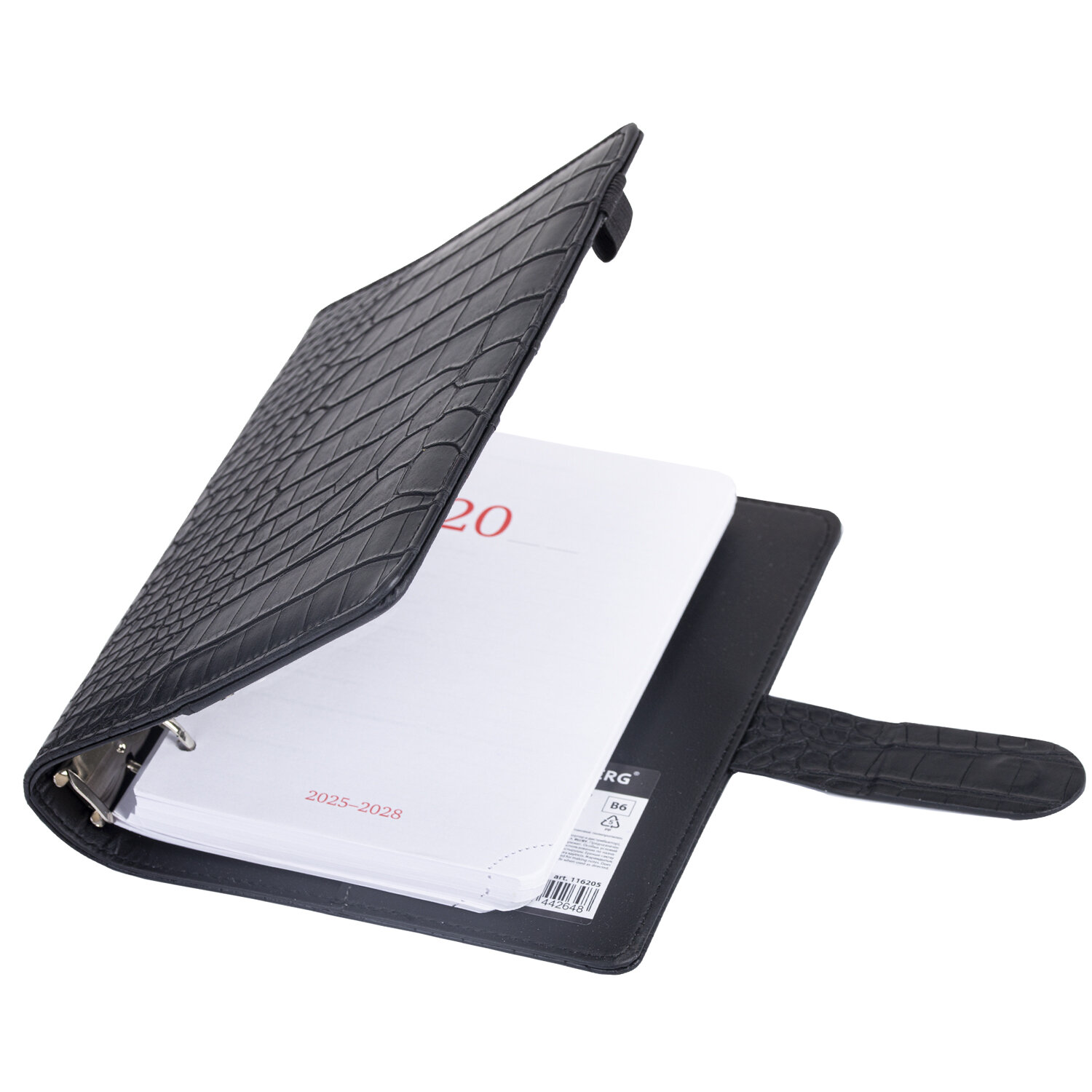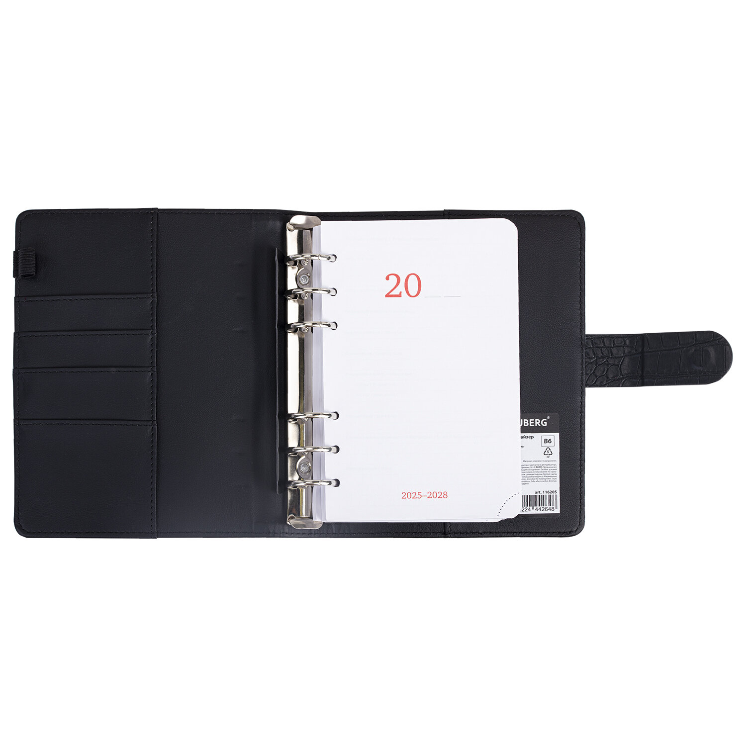 Ежедневник-органайзер недатированный B6 150x190 мм BRAUBERG "Comodo", под кожу, 160 л., черный Код товара: 116205 687,07 ₽ Купить Производитель:BRAUBERG Недатированный ежедневник-органайзер BRAUBERG "Comodo" выполнен в оригинальном стиле. Сочетает в себе удобство ежедневника и функциональность органайзера. Твердая обложка с кольцевым механизмом оснащена дополнительными карманами для хранения бумаг, карточек и мелочей. Съемный внутренний блок включает 160 листов белой бумаги плотностью 70 г/м2. Благодаря формату B6+ (150x190 мм) ежедневник удобно использовать как в офисе, так и на выездных деловых встречах. Ежедневник снабжен стильной магнитной застежкой, благодаря чему он не откроется в сумочке или портфеле, и листы не помнутся. Дополнением является держатель для ручки, что позволяет держать при себе все самое необходимое. Ежедневник содержит обширный справочный материал, а также 7 страниц для записей и заметок. Уголки – закругленные.Производство: КитайТип ежедневника: недатированныйФормат: B6+Обложка: под кожу рептилийВид обложки: твердаяКоличество листов: 160 шт.Особенности: перфорация уголков, прострочка по периметру, скругленные углы, справочная информация, фиксатор для ручкиСерия: ComodoТип застежки: магнитная застёжкаОсновной цвет обложки: черныйДополнительный цвет обложки: нетЦвет среза: нетЦвет внутреннего блока: белыйПлотность внутреннего блока: 70 г/м2Высота строки для записи: 5 ммТип крепления: кольцевой механизмПечать блока: 2 краскиПодходит для блинтового тиснения: даПодходит для тиснения фольгой: даДлина: 190 ммШирина: 150 ммТолщина: 25 ммВес: 484 грРазмер упаковки: 4 × 19 × 16 смОбъём: 0.0016 м3Промежуточная упаковка: 20 штТранспортная упаковка: 20 штШтрих-код: 4606224442648 Файлы Сертификат-1.jpg Сертификат-2.jpg Сертификат-3.jpg Сертификат-4.jpg Сертификат-5.jpg Сертификат-6.jpg Сертификат-7.jpg Сертификат-8.jpg Сертификат-9.jpg Сертификат-10.jpg Сертификат-11.jpg Сертификат-12.jpg Сертификат-13.jpg Сертификат-14.jpg Сертификат-15.jpg Сертификат-16.jpg Сертификат-17.jpg Сертификат-18.jpg Сертификат-19.jpg Сертификат-20.jpg Сертификат-21.jpg Сертификат-22.jpg Сертификат-23.jpg Сертификат-24.jpg Сертификат-25.jpg Сертификат-26.jpg