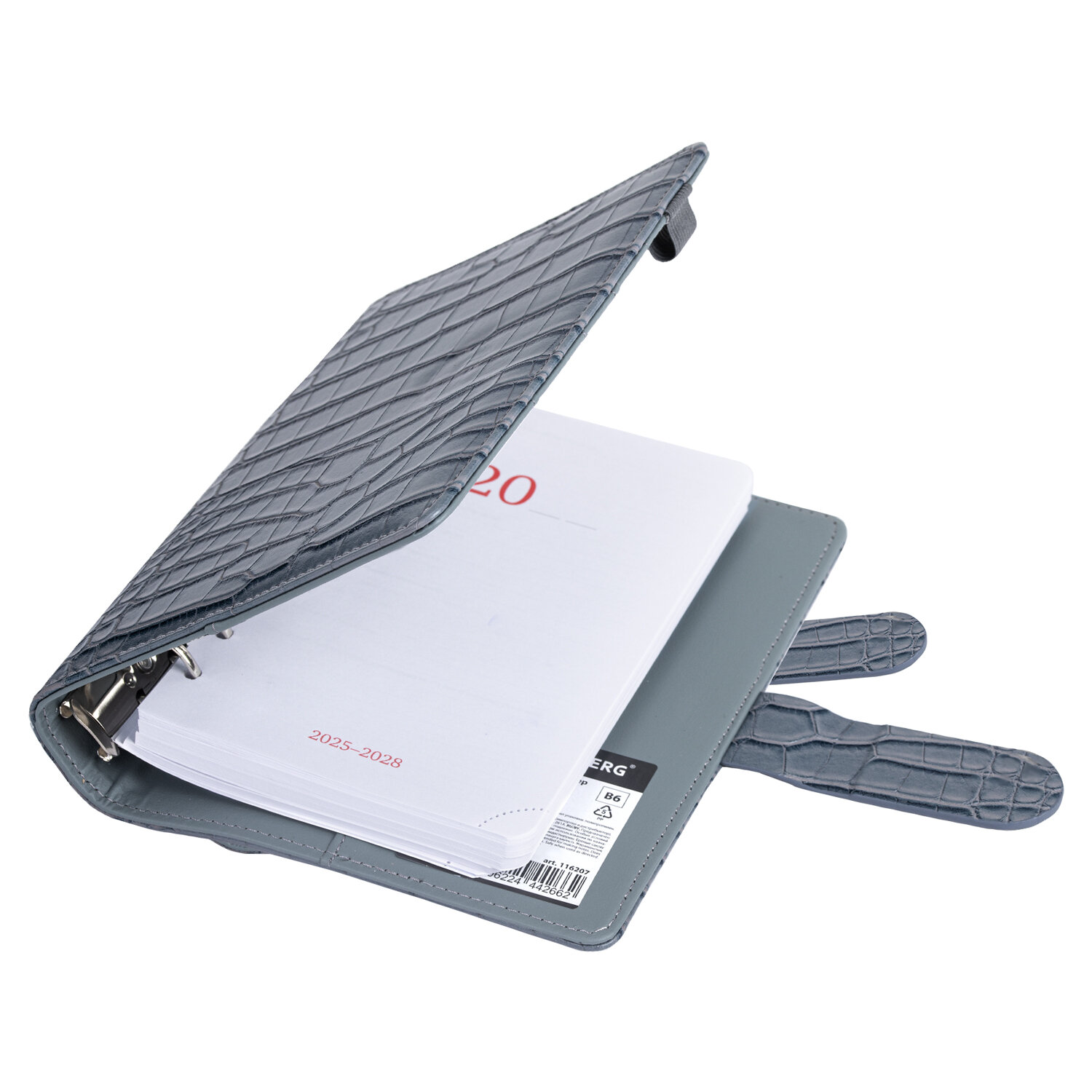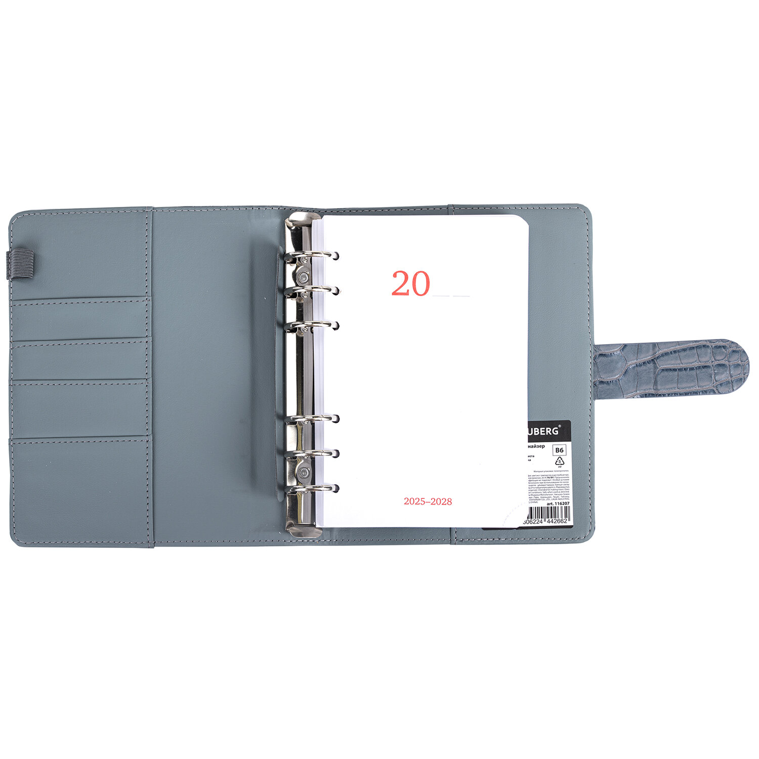 Ежедневник-органайзер недатированный B6 150x190 мм BRAUBERG "Comodo", под кожу, 160 л., серый Код товара: 116207 687,07 ₽ Купить Производитель:BRAUBERG Недатированный ежедневник-органайзер BRAUBERG "Comodo" выполнен в оригинальном стиле. Сочетает в себе удобство ежедневника и функциональность органайзера. Твердая обложка с кольцевым механизмом оснащена дополнительными карманами для хранения бумаг, карточек и мелочей. Съемный внутренний блок включает 160 листов белой бумаги плотностью 70 г/м2. Благодаря формату B6+ (150x190 мм) ежедневник удобно использовать как в офисе, так и на выездных деловых встречах. Ежедневник снабжен стильной магнитной застежкой, благодаря чему он не откроется в сумочке или портфеле, и листы не помнутся. Дополнением является держатель для ручки, что позволяет держать при себе все самое необходимое. Ежедневник содержит обширный справочный материал, а также 7 страниц для записей и заметок. Уголки – закругленные.Производство: КитайТип ежедневника: недатированныйФормат: B6+Обложка: под кожу рептилийВид обложки: твердаяКоличество листов: 160 шт.Особенности: перфорация уголков, прострочка по периметру, скругленные углы, справочная информация, фиксатор для ручкиСерия: ComodoТип застежки: магнитная застёжкаОсновной цвет обложки: серыйДополнительный цвет обложки: нетЦвет среза: нетЦвет внутреннего блока: белыйПлотность внутреннего блока: 70 г/м2Высота строки для записи: 5 ммТип крепления: кольцевой механизмПечать блока: 2 краскиПодходит для блинтового тиснения: даПодходит для тиснения фольгой: даДлина: 190 ммШирина: 150 ммТолщина: 25 ммВес: 480 грРазмер упаковки: 4.2 × 19 × 16.4 смОбъём: 0.0015 м3Промежуточная упаковка: 20 штТранспортная упаковка: 20 штШтрих-код: 4606224442662 Файлы Сертификат-1.jpg Сертификат-2.jpg Сертификат-3.jpg Сертификат-4.jpg Сертификат-5.jpg Сертификат-6.jpg Сертификат-7.jpg Сертификат-8.jpg Сертификат-9.jpg Сертификат-10.jpg Сертификат-11.jpg Сертификат-12.jpg Сертификат-13.jpg Сертификат-14.jpg Сертификат-15.jpg Сертификат-16.jpg Сертификат-17.jpg Сертификат-18.jpg Сертификат-19.jpg Сертификат-20.jpg Сертификат-21.jpg Сертификат-22.jpg Сертификат-23.jpg Сертификат-24.jpg Сертификат-25.jpg Сертификат-26.jpg