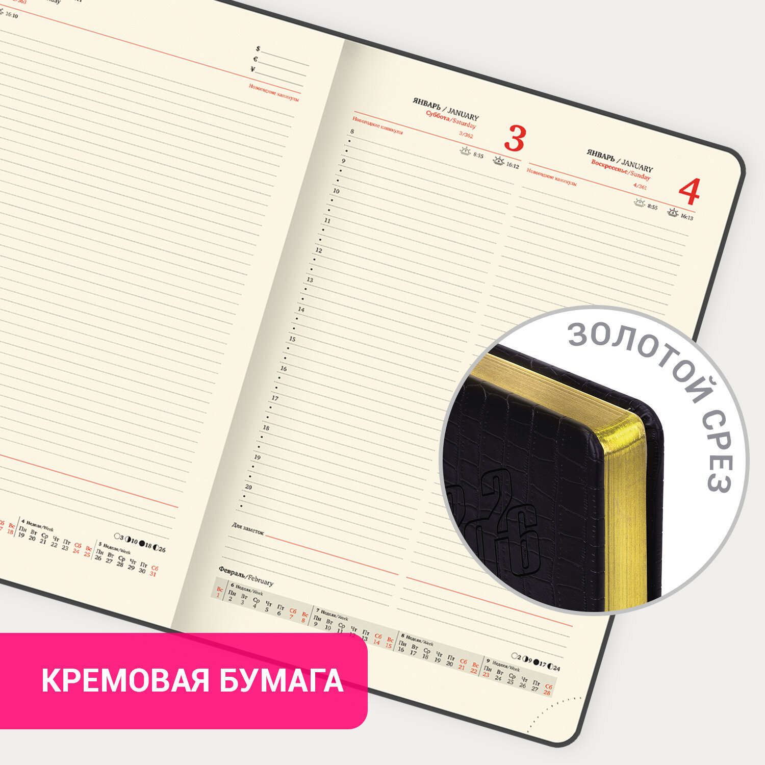 Ежедневник датированный 2026 БОЛЬШОЙ ФОРМАТ 210х297мм А4, BRAUBERG Comodo, под кожу, черный Код товара: 117242 956,44 ₽ Купить Производитель:BRAUBERG Датированный ежедневник BRAUBERG "Comodo" с обложкой, стилизованной под крокодиловую кожу, отличается изысканным внешним видом. Внутренний блок включает 168 листов тонированной бумаги плотностью 70 г/м2. Каждая страничка имеет перфорированный угол. Благодаря большому формату А4 (210x297 мм) ежедневник удобно использовать как в офисе, так и на выездных деловых встречах. Твердая обложка стилизована под кожу крокодила классического черного цвета. Материал обложки подходит для горячего тиснения. Срез ежедневника украшен золотым фольгированием – это подчеркивает премиальность изделия. Дополнением является закладка-ляссе, с помощью которой при необходимости можно быстро открыть ежедневник на нужной странице. Справочный материал расширяет функциональность ежедневника. В конце внутреннего блока есть 4 страницы для записей и заметок. Датированный ежедневник BRAUBERG "Comodo" идеально подойдет для офисных работников и людей, занимающихся бизнесом.Производство: КитайТип ежедневника: датированныйФормат: А4Обложка: под кожу крокодилаВид обложки: твердаяКоличество листов: 168 шт.Особенности: закладка-ляссе, перфорация уголков, поролоновая прослойка, скругленные углы, справочная информацияСерия: ComodoГод: 2026Тип застежки: нетОсновной цвет обложки: черныйДополнительный цвет обложки: нетЦвет среза: золотойЦвет внутреннего блока: кремовыйПлотность внутреннего блока: 70 г/м2Высота строки для записи: 4 ммТип крепления: сшивкаПечать блока: 2 краскиПодходит для блинтового тиснения: даДлина: 297 ммШирина: 210 ммТолщина: 20 ммВес: 984 грРазмер упаковки: 2.5 × 29.8 × 21.2 смОбъём: 0.002 м3Промежуточная упаковка: 18 штТранспортная упаковка: 18 штШтрих-код: 4606224488400 Файлы Сертификат-1.jpg Сертификат-2.jpg Сертификат-3.jpg Сертификат-4.jpg Сертификат-5.jpg Сертификат-6.jpg Сертификат-7.jpg Сертификат-8.jpg Сертификат-9.jpg Сертификат-10.jpg Сертификат-11.jpg Сертификат-12.jpg Сертификат-13.jpg Сертификат-14.jpg Сертификат-15.jpg Сертификат-16.jpg Сертификат-17.jpg Сертификат-18.jpg Сертификат-19.jpg Сертификат-20.jpg Сертификат-21.jpg Сертификат-22.jpg Сертификат-23.jpg Сертификат-24.jpg Сертификат-25.jpg Сертификат-26.jpg