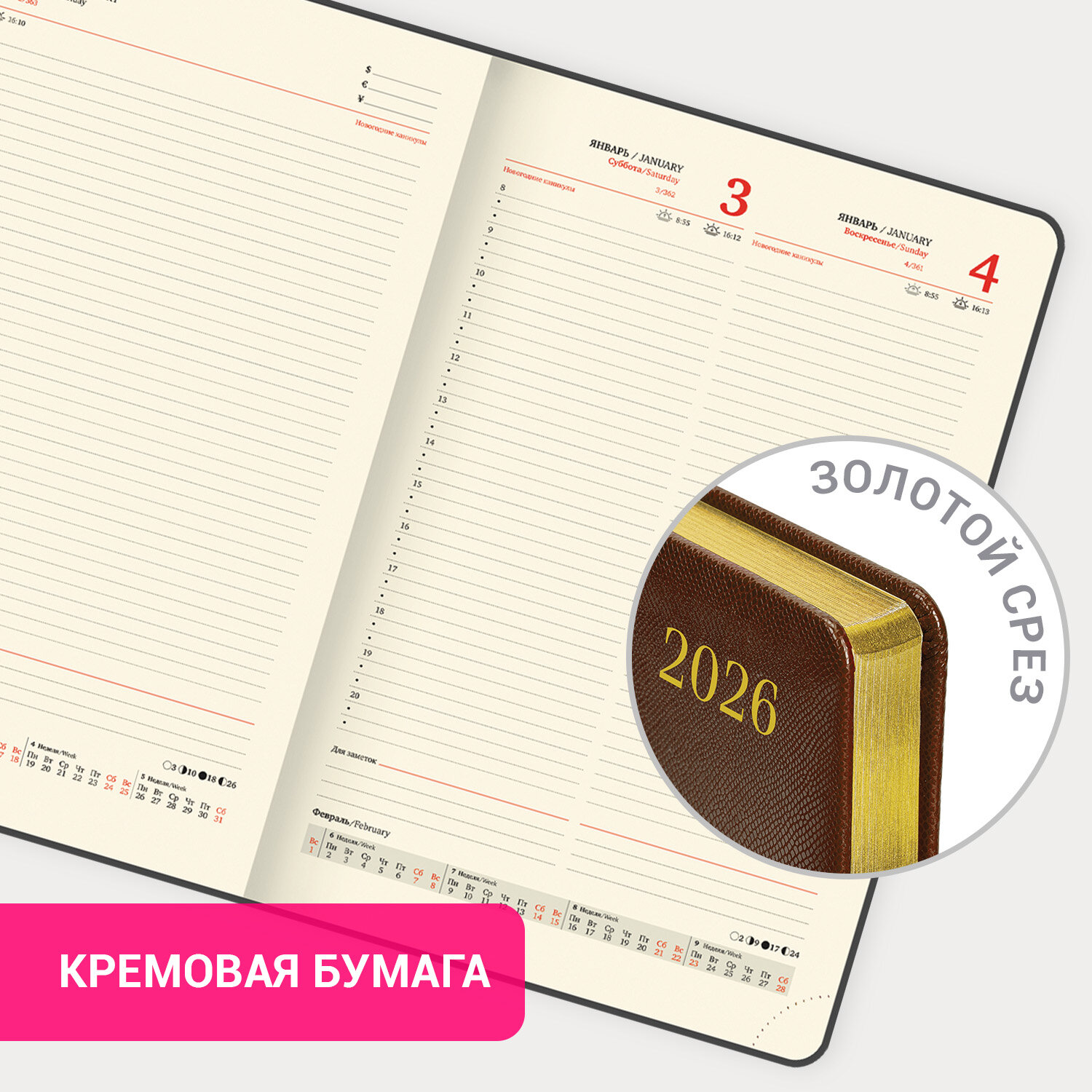 Ежедневник датированный 2026 БОЛЬШОЙ ФОРМАТ 210х297 мм, А4, BRAUBERG "Iguana", под кожу, коричневый Код товара: 117244 879,65 ₽ Купить Производитель:BRAUBERG Модная фактура и насыщенные цвета придают датированному ежедневнику BRAUBERG "Iguana" особый шик и легкую загадочность. Внутренний блок включает 168 листов тонированной бумаги плотностью 70 г/м2. Каждая страничка имеет перфорированный угол. Благодаря большому формату А4 (210х297 мм) ежедневник удобно использовать как в офисе, так и на выездных деловых встречах. Твердая обложка коричневого цвета стилизована под кожу рептилии. Подходит для горячего тиснения. Срез ежедневника покрыт золотой фольгой, что придает ему особый шарм. Дополнением является закладка-ляссе, с помощью которой при необходимости можно быстро открыть ежедневник на нужной странице. Ежедневник снабжен обширным справочным материалом. В конце есть 4 страницы для записей и заметок. Датированный ежедневник BRAUBERG "Iguana" идеально подойдет для офисных работников и людей, занимающихся бизнесом.Производство: КитайТип ежедневника: датированныйФормат: А4Обложка: под кожу рептилийВид обложки: твердаяКоличество листов: 168 шт.Особенности: закладка-ляссе, перфорация уголков, поролоновая прослойка, скругленные углы, справочная информацияСерия: IguanaГод: 2026Тип застежки: нетОсновной цвет обложки: темно-коричневыйДополнительный цвет обложки: нетЦвет среза: золотойЦвет внутреннего блока: кремовыйПлотность внутреннего блока: 70 г/м2Высота строки для записи: 4 ммТип крепления: сшивкаПечать блока: 2 краскиПодходит для блинтового тиснения: даПодходит для тиснения фольгой: даДлина: 297 ммШирина: 210 ммТолщина: 20 ммВес: 984 грРазмер упаковки: 2.6 × 29.6 × 21.3 смОбъём: 0.002 м3Промежуточная упаковка: 18 штТранспортная упаковка: 18 штШтрих-код: 4606224488424 Файлы Сертификат-1.jpg Сертификат-2.jpg Сертификат-3.jpg Сертификат-4.jpg Сертификат-5.jpg Сертификат-6.jpg Сертификат-7.jpg Сертификат-8.jpg Сертификат-9.jpg Сертификат-10.jpg Сертификат-11.jpg Сертификат-12.jpg Сертификат-13.jpg Сертификат-14.jpg Сертификат-15.jpg Сертификат-16.jpg Сертификат-17.jpg Сертификат-18.jpg Сертификат-19.jpg Сертификат-20.jpg Сертификат-21.jpg Сертификат-22.jpg Сертификат-23.jpg Сертификат-24.jpg Сертификат-25.jpg Сертификат-26.jpg