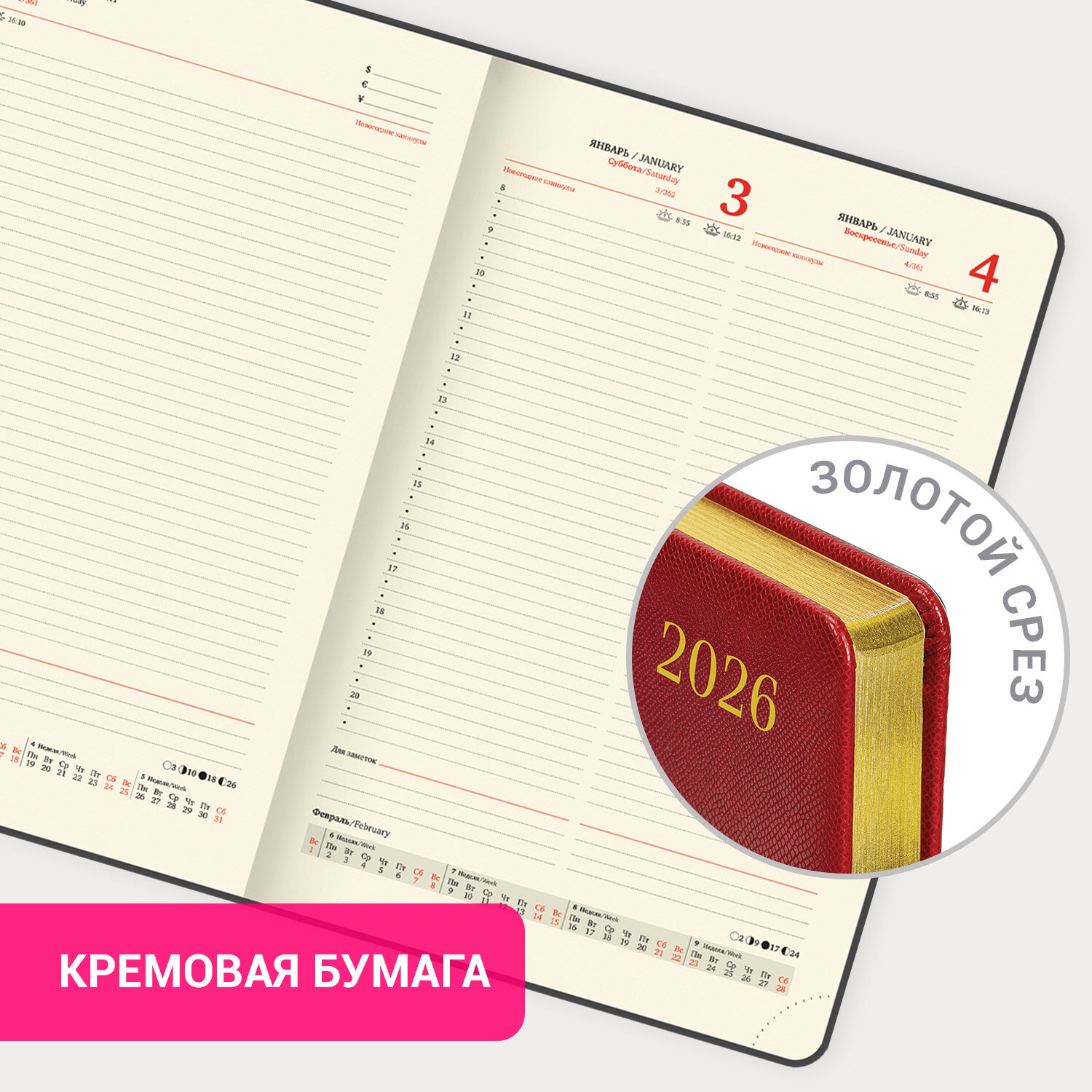 Ежедневник датированный 2026 БОЛЬШОЙ ФОРМАТ 210х297 мм, А4, BRAUBERG "Iguana", под кожу, красный Код товара: 117246 879,65 ₽ Купить Производитель:BRAUBERG Модная фактура и насыщенные цвета придают датированному ежедневнику BRAUBERG "Iguana" особый шик и легкую загадочность. Внутренний блок включает 168 листов тонированной бумаги плотностью 70 г/м2. Каждая страничка имеет перфорированный угол. Благодаря большому формату А4 (210х297 мм) ежедневник удобно использовать как в офисе, так и на выездных деловых встречах. Твердая обложка красного цвета стилизована под кожу рептилии. Подходит для горячего тиснения. Срез ежедневника покрыт золотой фольгой, что придает ему особый шарм. Дополнением является закладка-ляссе, с помощью которой при необходимости можно быстро открыть ежедневник на нужной странице. Ежедневник снабжен обширным справочным материалом. В конце есть 4 страницы для записей и заметок. Датированный ежедневник BRAUBERG "Iguana" идеально подойдет для офисных работников и людей, занимающихся бизнесом.Производство: КитайТип ежедневника: датированныйФормат: А4Обложка: под кожу рептилийВид обложки: твердаяКоличество листов: 168 шт.Особенности: закладка-ляссе, перфорация уголков, поролоновая прослойка, скругленные углы, справочная информацияСерия: IguanaГод: 2026Тип застежки: нетОсновной цвет обложки: красныйДополнительный цвет обложки: нетЦвет среза: золотойЦвет внутреннего блока: кремовыйПлотность внутреннего блока: 70 г/м2Высота строки для записи: 4 ммТип крепления: сшивкаПечать блока: 2 краскиПодходит для блинтового тиснения: даПодходит для тиснения фольгой: даДлина: 297 ммШирина: 210 ммТолщина: 20 ммВес: 982 грРазмер упаковки: 2.4 × 29.6 × 21.5 смОбъём: 0.0019 м3Промежуточная упаковка: 18 штТранспортная упаковка: 18 штШтрих-код: 4606224488448 Файлы Сертификат-1.jpg Сертификат-2.jpg Сертификат-3.jpg Сертификат-4.jpg Сертификат-5.jpg Сертификат-6.jpg Сертификат-7.jpg Сертификат-8.jpg Сертификат-9.jpg Сертификат-10.jpg Сертификат-11.jpg Сертификат-12.jpg Сертификат-13.jpg Сертификат-14.jpg Сертификат-15.jpg Сертификат-16.jpg Сертификат-17.jpg Сертификат-18.jpg Сертификат-19.jpg Сертификат-20.jpg Сертификат-21.jpg Сертификат-22.jpg Сертификат-23.jpg Сертификат-24.jpg Сертификат-25.jpg Сертификат-26.jpg