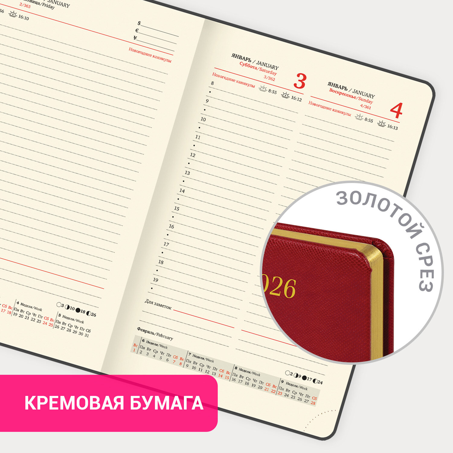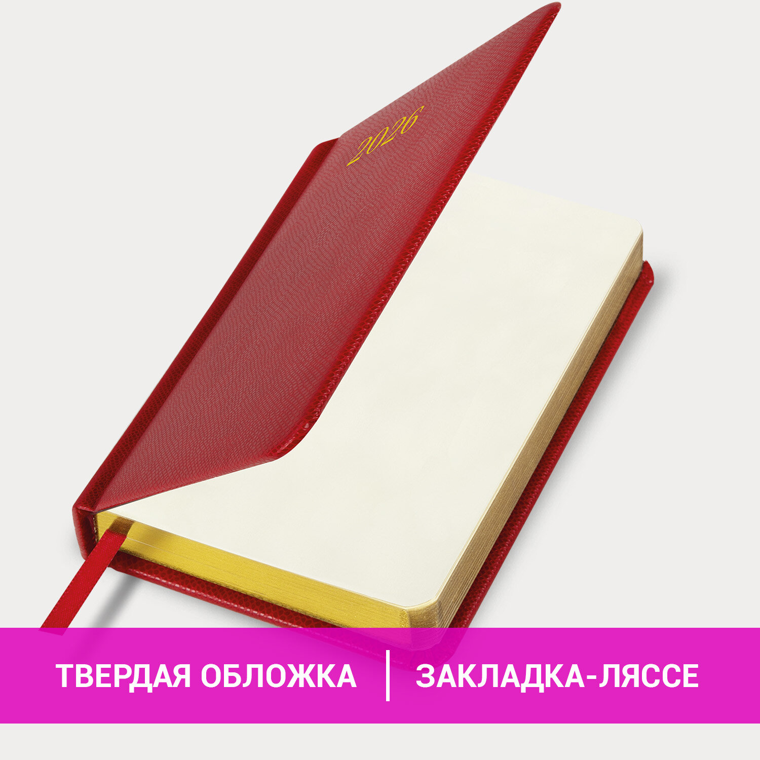 Ежедневник датированный 2026, МАЛЫЙ ФОРМАТ 100х150 мм, А6, BRAUBERG "Iguana", под кожу, красный Код товара: 117251 321,29 ₽ Купить Производитель:BRAUBERG Кожа рептилий – вечный тренд, символ изысканного вкуса. Коллекция датированных ежедневников "Iguana" – очередное тому подтверждение. Модная фактура и насыщенные цвета придают изделиям особый шик и легкую загадочность. Внутренний блок включает 168 листов тонированной бумаги плотностью 70 г/м2. Каждая страничка имеет перфорированный угол. Благодаря малому формату А6 (100х150 мм) ежедневник удобно использовать как в офисе, так и на выездных деловых встречах. Твердая обложка классического красного цвета стилизована под кожу рептилии. Подходит для горячего тиснения. Срез ежедневника украшен золотым фольгированием – это подчеркивает премиальность изделия. Дополнением является закладка-ляссе, с помощью которой при необходимости можно быстро открыть ежедневник на нужной странице. Помимо прочего, ежедневник снабжен обширным справочным материалом. В конце ежедневника есть 4 страницы для записей и заметок. Датированный ежедневник BRAUBERG "Iguana" идеально подойдет для офисных работников и людей, занимающихся бизнесом, ценящих свое драгоценное время.Производство: КитайТип ежедневника: датированныйФормат: А6Обложка: под гладкую кожуВид обложки: твердаяКоличество листов: 168 шт.Особенности: закладка-ляссе, перфорация уголков, поролоновая прослойка, прострочка по периметру, скругленные углы, справочная информацияСерия: IguanaГод: 2026Тип застежки: нетОсновной цвет обложки: красныйДополнительный цвет обложки: нетЦвет среза: золотойЦвет внутреннего блока: кремовыйПлотность внутреннего блока: 70 г/м2Высота строки для записи: 4 ммТип крепления: сшивкаПечать блока: 2 краскиПодходит для блинтового тиснения: даПодходит для тиснения фольгой: даДлина: 150 ммШирина: 100 ммТолщина: 20 ммВес: 242 грРазмер упаковки: 2.5 × 15 × 10.2 смОбъём: 0.0005 м3Промежуточная упаковка: 30 штТранспортная упаковка: 30 штШтрих-код: 4606224488493 Файлы Сертификат-1.jpg Сертификат-2.jpg Сертификат-3.jpg Сертификат-4.jpg Сертификат-5.jpg Сертификат-6.jpg Сертификат-7.jpg Сертификат-8.jpg Сертификат-9.jpg Сертификат-10.jpg Сертификат-11.jpg Сертификат-12.jpg Сертификат-13.jpg Сертификат-14.jpg Сертификат-15.jpg Сертификат-16.jpg Сертификат-17.jpg Сертификат-18.jpg Сертификат-19.jpg Сертификат-20.jpg Сертификат-21.jpg Сертификат-22.jpg Сертификат-23.jpg Сертификат-24.jpg Сертификат-25.jpg Сертификат-26.jpg