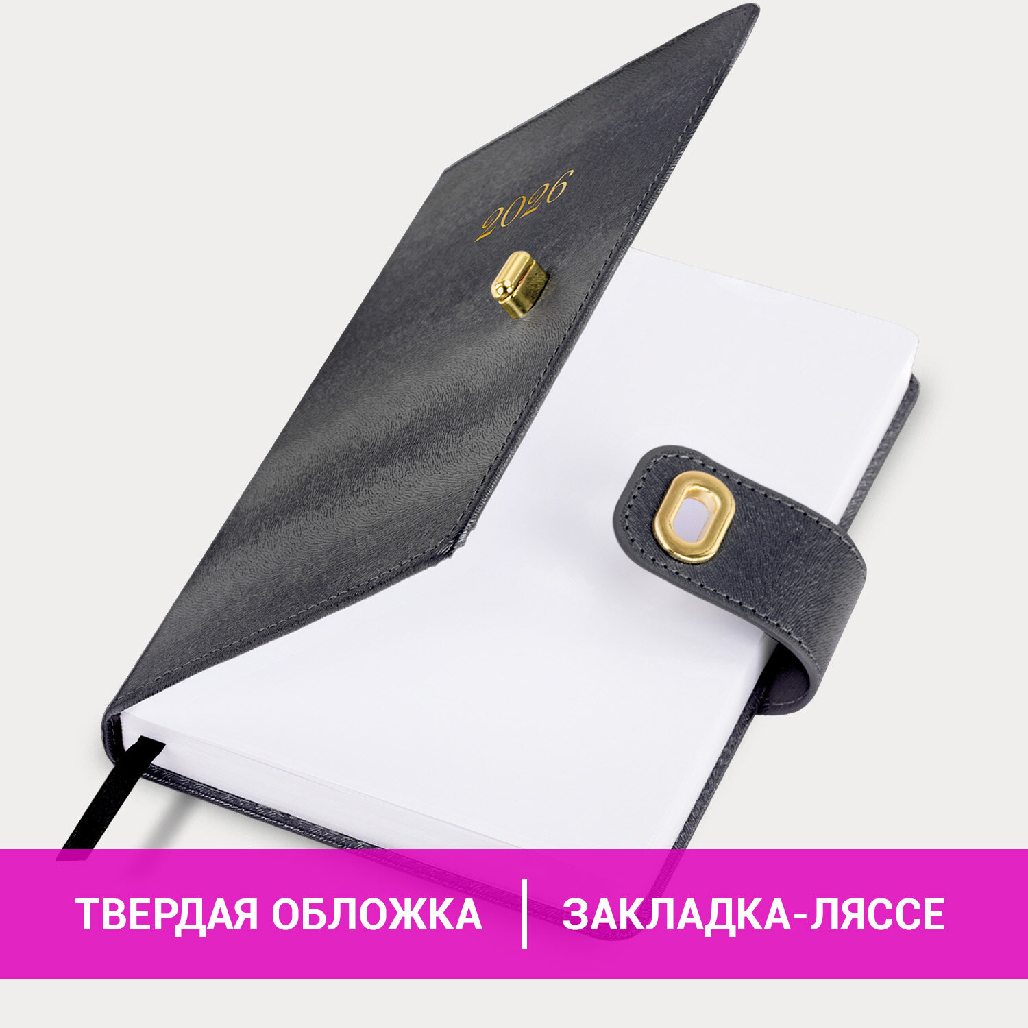 Ежедневник датированный 2026 А5 138х213 мм, BRAUBERG "Elegant", под кожу, застежка, черный Код товара: 117368 697,17 ₽ Купить Производитель:BRAUBERG Датированный ежедневник BRAUBERG "Elegant" выполнен в оригинальном стиле. Непревзойденное качество исполнения подчеркивает солидность и элегантность владельца этого делового аксессуара. Внутренний блок включает 168 листов белой бумаги плотностью 70 г/м2. Каждая страничка имеет перфорированный угол. Благодаря стандартному формату А5 (138x213 мм) ежедневник удобно использовать как в офисе, так и на выездных деловых встречах. Твердая обложка стилизована под текстурную кожу. Материал обложки подходит для горячего тиснения. Ежедневник фиксируется стильной металлической застежкой, поэтому он не откроется в сумке или портфеле и страницы не помнутся. Дополнением является закладка-ляссе, с помощью которой при необходимости можно быстро открыть ежедневник на нужной странице. Ежедневник снабжен обширным справочным материалом. В конце есть 4 страницы для записей и заметок. Датированный ежедневник BRAUBERG "Elegant" идеально подойдет для офисных работников и людей, занимающихся бизнесом.Производство: КитайТип ежедневника: датированныйФормат: А5Обложка: под текстурную кожуВид обложки: твердаяКоличество листов: 168 шт.Особенности: закладка-ляссе, перфорация уголков, прострочка по периметру, справочная информацияСерия: ElegantГод: 2026Тип застежки: ремешок с застёжкойОсновной цвет обложки: черныйДополнительный цвет обложки: нетЦвет среза: белыйЦвет внутреннего блока: белыйПлотность внутреннего блока: 70 г/м2Высота строки для записи: 4 ммТип крепления: сшивкаПечать блока: 2 краскиПодходит для блинтового тиснения: даПодходит для тиснения фольгой: даДлина: 213 ммШирина: 138 ммТолщина: 20 ммВес: 495 грРазмер упаковки: 3.4 × 21.5 × 14.5 смОбъём: 0.0013 м3Промежуточная упаковка: 20 штТранспортная упаковка: 20 штШтрих-код: 4606224489513 Файлы Сертификат-1.jpg Сертификат-2.jpg Сертификат-3.jpg Сертификат-4.jpg Сертификат-5.jpg Сертификат-6.jpg Сертификат-7.jpg Сертификат-8.jpg Сертификат-9.jpg Сертификат-10.jpg Сертификат-11.jpg Сертификат-12.jpg Сертификат-13.jpg Сертификат-14.jpg Сертификат-15.jpg Сертификат-16.jpg Сертификат-17.jpg Сертификат-18.jpg Сертификат-19.jpg Сертификат-20.jpg Сертификат-21.jpg Сертификат-22.jpg Сертификат-23.jpg Сертификат-24.jpg Сертификат-25.jpg Сертификат-26.jpg
