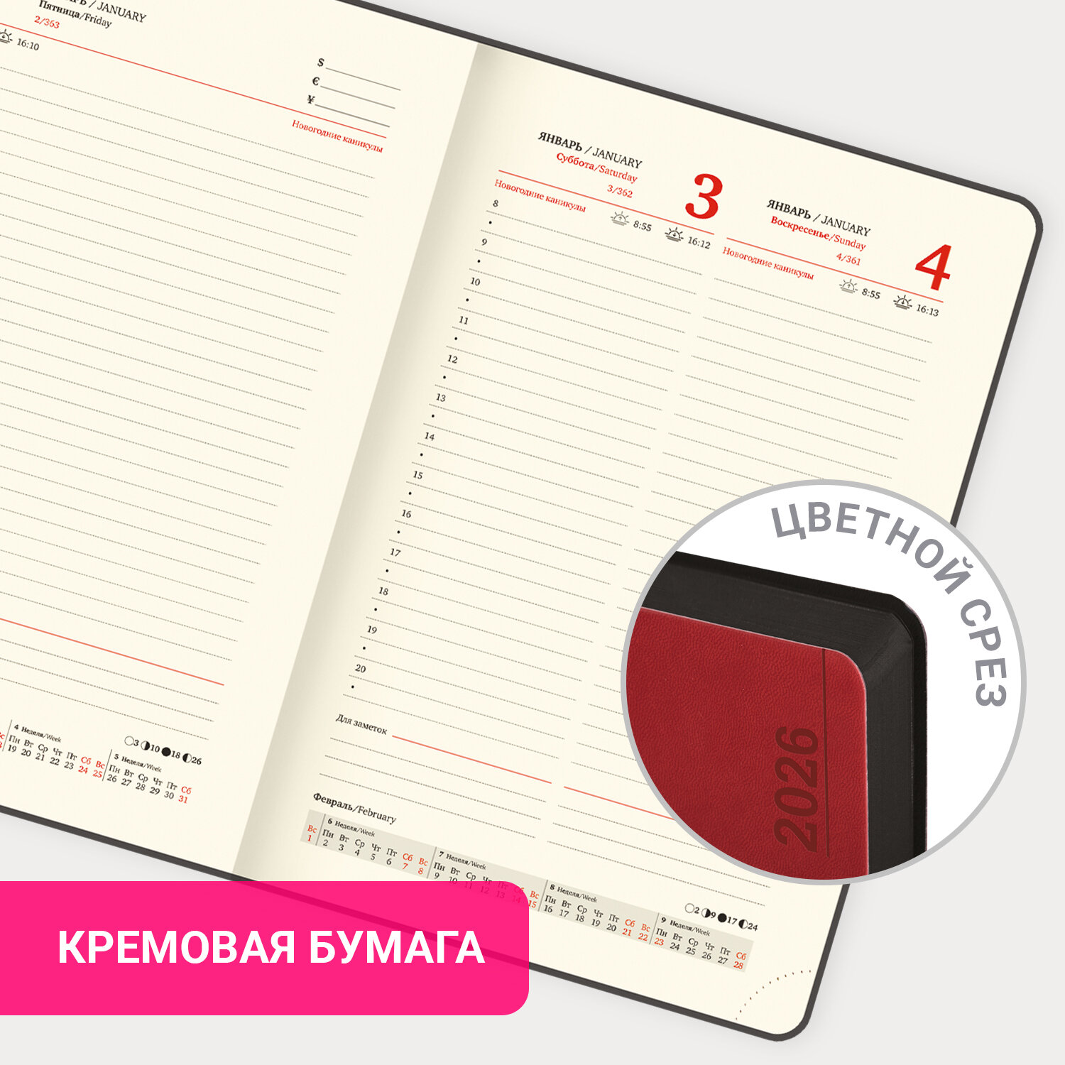 Ежедневник датированный 2026 А5 138x213 мм, BRAUBERG "Metropolis Mix", под кожу, гибкий, красный Код товара: 117442 473,72 ₽ Купить Производитель:BRAUBERG Датированный ежедневник BRAUBERG "Metropolis Mix" выполнен в классическом стиле. Обложка из материала "под кожу" приятна на ощупь. Внутренний блок включает 168 листов кремовой бумаги плотностью 70 г/м2. Каждая страничка имеет перфорированный угол. Благодаря стандартному формату А5 (138х213 мм) ежедневник удобно использовать как в офисе, так и на выездных деловых встречах. Мягкая интегральная обложка стилизована под гладкую кожу благородного красного цвета. Материал обложки подходит для горячего тиснения. Срез и форзац ежедневника окрашены в контрастный с обложкой цвет, что придает изделию особый шарм. Дополнением является закладка-ляссе, с помощью которой при необходимости можно быстро открыть ежедневник на нужной странице. Ежедневник снабжен обширным справочным материалом. В конце есть 4 страницы для записей и заметок. Датированный ежедневник BRAUBERG "Metropolis Mix" идеально подойдет для офисных работников и людей, занимающихся бизнесом.Производство: КитайТип ежедневника: датированныйФормат: А5Обложка: под классическую кожуВид обложки: интегральнаяКоличество листов: 168 шт.Особенности: закладка-ляссе, перфорация уголков, скругленные углы, справочная информацияСерия: Metropolis MixГод: 2026Тип застежки: нетОсновной цвет обложки: красныйДополнительный цвет обложки: нетЦвет среза: черныйЦвет внутреннего блока: кремовыйПлотность внутреннего блока: 70 г/м2Высота строки для записи: 4 ммТип крепления: сшивкаПечать блока: 2 краскиПодходит для блинтового тиснения: даПодходит для тиснения фольгой: даПодходит для заливки полимерной смолой: даПодходит для УФ-печати: даПодходит для тампопечати: даДлина: 213 ммШирина: 138 ммТолщина: 18 ммВес: 397 грРазмер упаковки: 1.8 × 21.2 × 13.9 смОбъём: 0.0007 м3Промежуточная упаковка: 20 штТранспортная упаковка: 20 штШтрих-код: 4606224488691 Файлы Сертификат-1.jpg Сертификат-2.jpg Сертификат-3.jpg Сертификат-4.jpg Сертификат-5.jpg Сертификат-6.jpg Сертификат-7.jpg Сертификат-8.jpg Сертификат-9.jpg Сертификат-10.jpg Сертификат-11.jpg Сертификат-12.jpg Сертификат-13.jpg Сертификат-14.jpg Сертификат-15.jpg Сертификат-16.jpg Сертификат-17.jpg Сертификат-18.jpg Сертификат-19.jpg Сертификат-20.jpg Сертификат-21.jpg Сертификат-22.jpg Сертификат-23.jpg Сертификат-24.jpg Сертификат-25.jpg Сертификат-26.jpg
