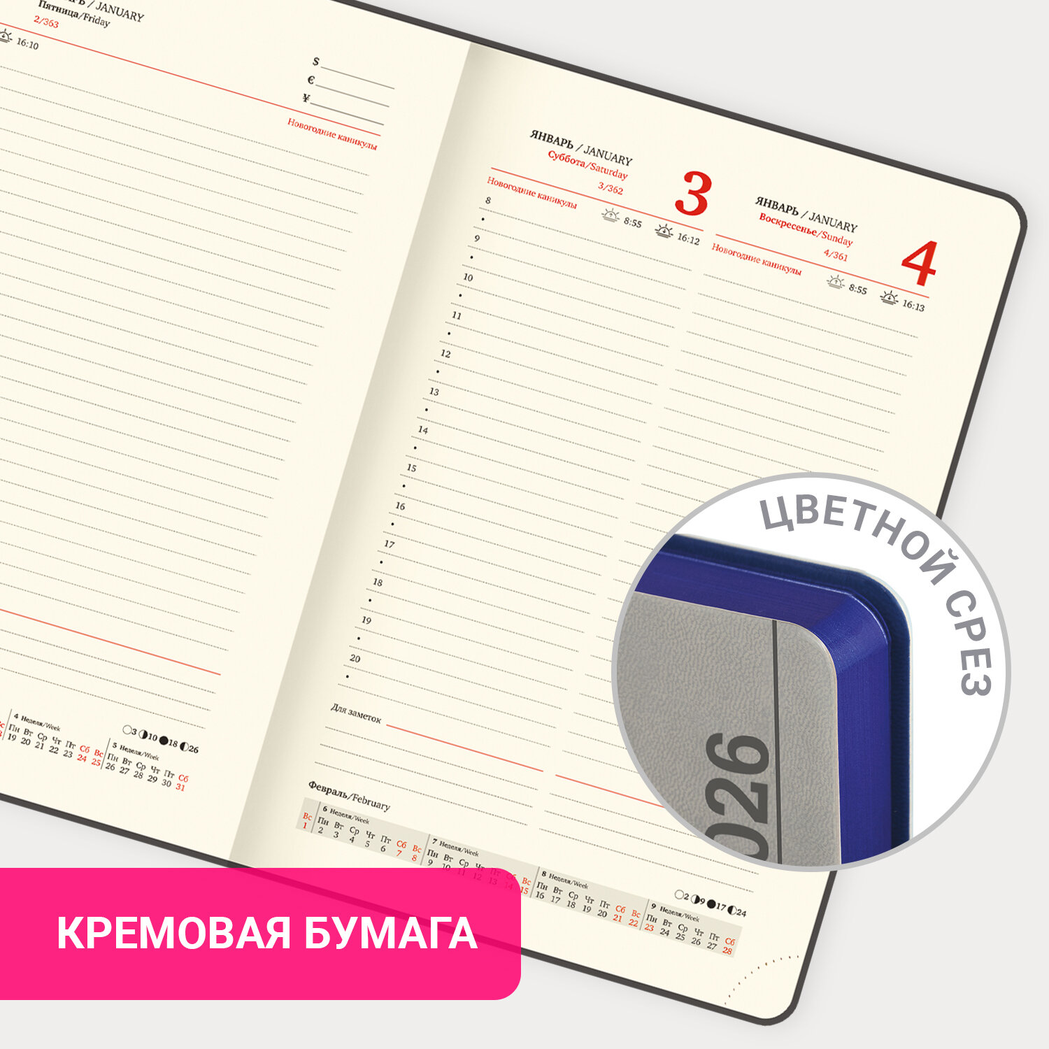 Ежедневник датированный 2026 А5 138x213 мм, BRAUBERG "Metropolis Mix", под кожу, гибкий, серый Код товара: 117443 473,72 ₽ Купить Производитель:BRAUBERG Датированный ежедневник BRAUBERG "Metropolis Mix" выполнен в классическом стиле. Обложка из материала "под кожу" приятна на ощупь. Внутренний блок включает 168 листов кремовой бумаги плотностью 70 г/м2. Каждая страничка имеет перфорированный угол. Благодаря стандартному формату А5 (138х213 мм) ежедневник удобно использовать как в офисе, так и на выездных деловых встречах. Мягкая интегральная обложка стилизована под гладкую кожу классического серого цвета. Материал обложки подходит для горячего тиснения. Срез и форзац ежедневника окрашены в контрастный с обложкой цвет, что придает изделию особый шарм. Дополнением является закладка-ляссе, с помощью которой при необходимости можно быстро открыть ежедневник на нужной странице. Ежедневник снабжен обширным справочным материалом. В конце есть 4 страницы для записей и заметок. Датированный ежедневник BRAUBERG "Metropolis Mix" идеально подойдет для офисных работников и людей, занимающихся бизнесом.Производство: КитайТип ежедневника: датированныйФормат: А5Обложка: под классическую кожуВид обложки: интегральнаяКоличество листов: 168 шт.Особенности: закладка-ляссе, перфорация уголков, скругленные углы, справочная информацияСерия: Metropolis MixГод: 2026Тип застежки: нетОсновной цвет обложки: серыйДополнительный цвет обложки: нетЦвет среза: синийЦвет внутреннего блока: кремовыйПлотность внутреннего блока: 70 г/м2Высота строки для записи: 4 ммТип крепления: сшивкаПечать блока: 2 краскиПодходит для блинтового тиснения: даПодходит для тиснения фольгой: даПодходит для заливки полимерной смолой: даПодходит для УФ-печати: даПодходит для тампопечати: даДлина: 213 ммШирина: 138 ммТолщина: 18 ммВес: 399 грРазмер упаковки: 1.9 × 21.1 × 14.1 смОбъём: 0.0007 м3Промежуточная упаковка: 20 штТранспортная упаковка: 20 штШтрих-код: 4606224488707 Файлы Сертификат-1.jpg Сертификат-2.jpg Сертификат-3.jpg Сертификат-4.jpg Сертификат-5.jpg Сертификат-6.jpg Сертификат-7.jpg Сертификат-8.jpg Сертификат-9.jpg Сертификат-10.jpg Сертификат-11.jpg Сертификат-12.jpg Сертификат-13.jpg Сертификат-14.jpg Сертификат-15.jpg Сертификат-16.jpg Сертификат-17.jpg Сертификат-18.jpg Сертификат-19.jpg Сертификат-20.jpg Сертификат-21.jpg Сертификат-22.jpg Сертификат-23.jpg Сертификат-24.jpg Сертификат-25.jpg Сертификат-26.jpg