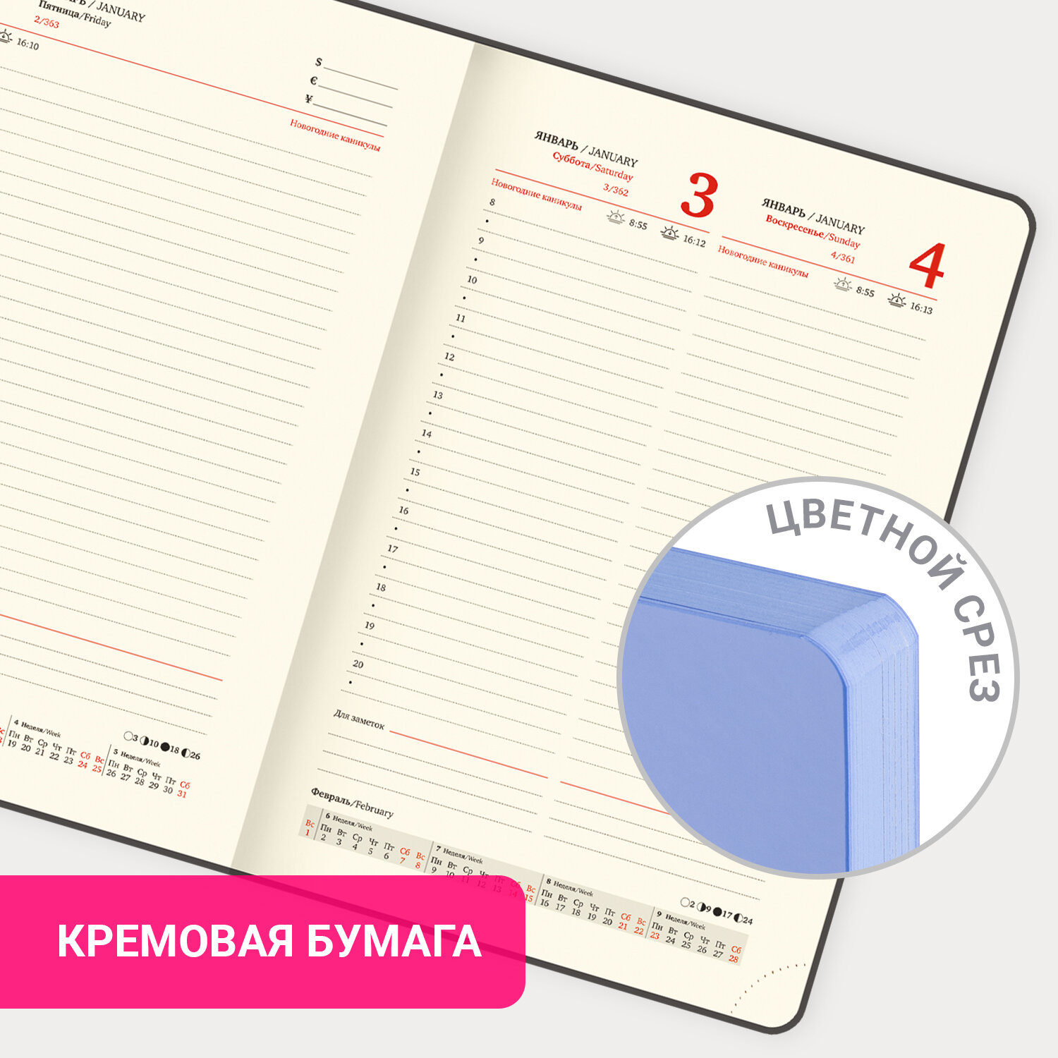 Ежедневник датированный 2026, А5, 138x213 мм, BRAUBERG "Pastel", под кожу гибкий, синий Код товара: 117461 515,64 ₽ Купить Производитель:BRAUBERG Датированный ежедневник BRAUBERG "Pastel" выполнен в классическом стиле. Материал "под кожу" с покрытием Soft Touch придаёт обложке мягкий, бархатистый тактильный эффект. Внутренний блок включает 168 листов кремовой бумаги плотностью 70 г/м2. Каждая страничка имеет перфорированный угол. Благодаря стандартному формату А5 (138х213 мм) ежедневник удобно использовать как в офисе, так и на выездных деловых встречах. Мягкая интегральная обложка пастельного синего цвета стилизована под гладкую кожу. Материал обложки подходит для горячего тиснения. Цветной срез придает ежедневнику особый шарм. Дополнением является закладка-ляссе, с помощью которой при необходимости можно быстро открыть ежедневник на нужной странице. Обширный справочный материал дополнительно расширяет функциональность ежедневника. В конце внутреннего блока есть 4 страницы для записей и заметок. Датированный ежедневник BRAUBERG "Pastel" идеально подойдет для офисных работников, людей, занимающихся бизнесом.Производство: КитайТип ежедневника: датированныйФормат: А5Обложка: софт-тачВид обложки: интегральнаяКоличество листов: 168 шт.Особенности: закладка-ляссе, перфорация уголков, скругленные углы, справочная информацияСерия: PastelГод: 2026Тип застежки: нетОсновной цвет обложки: синийДополнительный цвет обложки: нетЦвет среза: синийЦвет внутреннего блока: кремовыйПлотность внутреннего блока: 70 г/м2Высота строки для записи: 4 ммТип крепления: сшивкаПечать блока: 2 краскиПодходит для блинтового тиснения: даПодходит для тиснения фольгой: даПодходит для заливки полимерной смолой: даПодходит для УФ-печати: даПодходит для тампопечати: даДлина: 213 ммШирина: 138 ммТолщина: 18 ммВес: 403 грРазмер упаковки: 1.9 × 20.8 × 13.6 смОбъём: 0.0007 м3Промежуточная упаковка: 20 штТранспортная упаковка: 20 штШтрих-код: 4606224488882 Файлы Сертификат-1.jpg Сертификат-2.jpg Сертификат-3.jpg Сертификат-4.jpg Сертификат-5.jpg Сертификат-6.jpg Сертификат-7.jpg Сертификат-8.jpg Сертификат-9.jpg Сертификат-10.jpg Сертификат-11.jpg Сертификат-12.jpg Сертификат-13.jpg Сертификат-14.jpg Сертификат-15.jpg Сертификат-16.jpg Сертификат-17.jpg Сертификат-18.jpg Сертификат-19.jpg Сертификат-20.jpg Сертификат-21.jpg Сертификат-22.jpg Сертификат-23.jpg Сертификат-24.jpg Сертификат-25.jpg Сертификат-26.jpg