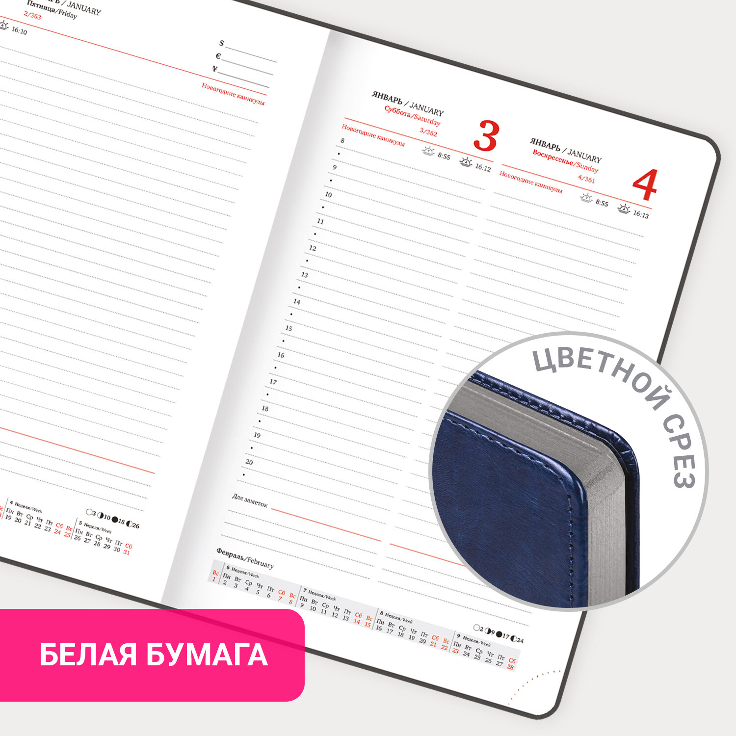 Ежедневник датированный 2026 А5 138x213 мм, BRAUBERG "Inspiration", под кожу, цветной срез, синий Код товара: 117474 694,14 ₽ Купить Производитель:BRAUBERG Датированный ежедневник BRAUBERG "Inspiration" выполнен в оригинальном стиле. Непревзойденное качество исполнения и креативный дизайн этого делового аксессуара обязательно порадуют его владельца и добавят ему солидности. Внутренний блок включает 168 листов белой бумаги плотностью 70 г/м2. Каждая страничка имеет перфорированный угол. Благодаря стандартному формату А5 (138х213 мм) ежедневник удобно использовать как в офисе, так и на выездных деловых встречах. Твердая обложка стилизована под гладкую кожу синего цвета. Материал обложки подходит для горячего тиснения. Для удобства пользования ежедневник снабжен держателем для ручки. Цветной срез в контраст обложки придает ежедневнику особый шарм. Дополнением является закладка-ляссе, с помощью которой при необходимости можно быстро открыть ежедневник на нужной странице. Ежедневник снабжен обширным справочным материалом. В конце есть 4 страницы для записей и заметок. Датированный ежедневник BRAUBERG "Inspiration" идеально подойдет для офисных работников и людей, занимающихся бизнесом.Производство: КитайТип ежедневника: датированныйФормат: А5Обложка: под гладкую кожуВид обложки: твердаяКоличество листов: 168 шт.Особенности: закладка-ляссе, перфорация уголков, скругленные углы, справочная информация, фиксатор для ручкиСерия: InspirationГод: 2026Тип застежки: магнитная застежкаОсновной цвет обложки: синийДополнительный цвет обложки: нетЦвет среза: серыйЦвет внутреннего блока: белыйПлотность внутреннего блока: 70 г/м2Высота строки для записи: 4 ммТип крепления: сшивкаПечать блока: 2 краскиПодходит для блинтового тиснения: даПодходит для тиснения фольгой: даПодходит для заливки полимерной смолой: даПодходит для УФ-печати: даПодходит для тампопечати: даДлина: 213 ммШирина: 138 ммТолщина: 20 ммВес: 481 грРазмер упаковки: 2.6 × 21.4 × 15.3 смОбъём: 0.001 м3Промежуточная упаковка: 20 штТранспортная упаковка: 20 штШтрих-код: 4606224489018 Файлы Сертификат-1.jpg Сертификат-2.jpg Сертификат-3.jpg Сертификат-4.jpg Сертификат-5.jpg Сертификат-6.jpg Сертификат-7.jpg Сертификат-8.jpg Сертификат-9.jpg Сертификат-10.jpg Сертификат-11.jpg Сертификат-12.jpg Сертификат-13.jpg Сертификат-14.jpg Сертификат-15.jpg Сертификат-16.jpg Сертификат-17.jpg Сертификат-18.jpg Сертификат-19.jpg Сертификат-20.jpg Сертификат-21.jpg Сертификат-22.jpg Сертификат-23.jpg Сертификат-24.jpg Сертификат-25.jpg Сертификат-26.jpg