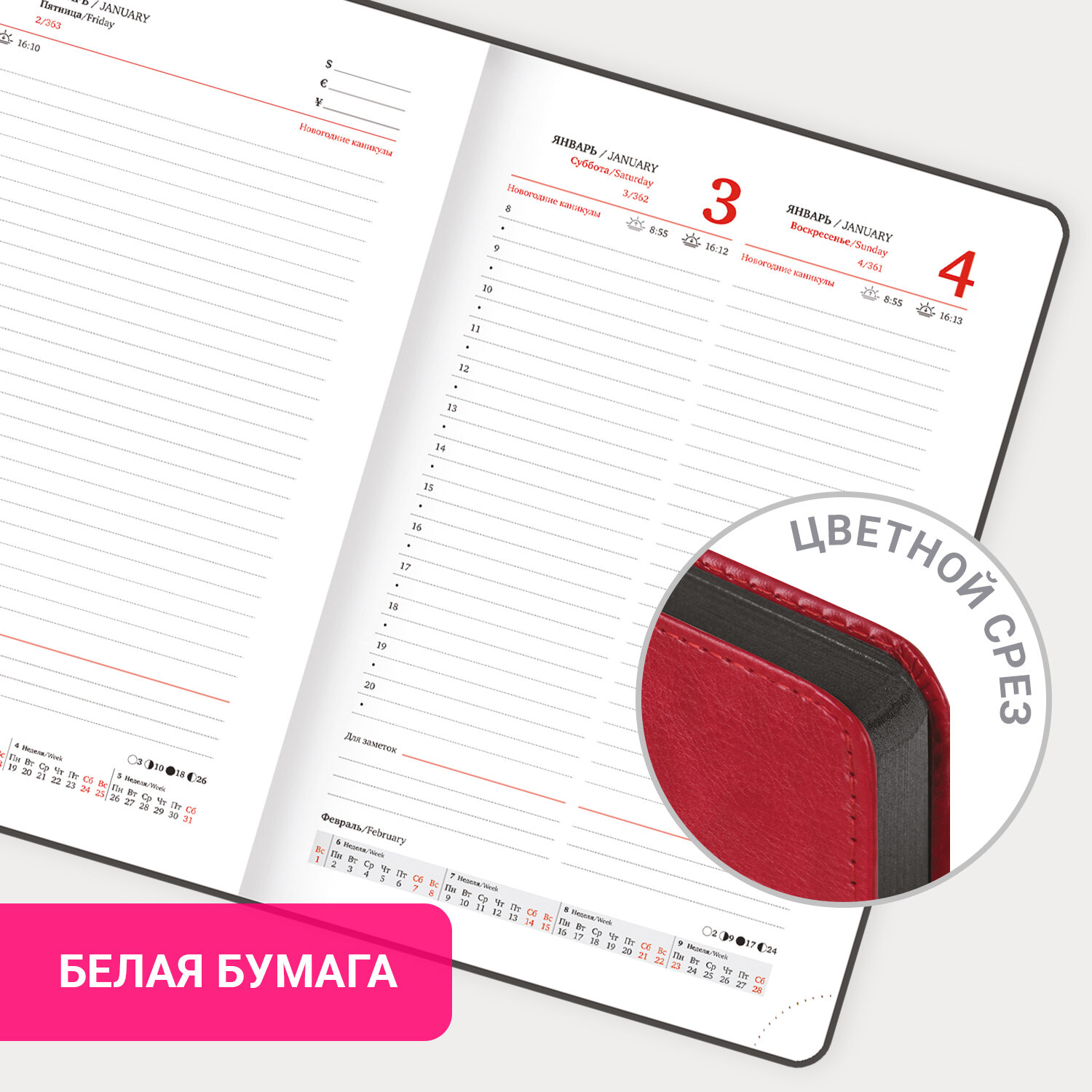 Ежедневник датированный 2026 А5 138x213 мм, BRAUBERG "Inspiration", под кожу, цветной срез, красный Код товара: 117475 694,14 ₽ Купить Производитель:BRAUBERG Датированный ежедневник BRAUBERG "Inspiration" выполнен в оригинальном стиле. Непревзойденное качество исполнения и креативный дизайн этого делового аксессуара обязательно порадуют его владельца и добавят ему солидности. Внутренний блок включает 168 листов белой бумаги плотностью 70 г/м2. Каждая страничка имеет перфорированный угол. Благодаря стандартному формату А5 (138х213 мм) ежедневник удобно использовать как в офисе, так и на выездных деловых встречах. Твердая обложка стилизована под гладкую кожу красного цвета. Материал обложки подходит для горячего тиснения. Для удобства пользования ежедневник снабжен держателем для ручки. Цветной срез в контраст обложки придает ежедневнику особый шарм. Дополнением является закладка-ляссе, с помощью которой при необходимости можно быстро открыть ежедневник на нужной странице. Ежедневник снабжен обширным справочным материалом. В конце есть 4 страницы для записей и заметок. Датированный ежедневник BRAUBERG "Inspiration" идеально подойдет для офисных работников и людей, занимающихся бизнесом.Производство: КитайТип ежедневника: датированныйФормат: А5Обложка: под гладкую кожуВид обложки: твердаяКоличество листов: 168 шт.Особенности: закладка-ляссе, перфорация уголков, скругленные углы, справочная информация, фиксатор для ручкиСерия: InspirationГод: 2026Тип застежки: магнитная застежкаОсновной цвет обложки: красныйДополнительный цвет обложки: нетЦвет среза: черныйЦвет внутреннего блока: белыйПлотность внутреннего блока: 70 г/м2Высота строки для записи: 4 ммТип крепления: сшивкаПечать блока: 2 краскиПодходит для блинтового тиснения: даПодходит для тиснения фольгой: даПодходит для заливки полимерной смолой: даПодходит для УФ-печати: даПодходит для тампопечати: даДлина: 213 ммШирина: 138 ммТолщина: 20 ммВес: 477 грРазмер упаковки: 2.6 × 21.5 × 14.9 смОбъём: 0.001 м3Промежуточная упаковка: 20 штТранспортная упаковка: 20 штШтрих-код: 4606224489025 Файлы Сертификат-1.jpg Сертификат-2.jpg Сертификат-3.jpg Сертификат-4.jpg Сертификат-5.jpg Сертификат-6.jpg Сертификат-7.jpg Сертификат-8.jpg Сертификат-9.jpg Сертификат-10.jpg Сертификат-11.jpg Сертификат-12.jpg Сертификат-13.jpg Сертификат-14.jpg Сертификат-15.jpg Сертификат-16.jpg Сертификат-17.jpg Сертификат-18.jpg Сертификат-19.jpg Сертификат-20.jpg Сертификат-21.jpg Сертификат-22.jpg Сертификат-23.jpg Сертификат-24.jpg Сертификат-25.jpg Сертификат-26.jpg