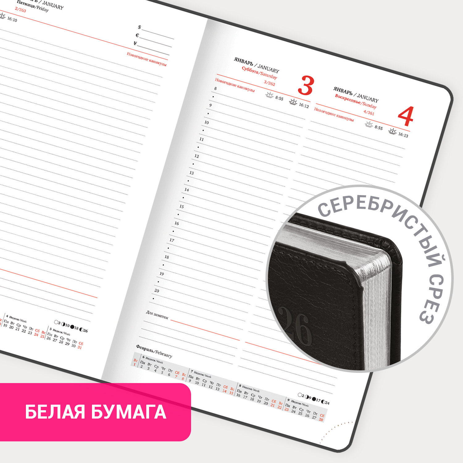 Ежедневник датированный 2026, А5, 138х213 мм, BRAUBERG "Impression", под кожу, черный Код товара: 117510 478,18 ₽ Купить Производитель:BRAUBERG Датированный ежедневник BRAUBERG "Impression" выполнен в классическом стиле. Отличается лаконичным дизайном и аккуратным исполнением. Внутренний блок включает 168 листов белой бумаги плотностью 70 г/м2. Каждая страничка имеет перфорированный угол. Благодаря стандартному формату А5 (138х213 мм) ежедневник удобно использовать как в офисе, так и на выездных деловых встречах. Твердая обложка стилизована под гладкую кожу строгого черного цвета. Материал обложки подходит для горячего тиснения. Серебряный срез придает ежедневнику особый шарм. Дополнением является закладка-ляссе, с помощью которой при необходимости можно быстро открыть ежедневник на нужной странице. Справочный материал дополнительно расширяет функциональность ежедневника. В конце внутреннего блока есть 4 страницы для записей и заметок. Идеально подойдет для офисных работников и людей, занимающихся бизнесом.Производство: КитайТип ежедневника: датированныйФормат: А5Обложка: под гладкую кожуВид обложки: твердаяКоличество листов: 168 шт.Особенности: закладка-ляссе, перфорация уголков, поролоновая прослойка, прострочка по периметру, скругленные углы, справочная информацияСерия: ImpressionГод: 2026Тип застежки: нетОсновной цвет обложки: черныйДополнительный цвет обложки: нетЦвет среза: серебристыйЦвет внутреннего блока: белыйПлотность внутреннего блока: 70 г/м2Высота строки для записи: 4 ммТип крепления: сшивкаПечать блока: 2 краскиПодходит для блинтового тиснения: даПодходит для тиснения фольгой: даПодходит для заливки полимерной смолой: даДлина: 213 ммШирина: 138 ммТолщина: 20 ммВес: 465 грРазмер упаковки: 2.5 × 21.5 × 13.9 смОбъём: 0.001 м3Промежуточная упаковка: 20 штТранспортная упаковка: 20 штШтрих-код: 4606224489377 Файлы Сертификат-1.jpg Сертификат-2.jpg Сертификат-3.jpg Сертификат-4.jpg Сертификат-5.jpg Сертификат-6.jpg Сертификат-7.jpg Сертификат-8.jpg Сертификат-9.jpg Сертификат-10.jpg Сертификат-11.jpg Сертификат-12.jpg Сертификат-13.jpg Сертификат-14.jpg Сертификат-15.jpg Сертификат-16.jpg Сертификат-17.jpg Сертификат-18.jpg Сертификат-19.jpg Сертификат-20.jpg Сертификат-21.jpg Сертификат-22.jpg Сертификат-23.jpg Сертификат-24.jpg Сертификат-25.jpg Сертификат-26.jpg