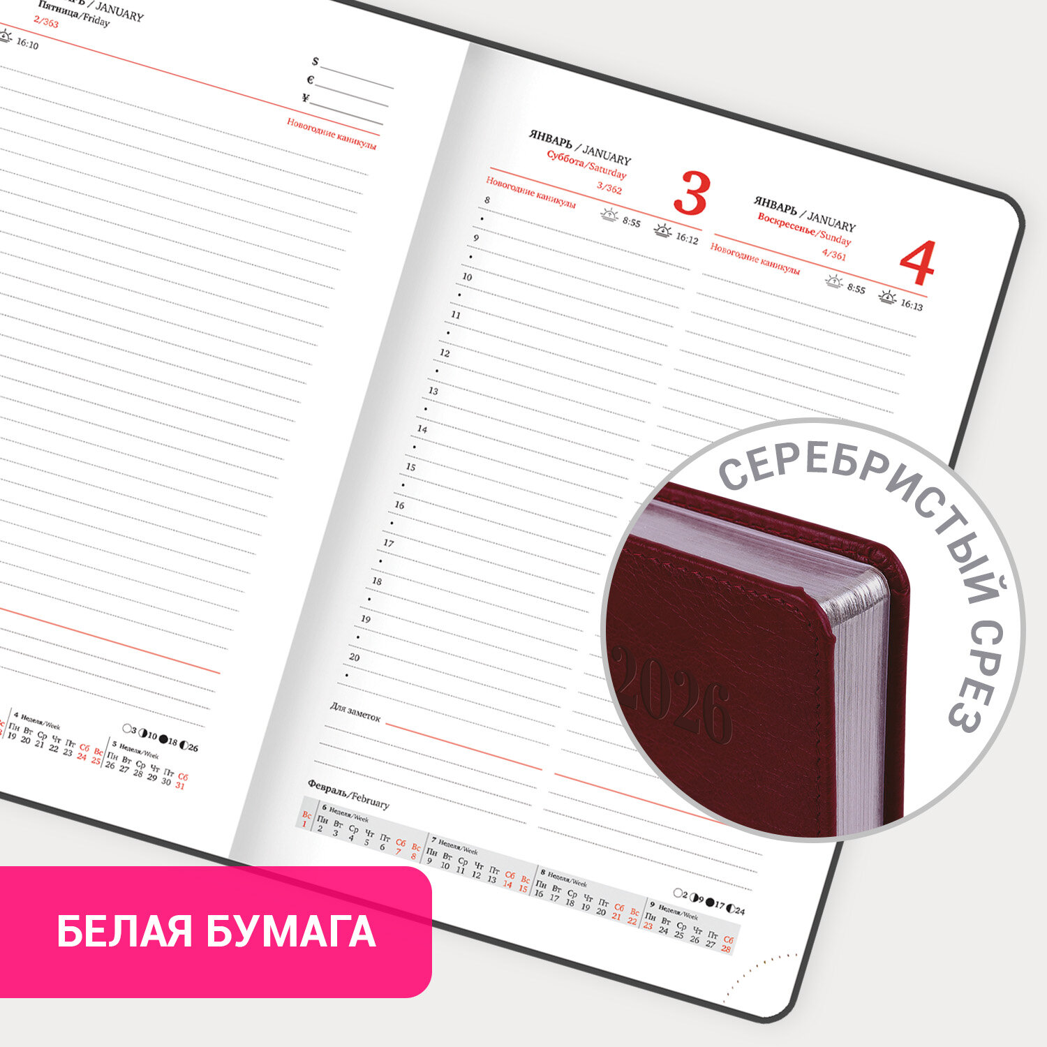 Ежедневник датированный 2026, А5, 138х213 мм, BRAUBERG "Impression", под кожу, бордовый Код товара: 117512 478,18 ₽ Купить Производитель:BRAUBERG Датированный ежедневник BRAUBERG "Impression" выполнен в классическом стиле. Отличается лаконичным дизайном и аккуратным исполнением. Внутренний блок включает 168 листов белой бумаги плотностью 70 г/м2. Каждая страничка имеет перфорированный угол. Благодаря стандартному формату А5 (138х213 мм) ежедневник удобно использовать как в офисе, так и на выездных деловых встречах. Твердая обложка стилизована под гладкую кожу благородного бордового цвета. Материал обложки подходит для горячего тиснения. Серебряный срез придает ежедневнику особый шарм. Дополнением является закладка-ляссе, с помощью которой при необходимости можно быстро открыть ежедневник на нужной странице. Справочный материал дополнительно расширяет функциональность ежедневника. В конце внутреннего блока есть 4 страницы для записей и заметок. Идеально подойдет для офисных работников и людей, занимающихся бизнесом.Производство: КитайТип ежедневника: датированныйФормат: А5Обложка: под гладкую кожуВид обложки: твердаяКоличество листов: 168 шт.Особенности: закладка-ляссе, перфорация уголков, поролоновая прослойка, прострочка по периметру, скругленные углы, справочная информацияСерия: ImpressionГод: 2026Тип застежки: нетОсновной цвет обложки: бордовыйДополнительный цвет обложки: нетЦвет среза: серебристыйЦвет внутреннего блока: белыйПлотность внутреннего блока: 70 г/м2Высота строки для записи: 4 ммТип крепления: сшивкаПечать блока: 2 краскиПодходит для блинтового тиснения: даПодходит для тиснения фольгой: даПодходит для заливки полимерной смолой: даДлина: 213 ммШирина: 138 ммТолщина: 20 ммВес: 464 грРазмер упаковки: 2.5 × 21.4 × 14 смОбъём: 0.001 м3Промежуточная упаковка: 20 штТранспортная упаковка: 20 штШтрих-код: 4606224489391 Файлы Сертификат-1.jpg Сертификат-2.jpg Сертификат-3.jpg Сертификат-4.jpg Сертификат-5.jpg Сертификат-6.jpg Сертификат-7.jpg Сертификат-8.jpg Сертификат-9.jpg Сертификат-10.jpg Сертификат-11.jpg Сертификат-12.jpg Сертификат-13.jpg Сертификат-14.jpg Сертификат-15.jpg Сертификат-16.jpg Сертификат-17.jpg Сертификат-18.jpg Сертификат-19.jpg Сертификат-20.jpg Сертификат-21.jpg Сертификат-22.jpg Сертификат-23.jpg Сертификат-24.jpg Сертификат-25.jpg Сертификат-26.jpg