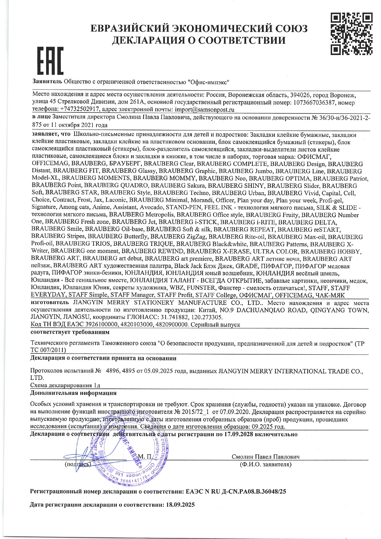 Блок самоклеящийся (стикеры), фигурный BRAUBERG, НЕОНОВЫЙ "Ассорти", 3 цвета х 50 листов, европодвес Код товара: 122711 209,18 ₽ Купить Производитель:BRAUBERG Бумага для заметок с клейким краем BRAUBERG рекомендуется для использования в процессе совещаний, обучения, мозговых штурмов. Идеально подойдет для работников офиса и руководителей. Набор из 3 фигурных стикеров неоновых цветов (желтый, розовый, зеленый) в форме яблока, лимона, сердца 70х70 мм состоит из 3 блоков по 50 листов. Плотность бумаги составляет 75 г/м2. Клейкий слой - 35 Н/м. Легко клеятся к любой поверхности. Не оставляют следов. Упакованы в полиэтиленовый пакет с европодвесом. Чтобы стикеры держались дольше, следуйте рекомендациям по использованию: - Отделяйте листы от блока вдоль клеевой полосы, в горизонтальном направлении. Это поможет избежать скручивания и последующего отклеивания стикера. - Убедитесь в отсутствии пыли и грязи на поверхности для приклеивания. Так вы обеспечите наиболее продолжительный срок службы клеевого слоя.Производство: КитайРазмер: 70х70 ммКоличество блоков: 3 шт.Количество листов в блоке: 50 шт.Количество цветов: 3Форма: ассортиСерия: FigureКлейкость: 35 Н/мПлотность бумаги: 75 г/м2Цвет: ассортиТон: неонУпаковка: пакет с европодвесомВес: 56 грРазмер упаковки: 0.6 × 22.9 × 8.2 смОбъём: 0.0002 м3Промежуточная упаковка: 24 штТранспортная упаковка: 288 штШтрих-код: 4606224023212 Сертификат-1.jpg Сертификат-2.jpg Сертификат-3.jpg