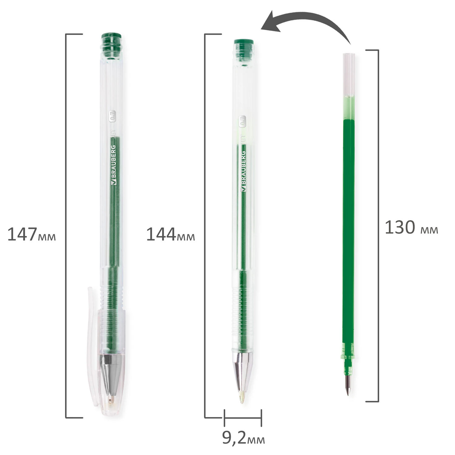 Ручки гелевые BRAUBERG "Jet", НАБОР 6 ЦВЕТОВ, узел 0,7 мм, линия письма 0,5 мм Код товара: 141037 366,81 ₽ Купить Производитель:BRAUBERG Гелевые ручки BRAUBERG "Jet" - набор ярких и насыщенных цветов на каждый день для работы в офисе и учебы. Ручка имеет круглый прозрачный корпус и рифление в зоне захвата для удобства письма. Сменный стержень длиной 130 мм со стандартным наконечником позволит использовать ручку максимально долго. Диаметр пишущего узла, равный 0,7 мм, создает линию письма, равную 0,5 мм. Набор включает гелевые ручки из 6 различных цветов чернил: красный, синий, черный, фиолетовый, желтый, зеленый. Рекомендован для детского творчества.Производство: КитайКоличество в упаковке: 6 шт.Цвет чернил: ассортиЭффект чернил: классическийТолщина линии письма: 0.5 ммДиаметр пишущего узла: 0.7 ммСерия: JetДлина сменного стержня: 130 ммФорма наконечника: стандартныйФорма корпуса: круглаяУпаковка: пластиковый футляр с подвесомСрок годности: 60 месВес: 55 грРазмер упаковки: 1.6 × 15 × 7.3 смОбъём: 0.0002 м3Промежуточная упаковка: 12 штТранспортная упаковка: 144 штШтрих-код: 4606224051789 Сертификат-1.jpg Сертификат-2.jpg Сертификат-3.jpg