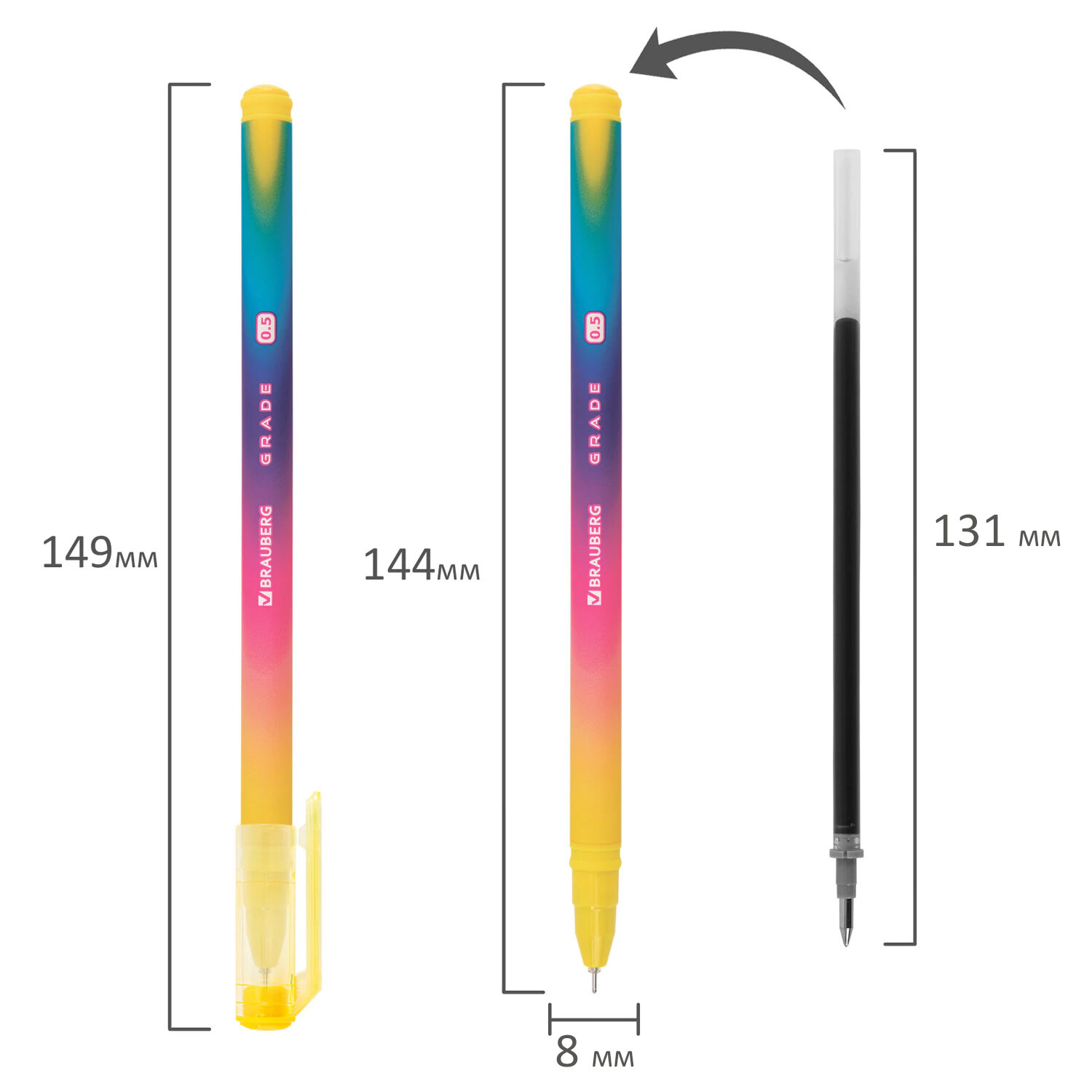 Ручка гелевая BRAUBERG GRADE NEON, ЧЕРНАЯ, игольчатый узел 0,5 мм, линия письма 0,3 мм Код товара: 144285 53,47 ₽ Купить Производитель:BRAUBERG Ручка гелевая BRAUBERG GRADE NEON в ярких неоновых оттенках с покрытием soft-touch обеспечивает комфортное и качественное письмо. Гелевая ручка представлена в четырех цветовых вариациях неоновых оттенков с лёгким эффектом градиента. Благодаря покрытию soft-touch удобно ложится в руке и не скользит при письме. Диаметр пишущего узла 0,5 мм создает тонкую линию толщиной 0,3 мм. Гелевые чернила плавно и мягко ложатся на бумагу, обеспечивая комфортное письмо. Черный цвет чернил делает ручку подходящей для ведения записей и создания скетчей. Подходит для ЕГЭ и ОГЭ.Производство: КитайЦвет чернил: черныйТолщина линии письма: 0.3 ммДиаметр пишущего узла: 0.5 ммФорма наконечника: игольчатыйКоличество в комплекте: 1 шт.Эффект чернил: гелевыеПодходит для ЕГЭ/ОГЭ: даСерия: GRADE GELДлина сменного стержня: 131 ммЭргономичная зона захвата: нетЦвет корпуса: неоновый ассортиФорма корпуса: круглаяПокрытие корпуса: Soft-touchДлина письма: 700 мУпаковка: пластиковая тубаСрок годности: 60 месВес: 10 грРазмер упаковки: 1 × 14.9 × 1.4 смПромежуточная упаковка: 30 штТранспортная упаковка: 1080 штШтрих-код: 4606224447117 Сертификат-1.jpg Сертификат-2.jpg Сертификат-3.jpg