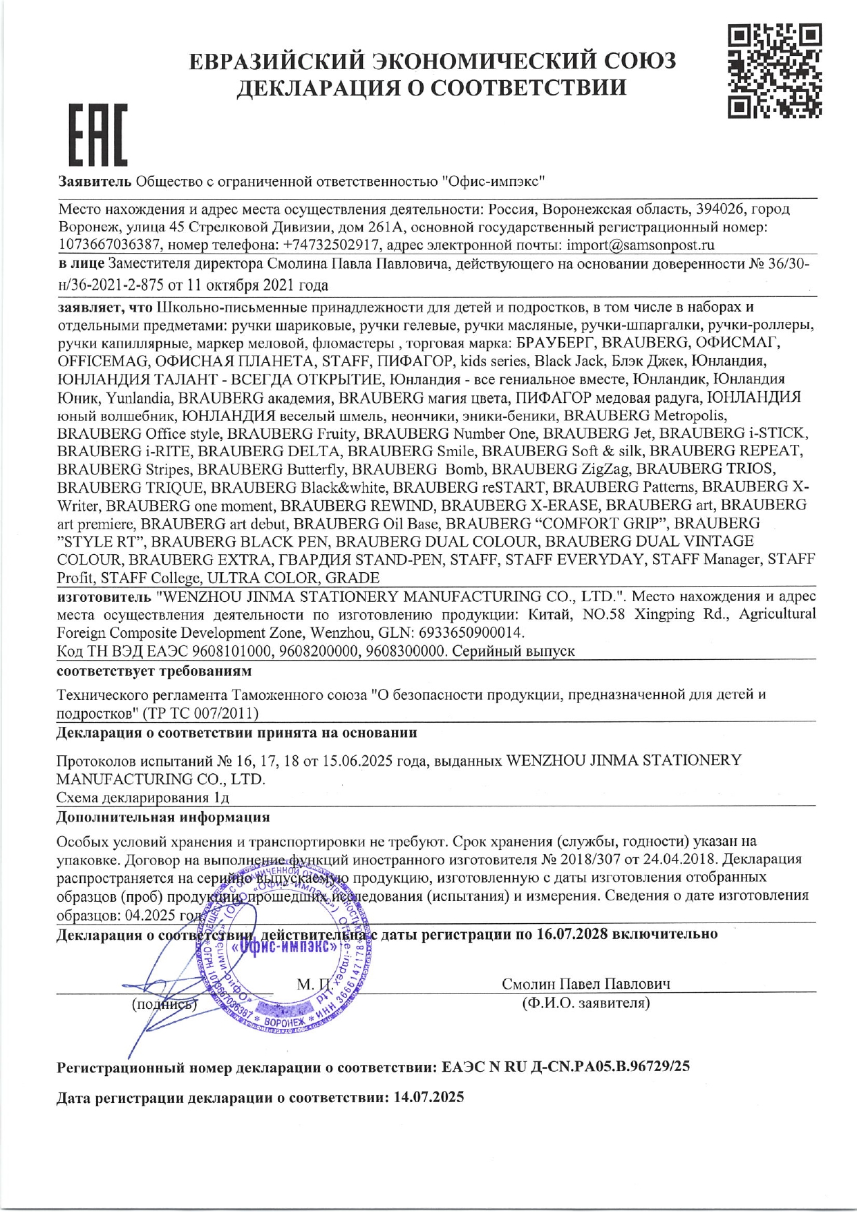 Ручка гелевая BRAUBERG KIDS MIX, СИНЯЯ, корпус ассорти, игольчатый узел 0,5 мм, линия письма 0,3 мм Код товара: 144286 53,47 ₽ Купить Производитель:BRAUBERG Ручка гелевая BRAUBERG KIDS MIX в забавном дизайне с покрытием soft-touch обеспечивает комфортное и качественное письмо. Гелевая ручка представлена в четырех дизайнах с изображением популярных блюд. Благодаря покрытию soft-touch удобно ложится в руке и не скользит при письме. Диаметр пишущего узла 0,5 мм создает тонкую линию толщиной 0,3 мм. Гелевые чернила плавно и мягко ложатся на бумагу, обеспечивая комфортное письмо. Синий цвет чернил делает ручку подходящей для ведения записей во время учебы.Производство: КитайЦвет чернил: синийТолщина линии письма: 0.3 ммДиаметр пишущего узла: 0.5 ммФорма наконечника: игольчатыйКоличество в комплекте: 1 шт.Эффект чернил: гелевыеСерия: KIDS MIXДлина сменного стержня: 131 ммЭргономичная зона захвата: нетЦвет корпуса: ассортиФорма корпуса: круглаяПокрытие корпуса: Soft-touchДлина письма: 700 мУпаковка: пластиковая тубаСрок годности: 60 месВес: 10 грРазмер упаковки: 1 × 14.7 × 1.4 смПромежуточная упаковка: 30 штТранспортная упаковка: 1080 штШтрих-код: 4606224447124 Сертификат-1.jpg Сертификат-2.jpg Сертификат-3.jpg