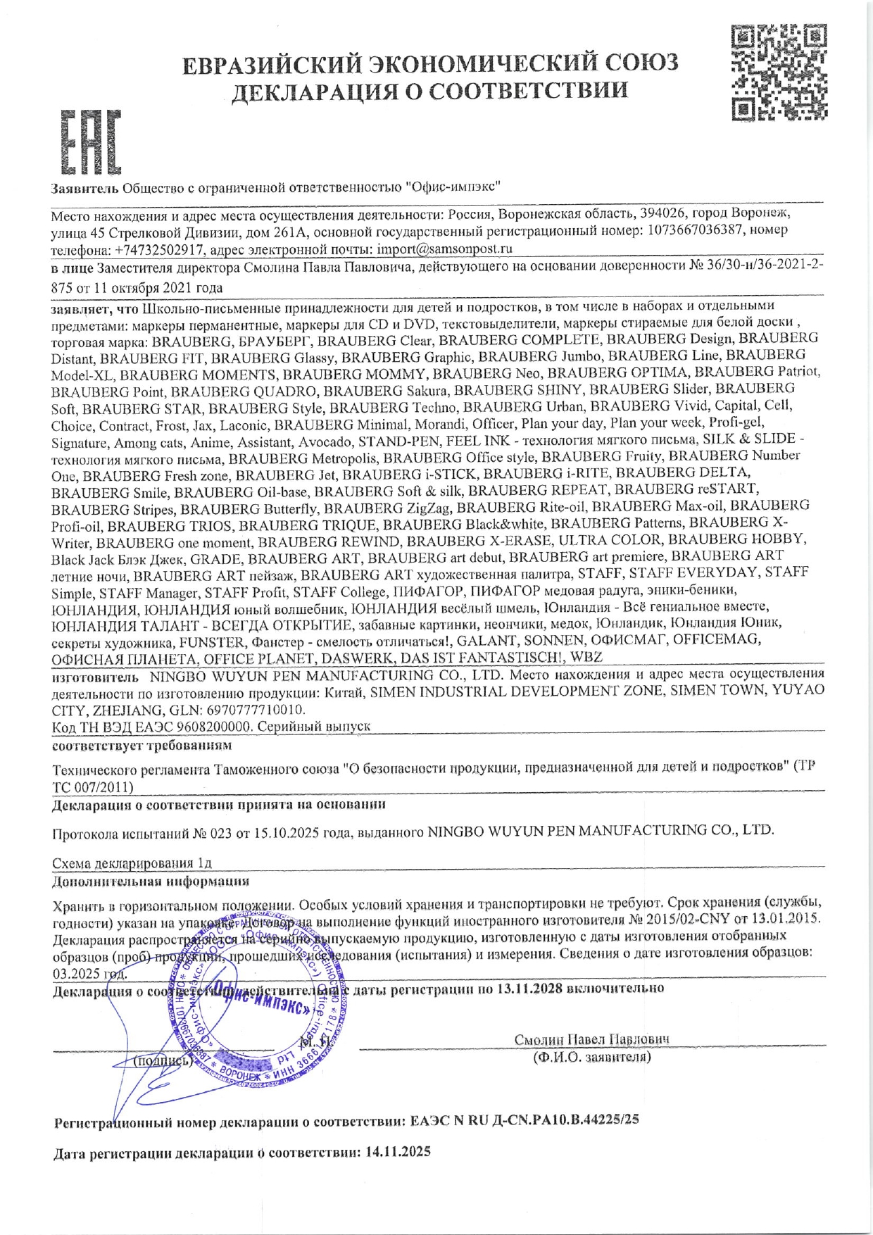Маркер перманентный BRAUBERG "Classic", СИНИЙ, круглый наконечник, 3 мм, с клипом Код товара: 150301 85,65 ₽ Купить Производитель:BRAUBERG Надежный маркер BRAUBERG "Classic" отлично подходит для повседневного использования. Предназначен для письма на любой поверхности: бумага, полиэтилен, дерево, стекло, металл, натуральная кожа, ткань, камень, плитка. Особая нестираемая основа перманентного маркера обеспечивает такие качества, как стойкость к воздействию воды, ультрафиолета, низких и высоких температур. Цвет корпуса маркера соответствует цвету чернил. Фетровый наконечник обладает повышенной износостойкостью и обеспечивает экономный расход чернил. Отличается продленной линией письма. Изделие не перезаправляется. Плотно закрывается колпачком, что предотвращает высыхание наконечника и чернил. Толщина линии письма - 1-3 мм в зависимости от угла наклона. Спиртовая основа быстросохнущих чернил. Круглая форма корпуса из пластика, диаметр которого 17 мм.Производство: КитайЦвет чернил: синийКоличество в комплекте: 1 шт.Форма наконечника: круглыйМинимальная толщина линии письма: 1 ммМаксимальная толщина линии письма: 3 ммСерия: ClassicПодходит для левшей: даВодостойкие чернила: даПовышенная светостойкость: даБыстросохнущие чернила: даНаконечник устойчив к повреждению и истиранию: даФорма корпуса: круглаяДиаметр корпуса: 17 ммМатериал корпуса: пластикНаличие клипа: даОснова чернил: спиртоваяУпаковка: картонная коробкаСрок годности: 48 месВес: 18 грРазмер упаковки: 1.7 × 13.4 × 2.1 смОбъём: 0.0001 м3Промежуточная упаковка: 10 штТранспортная упаковка: 800 штШтрих-код: 4606224013725 Сертификат-1.jpg Сертификат-2.jpg Сертификат-3.jpg