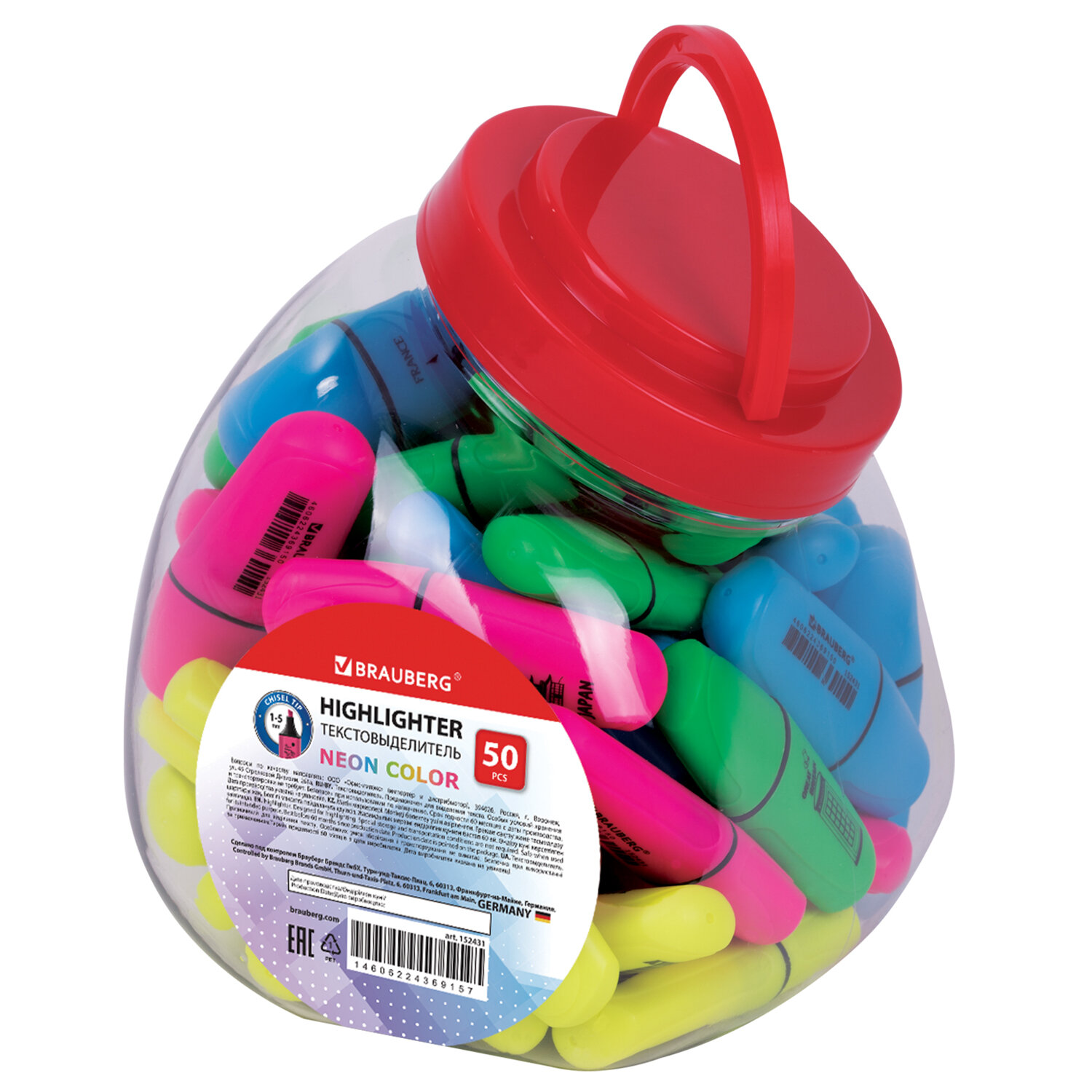 Текстовыделитель мини BRAUBERG "NEON Mini", АССОРТИ В ПЛАСТИКОВОЙ БАНКЕ, линия 1-5 мм Код товара: 152431 23,61 ₽ Купить Производитель:BRAUBERG Текстовыделители BRAUBERG "NEON Mini" предназначены для выделения текста на бумаге любого типа. Текстовыделители неоновых цветов: желтый, зеленый, розовый, голубой, имеют овальную форму корпуса, диаметр которого 27 мм. Скошенный наконечник имеет толщину линии письма от 1 до 5 мм, что обеспечивает удобство при работе с текстом, напечатанным мелким шрифтом, или таблицами. Благодаря особой водной основе чернил текстовыделитель не высыхает без колпачка в течение 4 часов. Текстовыделитель обладает экономным расходом чернил, при этом длина линии письма достигает 250 метров. Чернила быстро впитываются и тем самым предотвращают размазывание в процессе использования. Цвет колпачка и корпуса текстовыделителя соответствует цвету чернил. Поставляются в тубе по 50 штук, отлично подходят для размещения в розничном магазине.Производство: КитайЦвет чернил: ассортиКоличество в комплекте: 1 шт.Форма наконечника: скошенныйСпецэффект цвета чернил : неоновыйОснова чернил: воднаяСерия: BRAUBERG MiniМин. толщина линии письма: 1 ммМакс. толщина линии письма: 5 ммФорма корпуса: овальнаяДиаметр корпуса: 27 ммУпаковка: пластиковая банкаСрок годности: 60 месВес: 14 грРазмер упаковки: 1.6 × 7.3 × 2.6 смОбъём: 0.0001 м3Промежуточная упаковка: 50 штТранспортная упаковка: 800 штШтрих-код: 4606224369150 Сертификат-1.jpg Сертификат-2.jpg Сертификат-3.jpg
