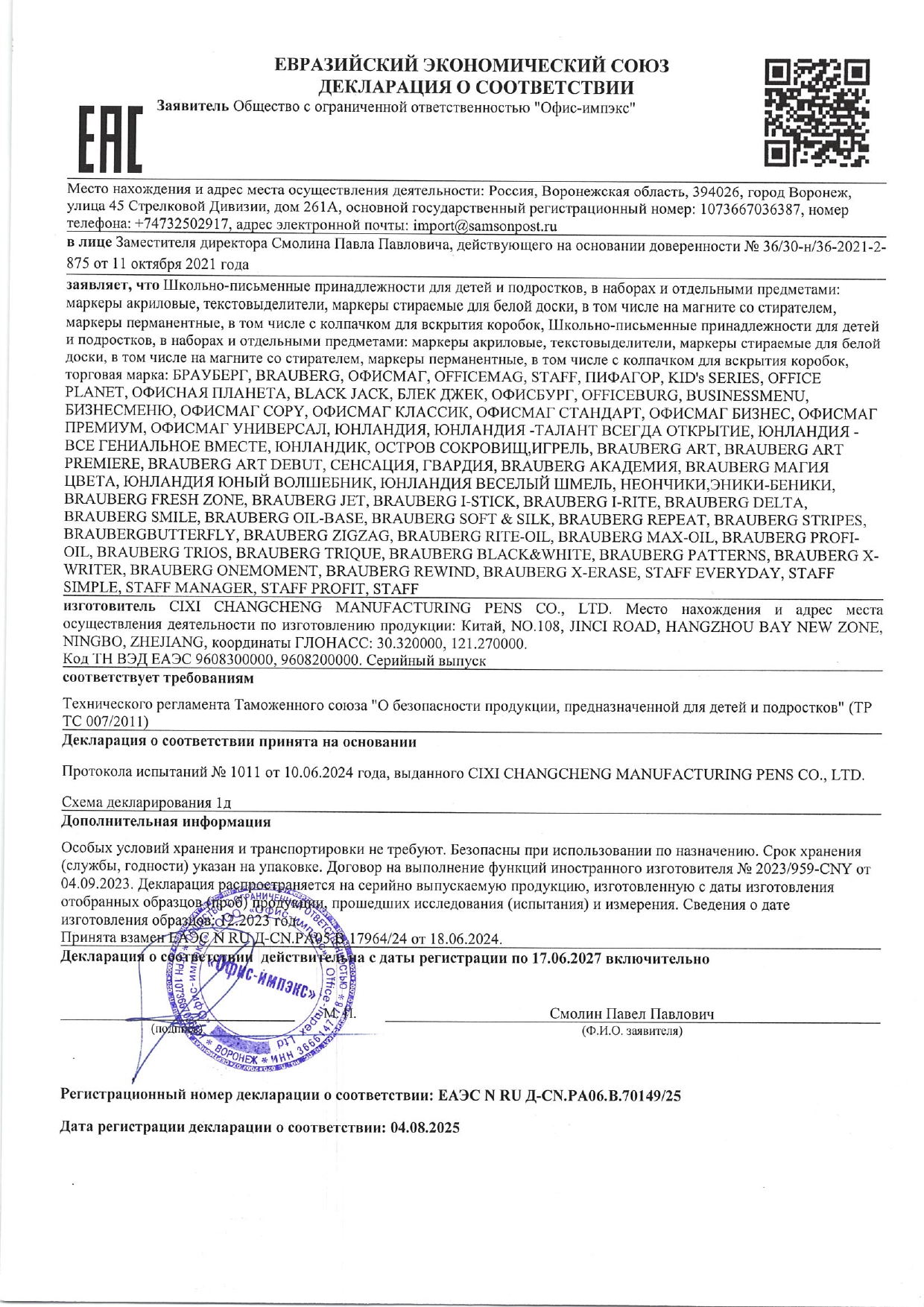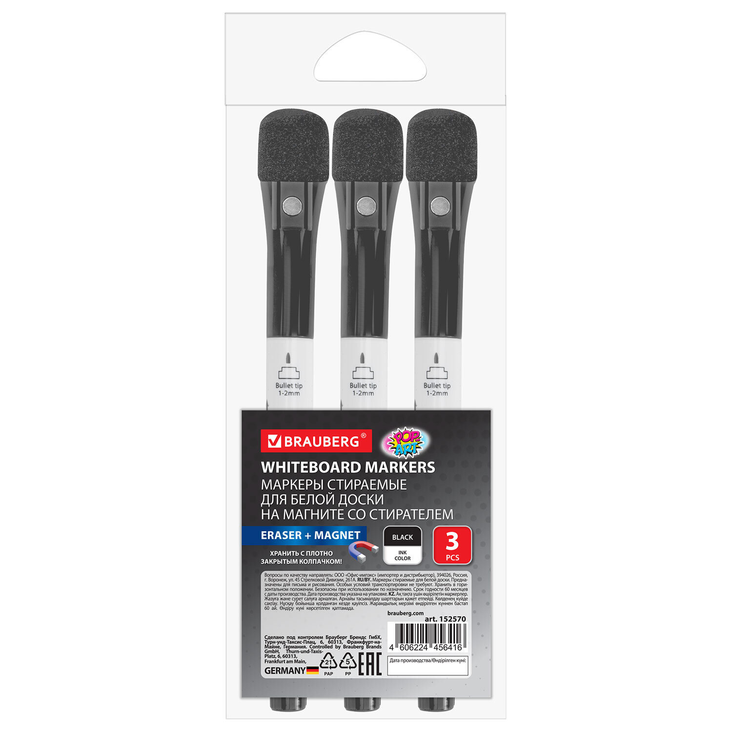 Маркеры на магните со стирателем для белой доски и планера, 3 шт., черные, BRAUBERG POP-ART, 1-2 мм Код товара: 152570 128,6 ₽ Купить Производитель:BRAUBERG Набор стираемых маркеров для доски и магнитного планера BRAUBERG POP-ART предназначен для использования на изделиях с магнитно-маркерной поверхностью и стекле. Идеально подходит для рисования, игр, визуализации учебных процессов. Маркеры для белой доски и планера черного цвета обладают круглым корпусом из пластика, диаметр которого 10 мм. Пулевидный наконечник обеспечивает толщину линии письма от 1 до 2 мм, что позволяет проводить тонкие линии и использовать маркеры на небольших магнитных досках и планерах. Колпачок маркера оснащен магнитом, что делает его удобным в использовании и позволяет крепить маркер прямо на доске, планере или любом другом магнитном рабочем месте. Кроме того, в колпачке имеется удобная губка-стиратель для удаления записей. Чернила на спиртовой основе быстро высыхают и легко стираются сухой губкой, не оставляя разводов. Изделие не подлежит перезаправке. Цвет колпачка соответствует цвету чернил.Производство: КитайЦвет: черныйСерия: POP-ARTТолщина линии письма: 1, 1,5, 2Наконечник: пулевидныйКоличество в комплекте: 3 шт.Наличие магнитного держателя: даНаличие стирателя: даОснова чернил: спиртоваяЧернила стираются сухой губкой: даНе протекает при перепаде давления: даМатериал корпуса: пластикСрок годности: 60 месВес: 31 грРазмер упаковки: 1.8 × 15.3 × 6.9 смОбъём: 0.0002 м3Промежуточная упаковка: 24 штТранспортная упаковка: 288 штШтрих-код: 4606224456416 Сертификат-1.jpg Сертификат-2.jpg Сертификат-3.jpg