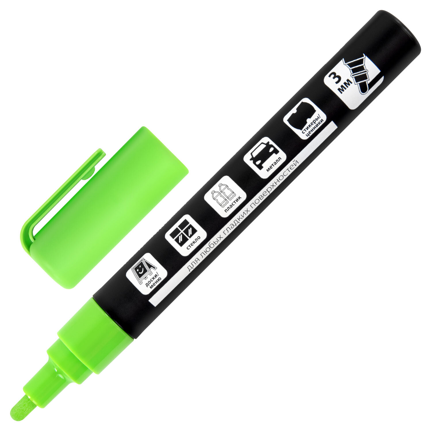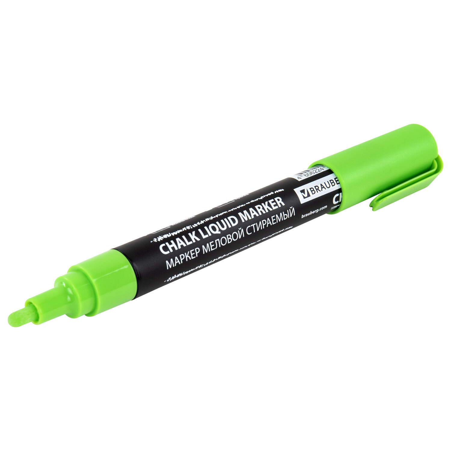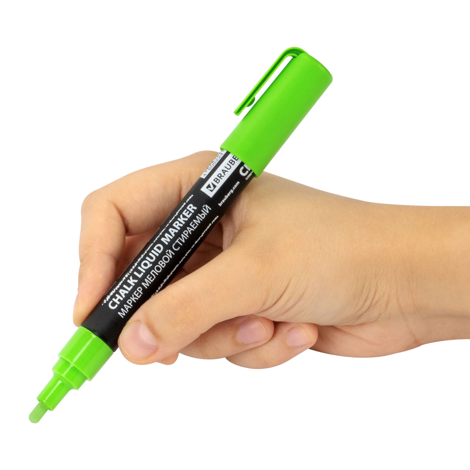 Маркер меловой CHALK LIQUID MARKER, ЗЕЛЕНЫЙ, 3 мм, стираемый, BRAUBERG "CHALK" Код товара: 152587 87,57 ₽ Купить Производитель:BRAUBERG Стираемый меловой маркер BRAUBERG "CHALK" предназначен для создания рисунков и надписей на гладких и прозрачных невпитывающих поверхностях (например, зеркалах, стекле, меловой пленке). Подходит для школьных занятий, идеальны для детского творчества! СПОСОБ ПРИМЕНЕНИЯ: 1. Перед использованием хорошо встряхнуть с закрытым колпачком. 2. Снять колпачок, надавить на наконечник, дождаться, когда чернила полностью пропитают его. 3. После использования плотно закрыть колпачок. Рисунок получается плотный и яркий. Чернила на водно-меловой основе зеленого цвета без резкого запаха. Толщина линии письма – от 1 мм до 3 мм, зависит от угла наклона мелового маркера. Круглый корпус выполнен из пластика. Обладает следующими преимуществами: - флуоресцентные чернила светятся в УФ-свете; - повышенная светостойкость; - пулевидный наконечник устойчив к повреждению и истиранию.Производство: КитайЦвет чернил: зеленыйСерия: ChalkКоличество в комплекте: 1 шт.Форма наконечника: пулевидныйМинимальная толщина линии письма: 1 ммМаксимальная толщина линии письма: 3 ммСпецэффект чернил: -Чернила светятся в УФ-свете: даПовышенная светостойкость: даНаконечник устойчив к повреждению и истиранию: даТип стирания: сухостираемыйФорма корпуса: круглаяДиаметр корпуса: 15 ммМатериал корпуса: пластикНаличие клипа: даОснова чернил: меловаяУпаковка: картонная коробкаСрок годности: 60 месВес: 25 грРазмер упаковки: 1.6 × 14.6 × 2 смОбъём: 0.0001 м3Промежуточная упаковка: 10 штТранспортная упаковка: 540 штШтрих-код: 4606224462257 Сертификат-1.jpg Сертификат-2.jpg Сертификат-3.jpg