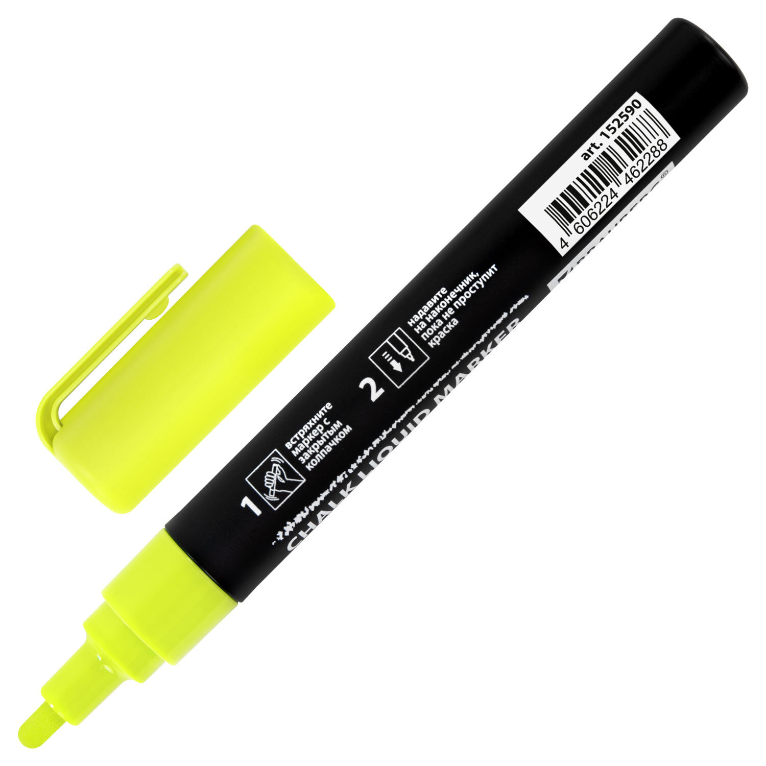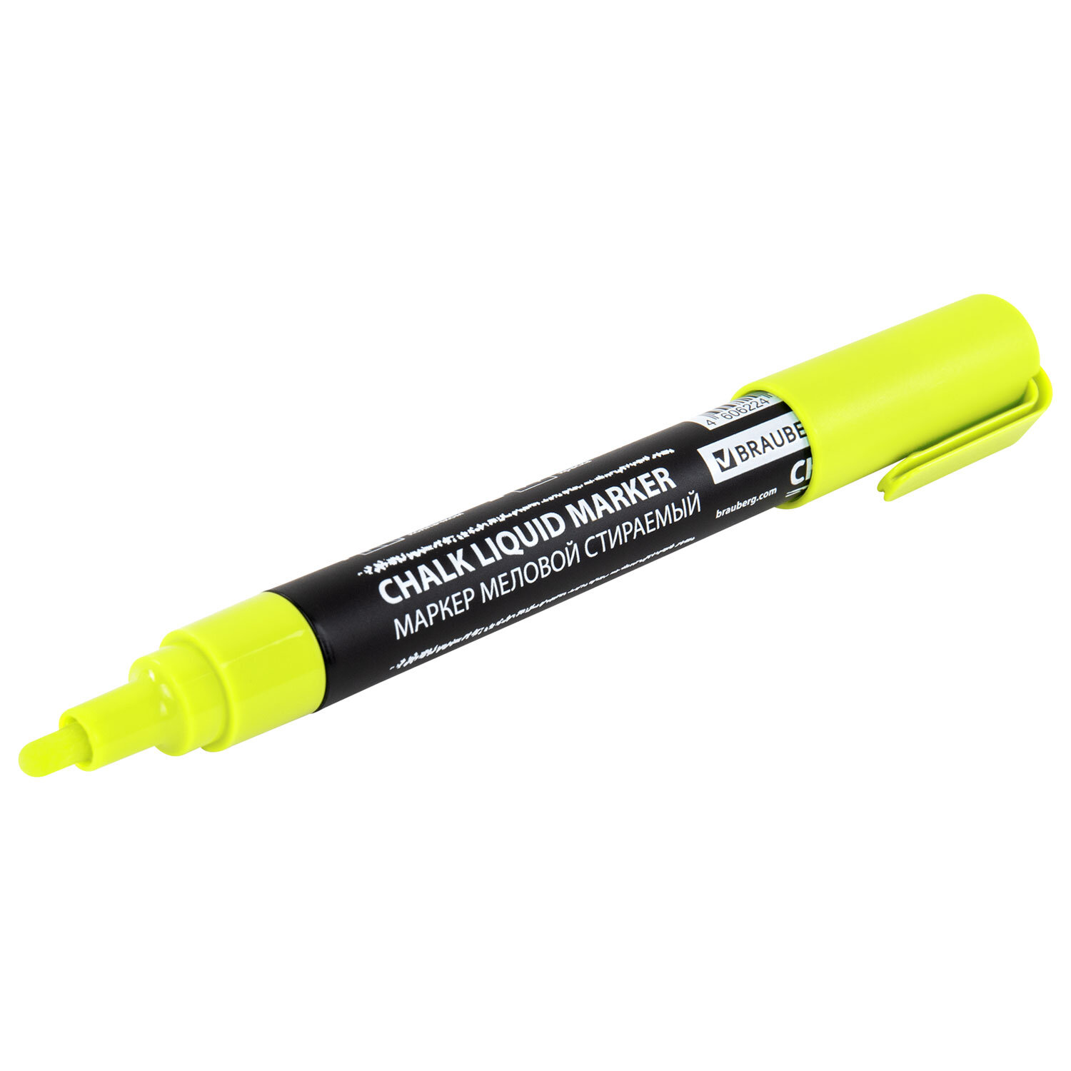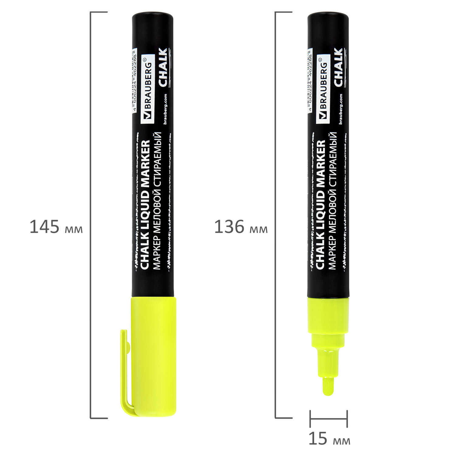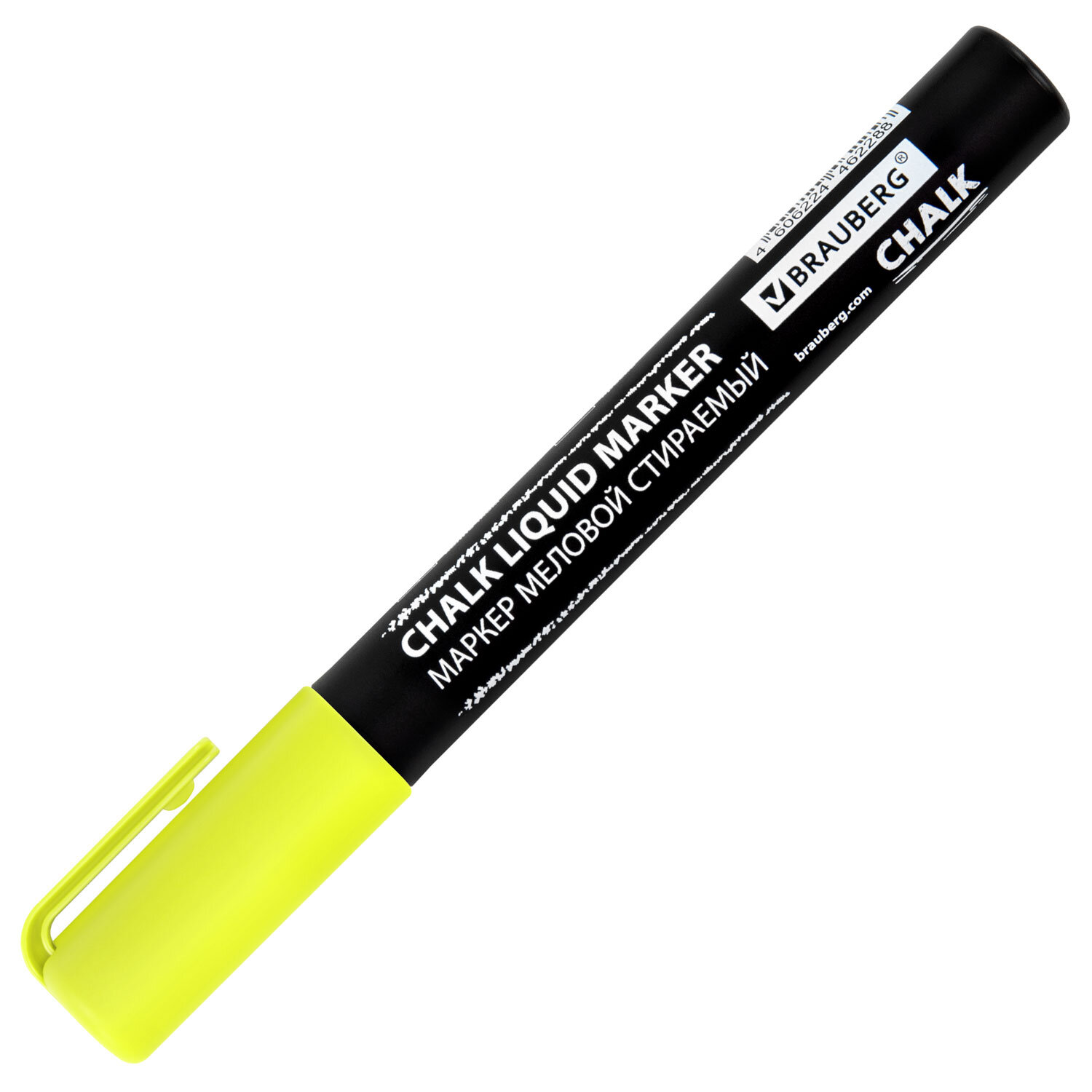 Маркер меловой CHALK LIQUID MARKER, ЖЕЛТЫЙ, 3 мм, стираемый, BRAUBERG "CHALK" Код товара: 152590 87,57 ₽ Купить Производитель:BRAUBERG Стираемый меловой маркер BRAUBERG "CHALK" предназначен для создания рисунков и надписей на гладких и прозрачных невпитывающих поверхностях (например, зеркалах, стекле, меловой пленке). Подходит для школьных занятий, идеальны для детского творчества! СПОСОБ ПРИМЕНЕНИЯ: 1. Перед использованием хорошо встряхнуть с закрытым колпачком. 2. Снять колпачок, надавить на наконечник, дождаться, когда чернила полностью пропитают его. 3. После использования плотно закрыть колпачок. Рисунок получается плотный и яркий. Чернила на водно-меловой основе желтого цвета без резкого запаха. Толщина линии письма – от 1 мм до 3 мм, зависит от угла наклона мелового маркера. Круглый корпус выполнен из пластика. Обладает следующими преимуществами: - флуоресцентные чернила светятся в УФ-свете; - повышенная светостойкость; - пулевидный наконечник устойчив к повреждению и истиранию.Производство: КитайЦвет чернил: желтыйСерия: ChalkКоличество в комплекте: 1 шт.Форма наконечника: пулевидныйМинимальная толщина линии письма: 1 ммМаксимальная толщина линии письма: 3 ммСпецэффект чернил: -Чернила светятся в УФ-свете: даПовышенная светостойкость: даНаконечник устойчив к повреждению и истиранию: даТип стирания: сухостираемыйФорма корпуса: круглаяДиаметр корпуса: 15 ммМатериал корпуса: пластикНаличие клипа: даОснова чернил: меловаяУпаковка: картонная коробкаСрок годности: 60 месВес: 25 грРазмер упаковки: 1.6 × 14.6 × 2 смОбъём: 0.0001 м3Промежуточная упаковка: 10 штТранспортная упаковка: 540 штШтрих-код: 4606224462288 Сертификат-1.jpg Сертификат-2.jpg Сертификат-3.jpg