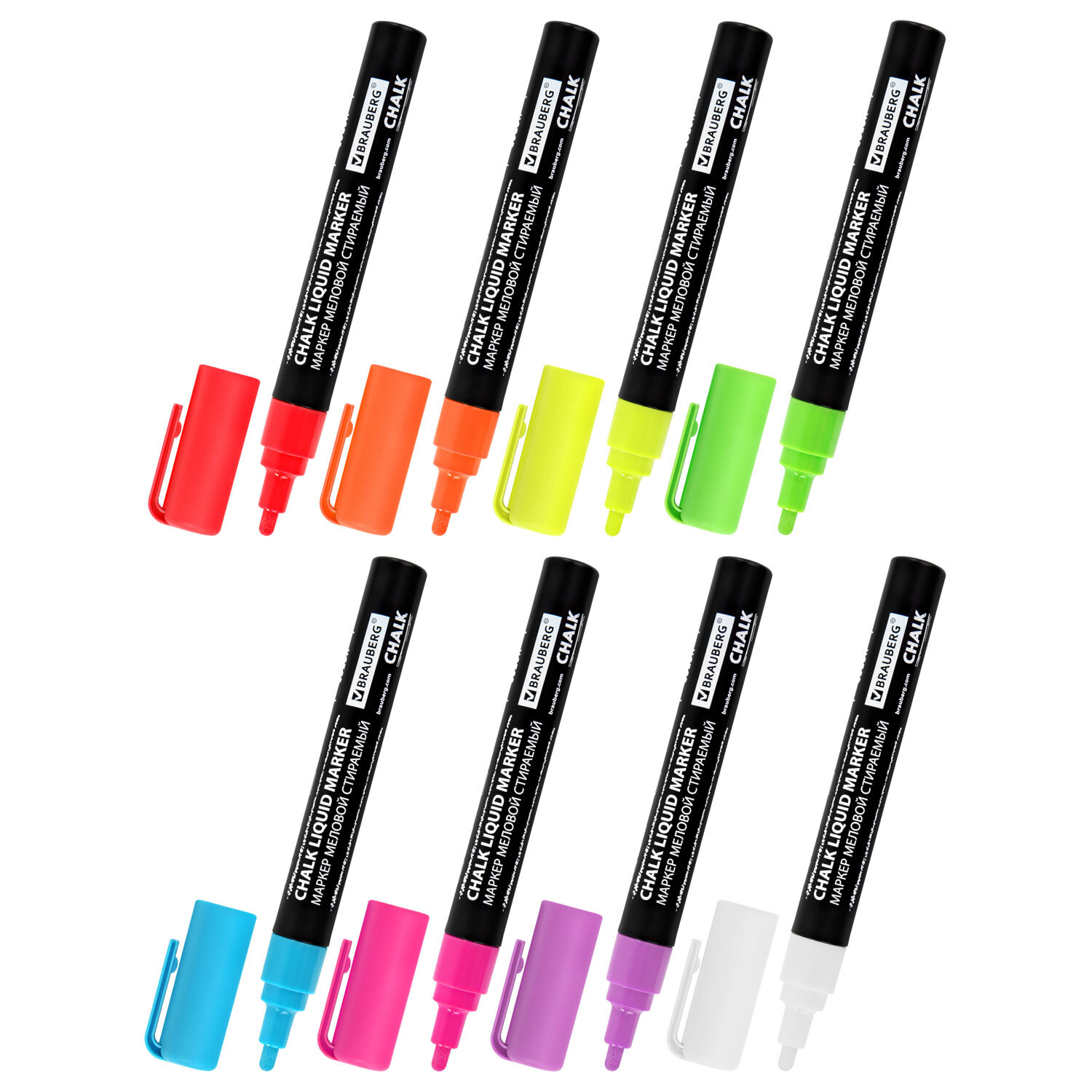 Маркеры меловые CHALK LIQUID MARKER, НЕОН, НАБОР 8 ЦВЕТОВ, 3 мм, стираемые, BRAUBERG "CHALK" Код товара: 152597 648,06 ₽ Купить Производитель:BRAUBERG Стираемые меловые маркеры BRAUBERG "CHALK" предназначены для создания рисунков и надписей на гладких и прозрачных невпитывающих поверхностях (например, зеркалах, стекле, меловой пленке). Подходят для школьных занятий, идеальны для детского творчества! СПОСОБ ПРИМЕНЕНИЯ: 1. Перед использованием хорошо встряхнуть с закрытым колпачком. 2. Снять колпачок, надавить на наконечник, дождаться, когда чернила полностью пропитают его. 3. После использования плотно закрыть колпачок. В наборе 8 меловых маркеров неоновых цветов: оранжевый, фиолетовый, красный, синий, розовый, зеленый, белый и желтый. Рисунок получается плотный и яркий. Чернила на водно-меловой основе без резкого запаха. Толщина линии письма – от 1 мм до 3 мм, зависит от угла наклона мелового маркера. Круглый корпус выполнен из пластика. Обладают следующими преимуществами: - флуоресцентные чернила светятся в УФ-свете; - повышенная светостойкость; - пулевидный наконечник устойчив к повреждению и истиранию.Производство: КитайЦвет чернил: неоновый ассортиСерия: ChalkКоличество в комплекте: 8 шт.Форма наконечника: пулевидныйМинимальная толщина линии письма: 1 ммМаксимальная толщина линии письма: 3 ммСпецэффект чернил: -Чернила светятся в УФ-свете: даПовышенная светостойкость: даНаконечник устойчив к повреждению и истиранию: даТип стирания: сухостираемыйФорма корпуса: круглаяДиаметр корпуса: 15 ммМатериал корпуса: пластикНаличие клипа: даОснова чернил: меловаяУпаковка: картонная коробкаСрок годности: 60 месВес: 213 грРазмер упаковки: 2.1 × 17.8 × 14 смОбъём: 0.0008 м3Промежуточная упаковка: 8 штТранспортная упаковка: 72 штШтрих-код: 4606224462356 Сертификат-1.jpg Сертификат-2.jpg Сертификат-3.jpg
