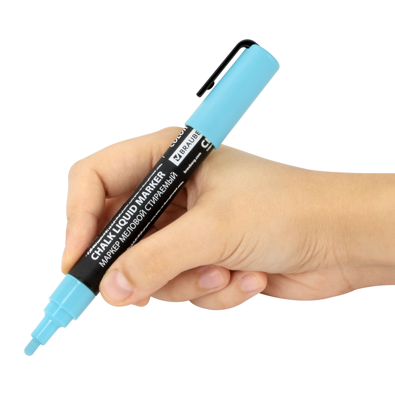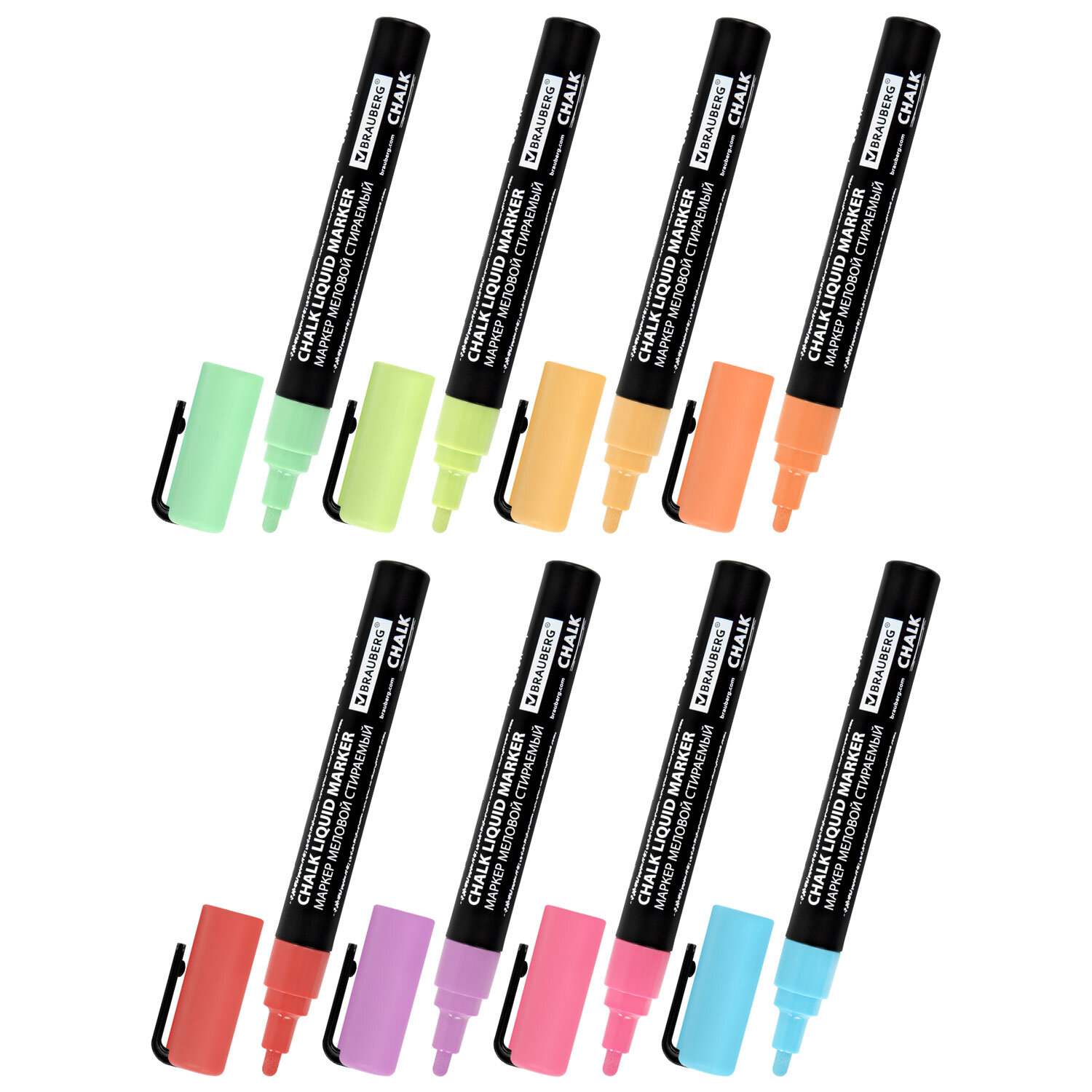 Маркеры меловые CHALK LIQUID MARKER, ПАСТЕЛЬ, НАБОР 8 ЦВЕТОВ, 3 мм, стираемые, BRAUBERG "CHALK" Код товара: 152598 575,37 ₽ Купить Производитель:BRAUBERG Стираемые меловые маркеры BRAUBERG "CHALK" предназначены для создания рисунков и надписей на гладких и прозрачных невпитывающих поверхностях (например, зеркалах, стекле, меловой пленке). Подходят для школьных занятий, идеальны для детского творчества! СПОСОБ ПРИМЕНЕНИЯ: 1. Перед использованием хорошо встряхнуть с закрытым колпачком. 2. Снять колпачок, надавить на наконечник, дождаться, когда чернила полностью пропитают его. 3. После использования плотно закрыть колпачок. В наборе 8 меловых маркеров пастельных цветов: персиковый, лавандовый, алый, бирюзовый, пастельный розовый, мятный, салатовый и ванильный. Рисунок получается плотный и яркий. Чернила на водно-меловой основе без резкого запаха. Толщина линии письма – от 1 мм до 3 мм, зависит от угла наклона мелового маркера. Круглый корпус выполнен из пластика. Обладают следующими преимуществами: - флуоресцентные чернила с эффектом ПАСТЕЛЬ; - повышенная светостойкость; - пулевидный наконечник устойчив к повреждению и истиранию.Производство: КитайЦвет чернил: пастельный ассортиСерия: ChalkКоличество в комплекте: 8 шт.Форма наконечника: пулевидныйМинимальная толщина линии письма: 1 ммМаксимальная толщина линии письма: 3 ммСпецэффект чернил: пастельныйЧернила светятся в УФ-свете: даПовышенная светостойкость: даНаконечник устойчив к повреждению и истиранию: даТип стирания: сухостираемыйФорма корпуса: круглаяДиаметр корпуса: 15 ммМатериал корпуса: пластикНаличие клипа: даОснова чернил: меловаяУпаковка: картонная коробкаСрок годности: 60 месВес: 213 грРазмер упаковки: 2.1 × 17.6 × 14 смОбъём: 0.0008 м3Промежуточная упаковка: 8 штТранспортная упаковка: 72 штШтрих-код: 4606224462363 Сертификат-1.jpg Сертификат-2.jpg Сертификат-3.jpg