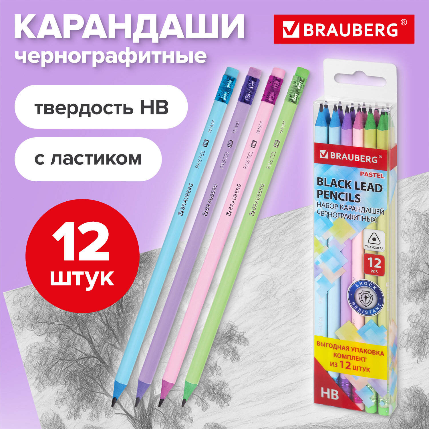 Набор карандашей чернографитных с ластиком BRAUBERG "PASTEL" 12 шт., HB Код товара: 181997 223,63 ₽ Купить Производитель:BRAUBERG Карандаши чернографитные BRAUBERG "PASTEL" – идеальные помощники для рисования, создания эскизов и графики. Функциональные и практичные карандаши в четырех трендовых пастельных цветах (без возможности выбора цвета). Каждый карандаш оснащен ластиком из безопасного материала, позволяющим с легкостью исправлять ошибки и корректировать штрихи. Ластик выполнен в цвете корпуса карандаша. Эргономичная трехгранная форма корпуса обеспечит дополнительный комфорт при использовании. Карандаши не сломаются при падении. Безопасны для детей. Поставляются заточенными. Благодаря универсальной твердости HB карандаши BRAUBERG "PASTEL" удобно использовать на учебе, для работы в офисе или для повседневных дел. Упакованы в прозрачный ПВХ-бокс с печатью и европодвесом.Производство: КитайТвердость: HBЗаточенный: даНаличие ластика: даДиаметр грифеля: 2.2 ммКоличество карандашей в упаковке: 12 шт.Количество твердостей в наборе: 1Серия: PastelФорма корпуса: трехграннаяУдаропрочный грифель: даДлина карандаша: 190 ммМатериал корпуса: пластикЦвет корпуса: пастельный ассортиДизайн: без дизайнаКоличество дизайнов в упаковке: 4 шт.Упаковка: ПВХ-бокс с европодвесомВес: 112 грРазмер упаковки: 1.8 × 21.2 × 4.8 смОбъём: 0.0002 м3Промежуточная упаковка: 12 штТранспортная упаковка: 144 штШтрих-код: 4606224422053 Сертификат-1.jpg Сертификат-2.jpg Сертификат-3.jpg