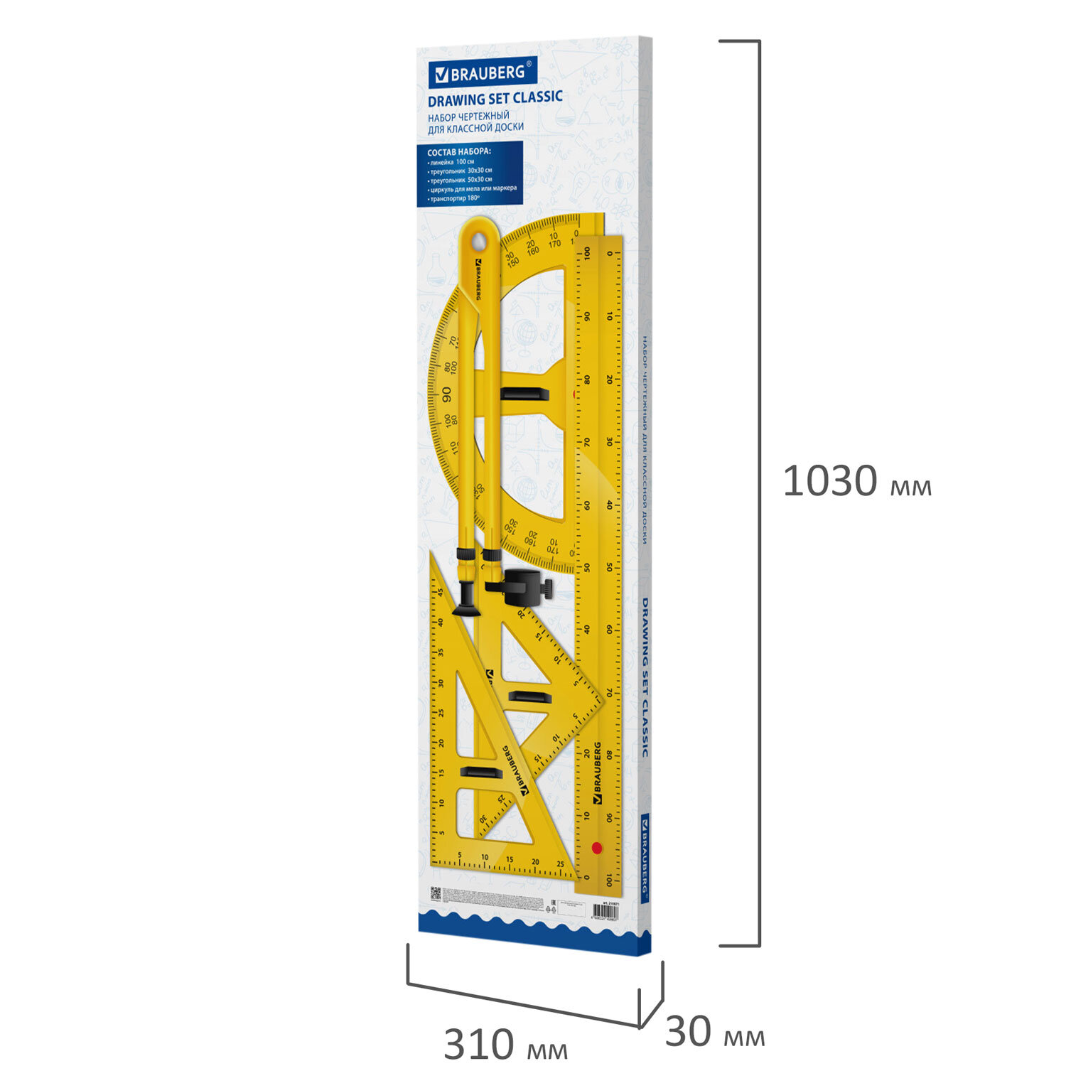 Набор чертежный для классной доски Classic (2 треугольника, транспортир, циркуль, линейка 100 см), BRAUBERG Код товара: 210871 2 532,23 ₽ Купить Производитель:BRAUBERG Набор чертежный BRAUBERG предназначен для выполнения чертежных работ на классных досках. • В набор входит: - линейка 100 см; - транспортир 180° с ручкой; - циркуль для мела и маркера; - треугольник 30° и 60° (30х50 см) с ручкой; - треугольник 45° и 45° (30х30 см) с ручкой. Изготовлен из прочного пластика. С выделенной разметкой.Производство: КитайТип товара: набор чертежный для школьной доскиСерия: School boardКомплектация: 2 треугольника, линейка, транспортир, циркульШкала: 100 смУгол: 180°, 30°, 45°, 60°, 90°Наличие ручки: даМатериал: пластикУпаковка: картонная коробкаВес: 1,75 кгРазмер упаковки: 4 × 101 × 32.5 смОбъём: 0.015 м3Промежуточная упаковка: 10 штТранспортная упаковка: 10 штШтрих-код: 4606224499697 Сертификат-1.jpg Сертификат-2.jpg Сертификат-3.jpg