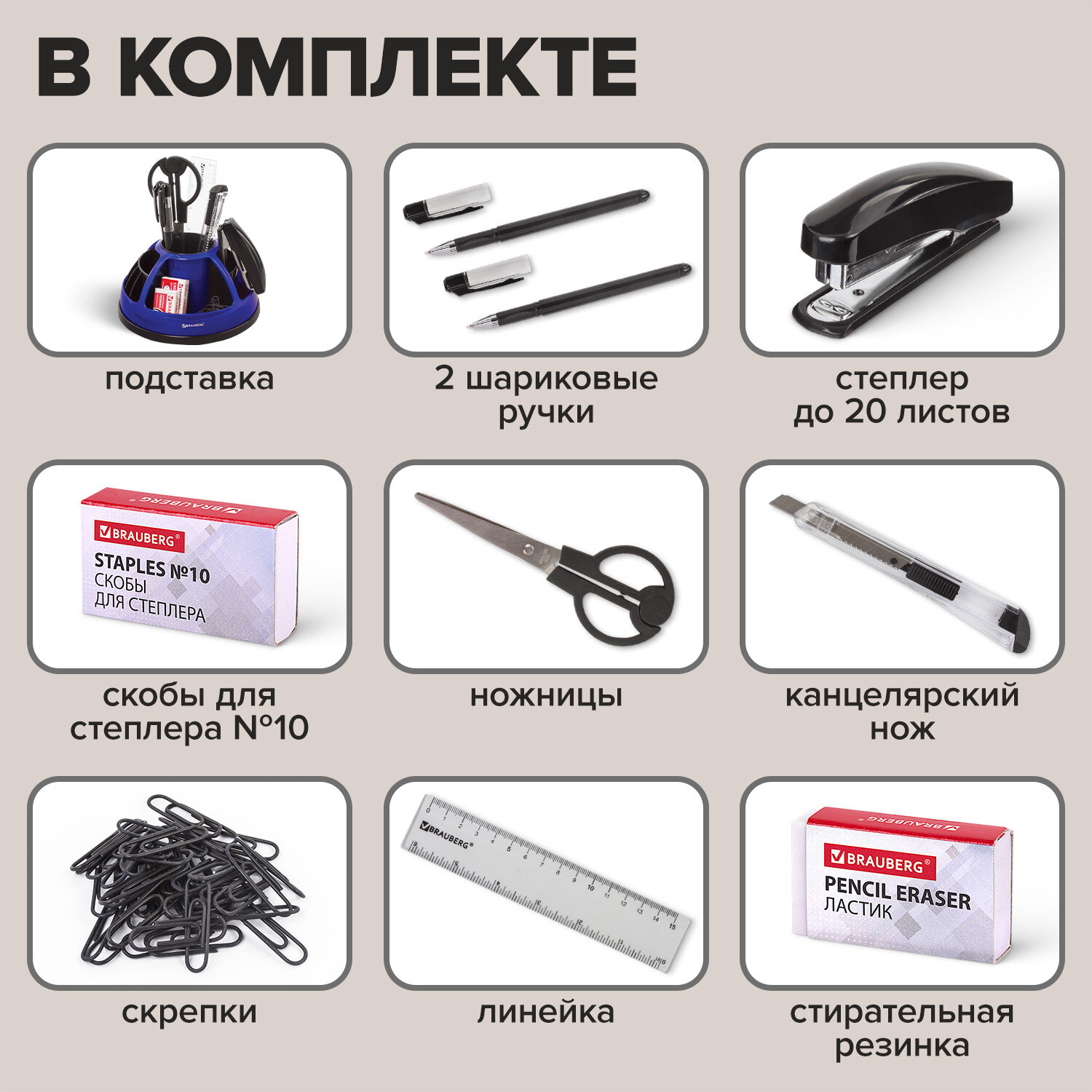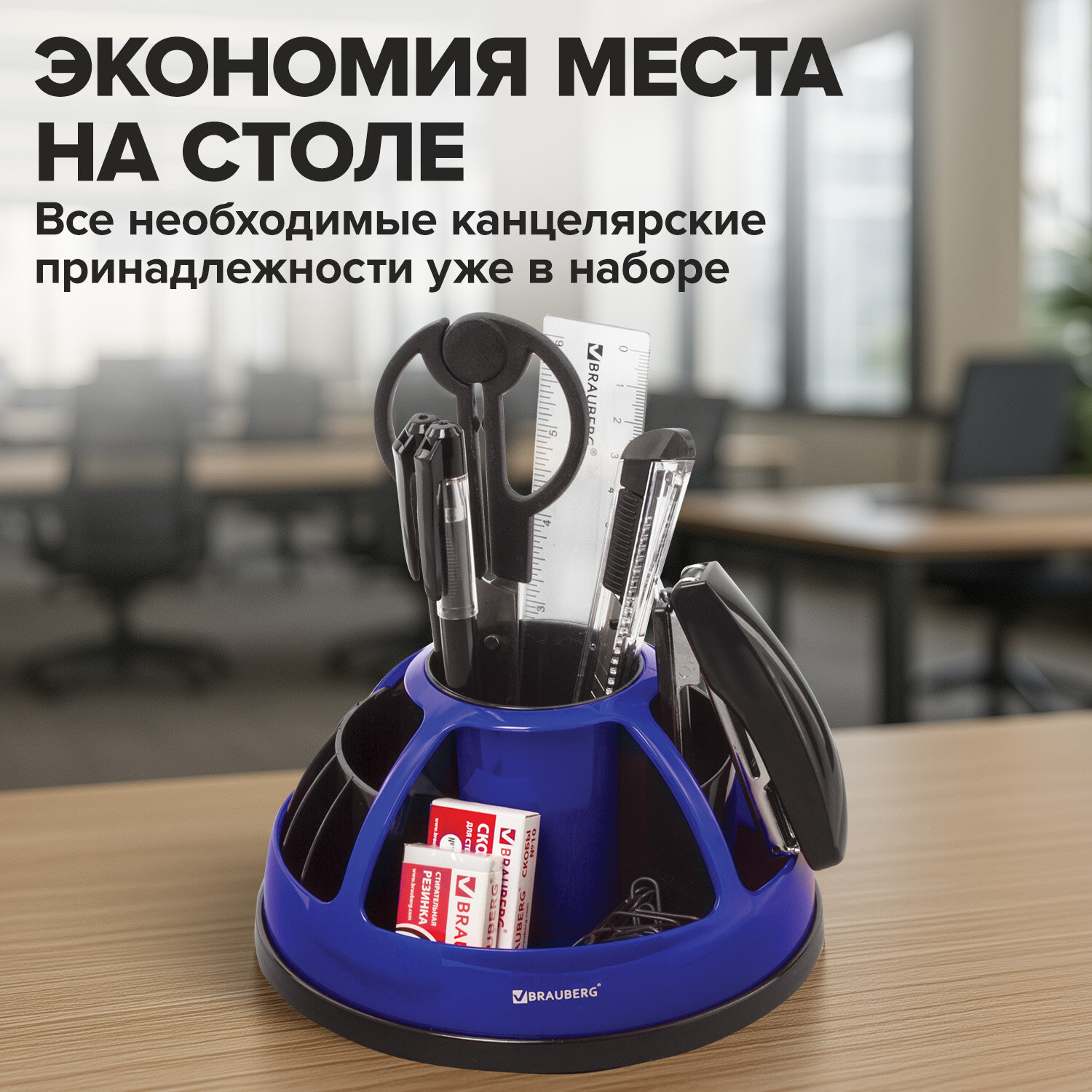 Канцелярский набор BRAUBERG "ULTRA", 10 предметов, вращающаяся конструкция, черно-синий Код товара: 231930 1 390,63 ₽ Купить Производитель:BRAUBERG Настольный набор BRAUBERG "ULTRA" позволяет эффективно и эргономично организовать рабочее место. Вращающаяся на 360° подставка изготовлена из высококачественного пластика и имеет 11 отделений. В наборе 10 предметов: - вращающаяся на 360° подставка; - 2 шариковые ручки; - степлер №10; - скобы для степлера №10; - ножницы; - канцелярский нож; - скрепки; - линейка; - стирательная резинка.Производство: Тайвань (Китай)Количество предметов в наборе: 10 шт.Серия: ULTRAКоличество отделений: 11Вращающийся: даЦвет: черный/синийМатериал подставки: пластикВысота: 84 ммШирина: 161 ммГлубина: 161 ммУпаковка: картонная коробкаСрок годности: 36 месВес: 564 грРазмер упаковки: 11.6 × 17.1 × 17.2 смОбъём: 0.004 м3Промежуточная упаковка: 24 штТранспортная упаковка: 24 штШтрих-код: 4606224052984 Файлы Сертификат-1.jpg Сертификат-2.jpg Сертификат-3.jpg Сертификат-4.jpg Сертификат-5.jpg Сертификат-6.jpg Сертификат-7.jpg Сертификат-8.jpg Сертификат-9.jpg Сертификат-10.jpg Сертификат-11.jpg Сертификат-12.jpg Сертификат-13.jpg Сертификат-14.jpg Сертификат-15.jpg Сертификат-16.jpg Сертификат-17.jpg Сертификат-18.jpg Сертификат-19.jpg Сертификат-20.jpg Сертификат-21.jpg Сертификат-22.jpg Сертификат-23.jpg Сертификат-24.jpg Сертификат-25.jpg Сертификат-26.jpg