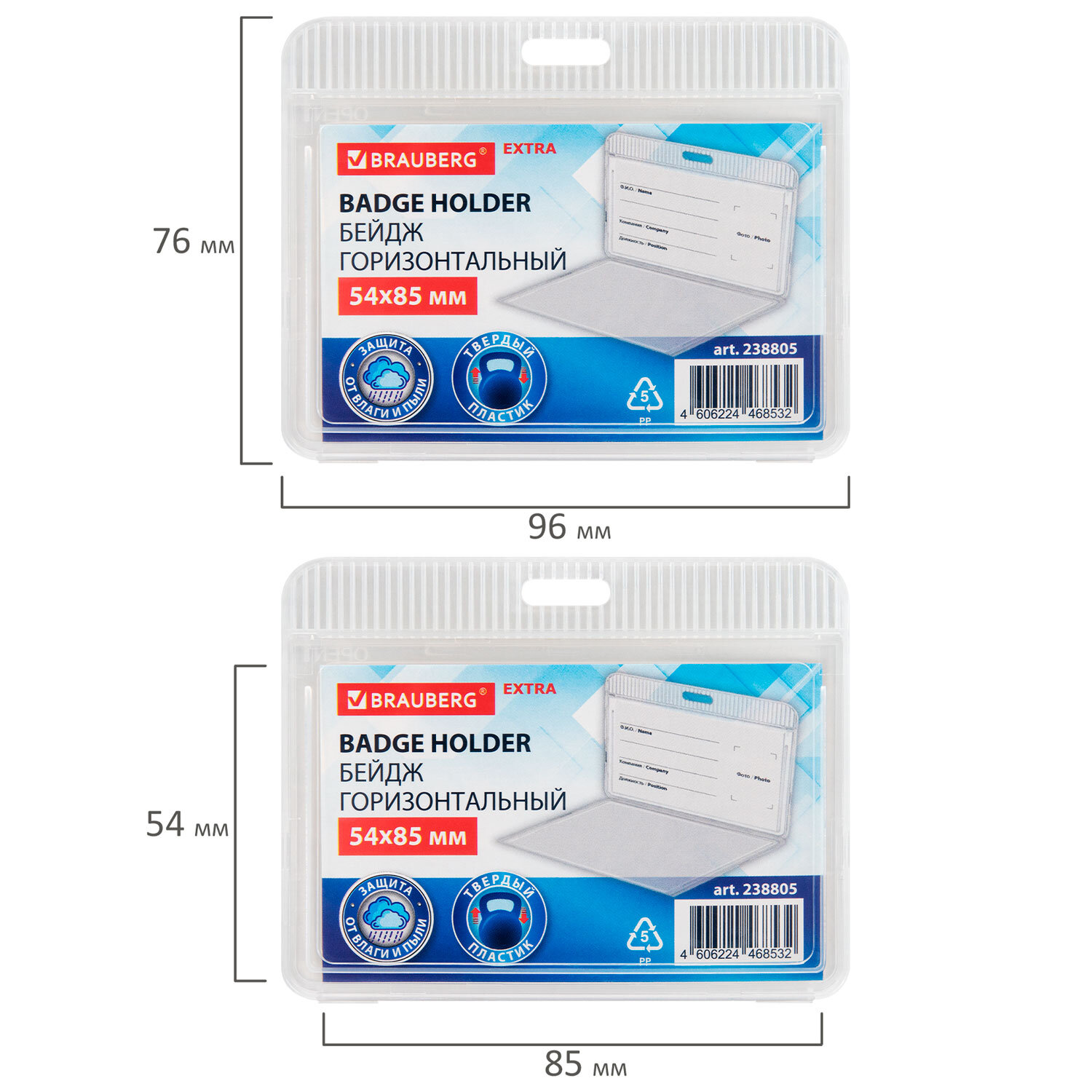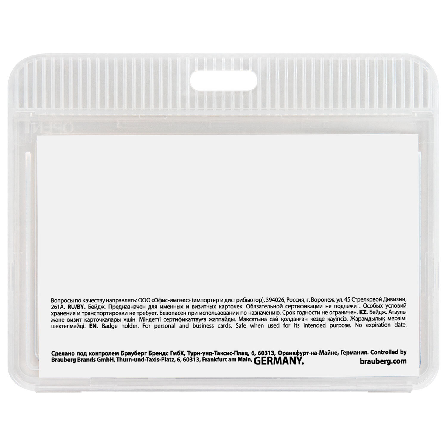 Бейдж горизонтальный (54х85 мм), прозрачный, ЗАЩИТА ОТ ВЛАГИ И ПЫЛИ, BRAUBERG EXTRA Код товара: 238805 24,87 ₽ Купить Производитель:BRAUBERG Горизонтальный бейдж BRAUBERG предназначен для хранения пропусков и карточек сотрудников, ID-карт, проездных и банковских карт. Бейдж подходит для крепления на ленте, держателе с рулеткой. Изготовлен из жесткого пластика, гарантирующего его долгий срок службы. Защищает от влаги и пыли Вашу карту. Идеально подойдёт для чувствительных к механическим повреждениям магнитных карт и пропусков. Размер вкладыша – 54х85 мм. Максимальная толщина пропуска – 2 мм (две стандартных банковских карты). *Вкладыш бейджа без персонализации, на изображении показан возможный пример использования изделия.Производство: КитайТип бейджа: для проездных, пропусков, картТип крепления: без держателяПоложение: горизонтальноеКоличество в комплекте: 1 шт.Размер вкладыша (ДхШ): 54х85 ммРазмер бейджа (ДхШ): 76х96 ммСерия: EXTRAЦвет крепления: нетМатериал корпуса: твердый пластикЦвет корпуса: прозрачныйНаличие картонной вставки: даВес: 15 грРазмер упаковки: 0.4 × 9.7 × 7.6 смОбъём: 0.0001 м3Промежуточная упаковка: 10 штТранспортная упаковка: 600 штШтрих-код: 4606224468532 Файлы Сертификат-1.jpg Сертификат-2.jpg Сертификат-3.jpg Сертификат-4.jpg Сертификат-5.jpg Сертификат-6.jpg Сертификат-7.jpg Сертификат-8.jpg Сертификат-9.jpg Сертификат-10.jpg Сертификат-11.jpg Сертификат-12.jpg Сертификат-13.jpg Сертификат-14.jpg Сертификат-15.jpg Сертификат-16.jpg Сертификат-17.jpg Сертификат-18.jpg Сертификат-19.jpg Сертификат-20.jpg Сертификат-21.jpg Сертификат-22.jpg Сертификат-23.jpg Сертификат-24.jpg Сертификат-25.jpg Сертификат-26.jpg