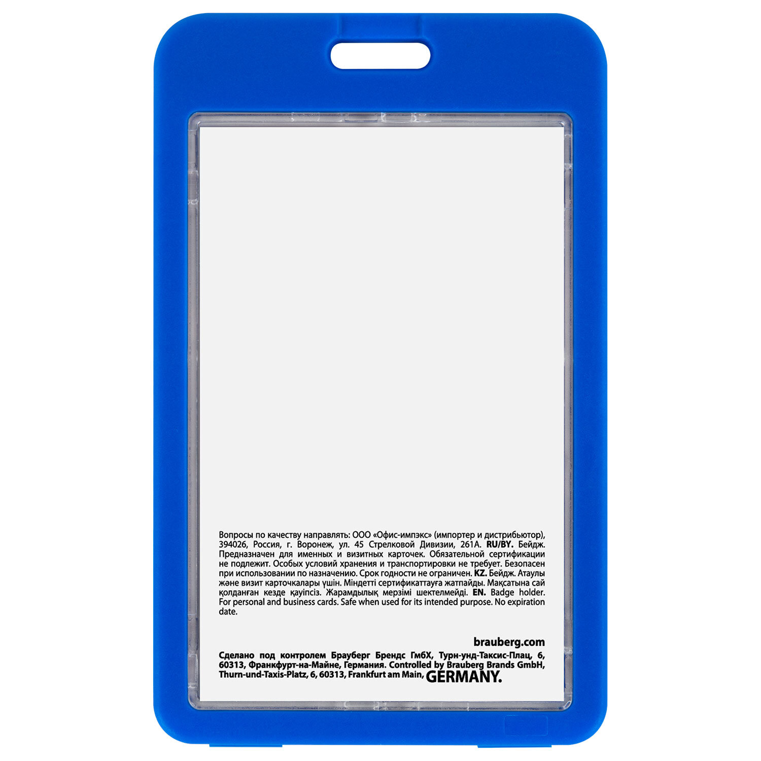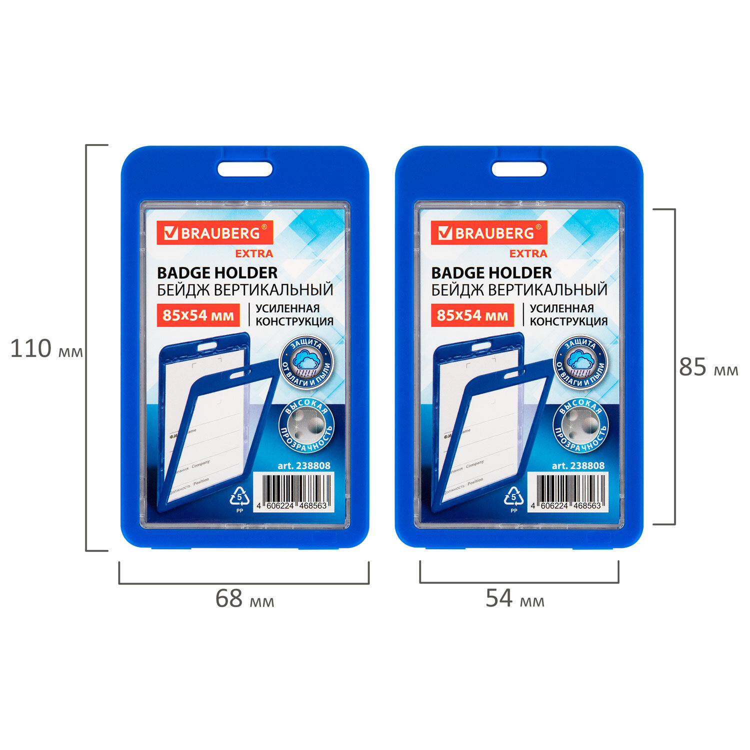 Бейдж вертикальный (85х54 мм), ДВУСТОРОННИЙ, cиний, ЗАЩИТА ОТ ВЛАГИ И ПЫЛИ, BRAUBERG EXTRA Код товара: 238808 85,32 ₽ Купить Производитель:BRAUBERG Вертикальный бейдж BRAUBERG предназначен для хранения пропусков и карточек сотрудников, ID-карт, проездных и банковских карт. Бейдж подходит для крепления на ленте, держателе с рулеткой. Изготовлен из жесткого пластика, гарантирующего его долгий срок службы. Защищает от влаги и пыли Вашу карту. Идеально подойдёт для чувствительных к механическим повреждениям магнитных карт и пропусков. Прозрачное окно с обеих сторон бейджа. Размер вкладыша – 85х54 мм. Максимальная толщина пропуска – 2 мм (две стандартных банковских карты). *Вкладыш бейджа без персонализации, на изображении показан возможный пример использования изделия.Производство: КитайТип бейджа: для проездных, пропусков, картТип крепления: без держателяПоложение: вертикальноеКоличество в комплекте: 1 шт.Размер вкладыша (ДхШ): 85х54 ммРазмер бейджа (ДхШ): 110х68 ммСерия: Double-sidedЦвет крепления: нетМатериал корпуса: твердый пластикЦвет корпуса: синийНаличие картонной вставки: даВес: 30 грРазмер упаковки: 0.6 × 11 × 6.7 смОбъём: 0.0001 м3Промежуточная упаковка: 10 штТранспортная упаковка: 400 штШтрих-код: 4606224468563 Файлы Сертификат-1.jpg Сертификат-2.jpg Сертификат-3.jpg Сертификат-4.jpg Сертификат-5.jpg Сертификат-6.jpg Сертификат-7.jpg Сертификат-8.jpg Сертификат-9.jpg Сертификат-10.jpg Сертификат-11.jpg Сертификат-12.jpg Сертификат-13.jpg Сертификат-14.jpg Сертификат-15.jpg Сертификат-16.jpg Сертификат-17.jpg Сертификат-18.jpg Сертификат-19.jpg Сертификат-20.jpg Сертификат-21.jpg Сертификат-22.jpg Сертификат-23.jpg Сертификат-24.jpg Сертификат-25.jpg Сертификат-26.jpg