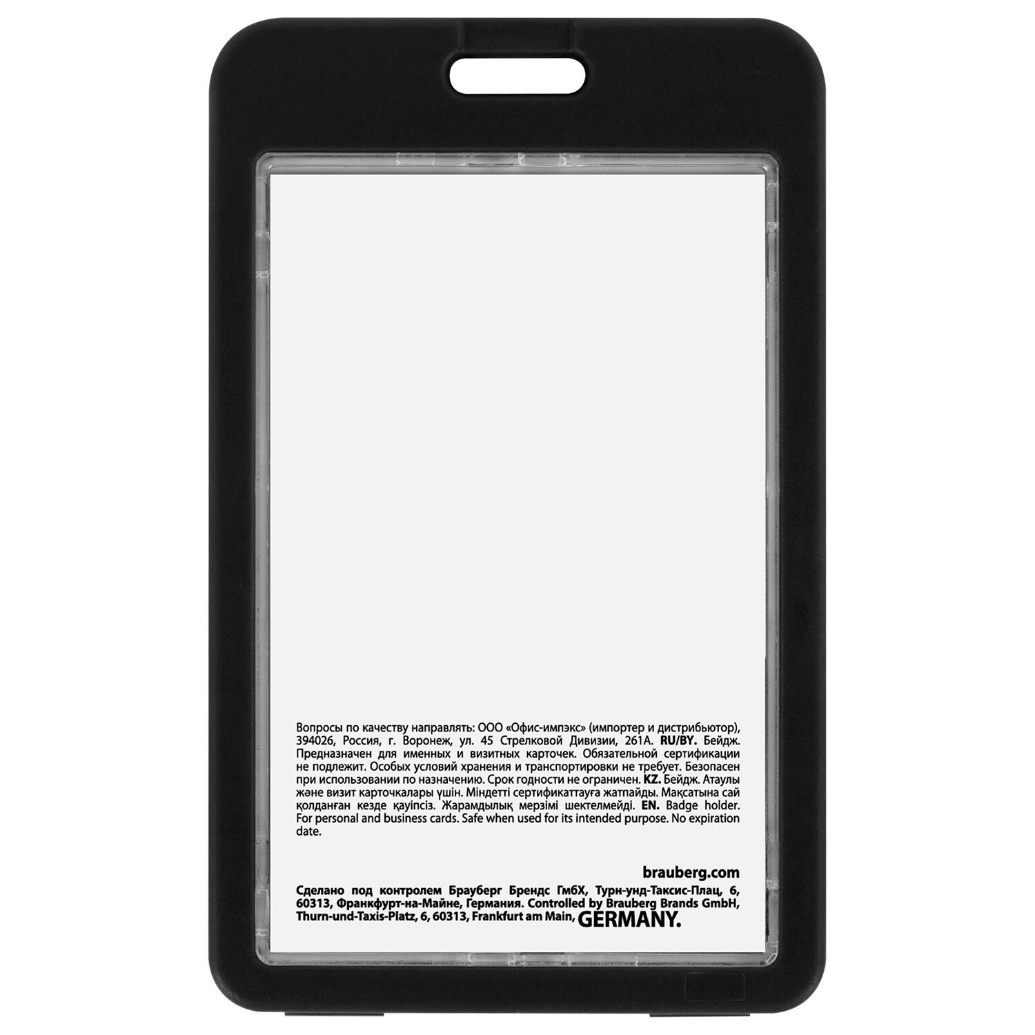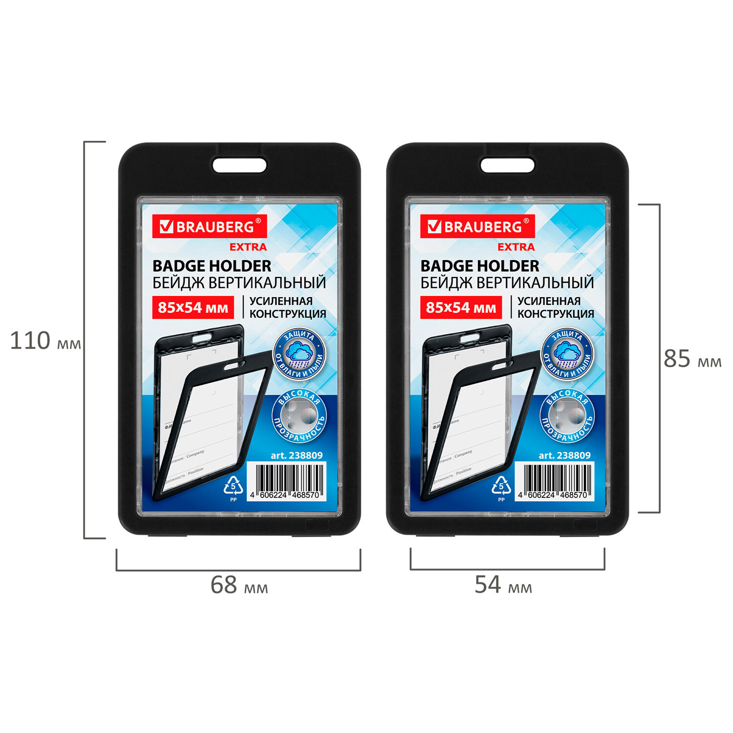 Бейдж вертикальный (85х54 мм), ДВУСТОРОННИЙ, черный, ЗАЩИТА ОТ ВЛАГИ И ПЫЛИ, BRAUBERG EXTRA Код товара: 238809 85,32 ₽ Купить Производитель:BRAUBERG Вертикальный бейдж BRAUBERG предназначен для хранения пропусков и карточек сотрудников, ID-карт, проездных и банковских карт. Бейдж подходит для крепления на ленте, держателе с рулеткой. Изготовлен из жесткого пластика, гарантирующего его долгий срок службы. Защищает от влаги и пыли Вашу карту. Идеально подойдёт для чувствительных к механическим повреждениям магнитных карт и пропусков. Прозрачное окно с обеих сторон бейджа. Размер вкладыша – 85х54 мм. Максимальная толщина пропуска – 2 мм (две стандартных банковских карты). *Вкладыш бейджа без персонализации, на изображении показан возможный пример использования изделия.Производство: КитайТип бейджа: для проездных, пропусков, картТип крепления: без держателяПоложение: вертикальноеКоличество в комплекте: 1 шт.Размер вкладыша (ДхШ): 85х54 ммРазмер бейджа (ДхШ): 110х68 ммСерия: Double-sidedЦвет крепления: нетМатериал корпуса: твердый пластикЦвет корпуса: черныйНаличие картонной вставки: даВес: 30 грРазмер упаковки: 0.6 × 11 × 6.7 смОбъём: 0.0001 м3Промежуточная упаковка: 10 штТранспортная упаковка: 400 штШтрих-код: 4606224468570 Файлы Сертификат-1.jpg Сертификат-2.jpg Сертификат-3.jpg Сертификат-4.jpg Сертификат-5.jpg Сертификат-6.jpg Сертификат-7.jpg Сертификат-8.jpg Сертификат-9.jpg Сертификат-10.jpg Сертификат-11.jpg Сертификат-12.jpg Сертификат-13.jpg Сертификат-14.jpg Сертификат-15.jpg Сертификат-16.jpg Сертификат-17.jpg Сертификат-18.jpg Сертификат-19.jpg Сертификат-20.jpg Сертификат-21.jpg Сертификат-22.jpg Сертификат-23.jpg Сертификат-24.jpg Сертификат-25.jpg Сертификат-26.jpg
