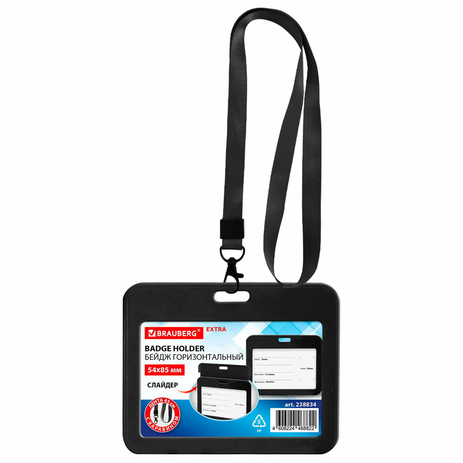 Бейдж горизонтальный (54х85 мм), лента 45 см с карабином, СЛАЙДЕР, черный, BRAUBERG EXTRA Код товара: 238834 100,23 ₽ Купить Производитель:BRAUBERG Горизонтальный бейдж BRAUBERG для хранения тонких пропусков и карточек сотрудников, ID карт, проездных и банковских карт. Бейдж-слайдер с лентой 45 см на карабине. Изготовлен из жесткого пластика, гарантирующего долгий срок службы бейджа. Защищает от внешних воздействий Вашу карту. Идеально подойдёт для чувствительных к механическим повреждениям магнитных карт и пропусков. Размер вкладыша 54х85 мм. *Вкладыш бейджа без персонализации, на изображении показан возможный пример использования изделия.Производство: КитайТип бейджа: слайдерТип крепления: лентаПоложение: горизонтальноеКоличество в комплекте: 1 шт.Размер вкладыша (ДхШ): 54х85 ммРазмер бейджа (ДхШ): 79х100 ммСерия: EXTRAЦвет крепления: черныйМатериал корпуса: твердый пластикЦвет корпуса: черныйДлина ленты/шнурка: 45 смНаличие картонной вставки: даВес: 36 грРазмер упаковки: 1.2 × 10.8 × 7.9 смОбъём: 0.0001 м3Промежуточная упаковка: 10 штТранспортная упаковка: 240 штШтрих-код: 4606224468822