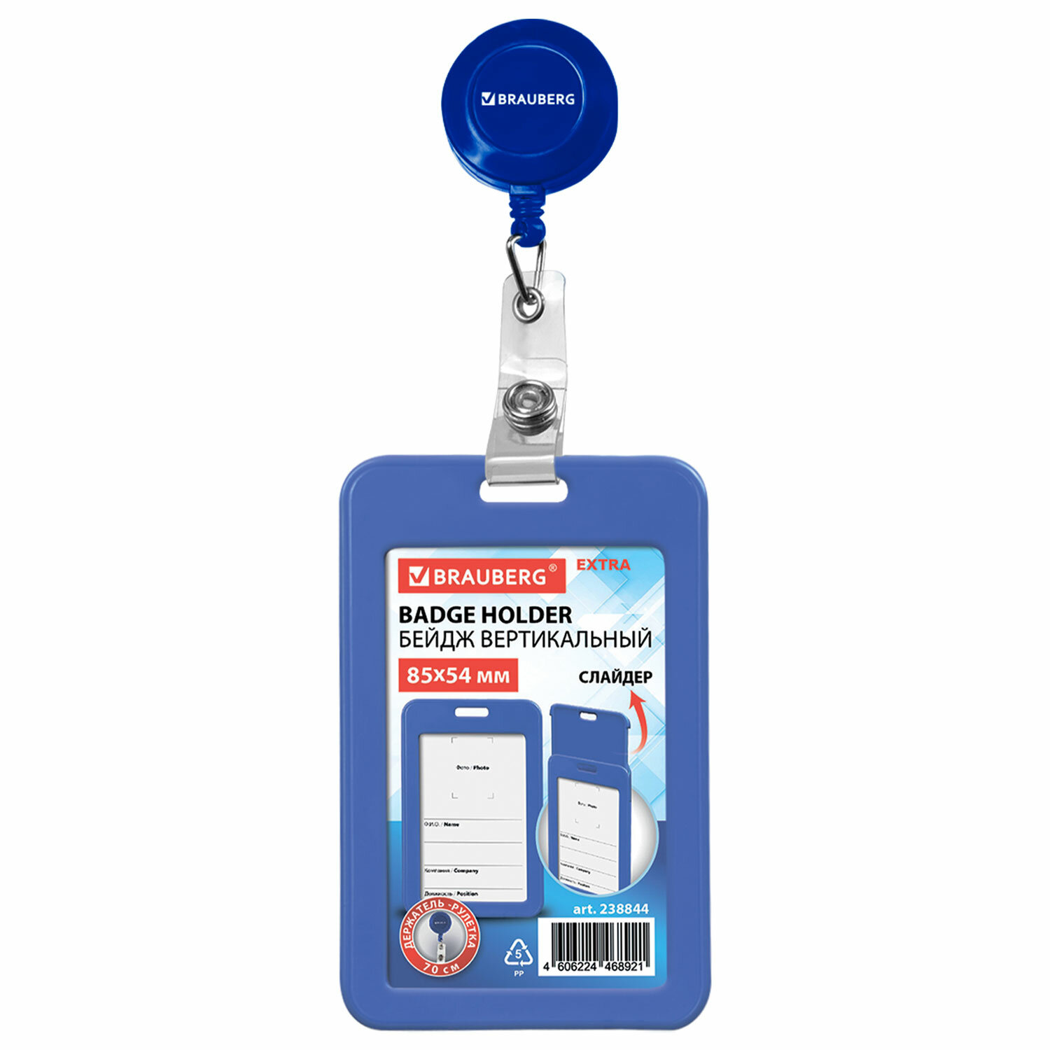 Бейдж вертикальный (85х54 мм), с рулеткой 70 см с клипом, СЛАЙДЕР, синий, BRAUBERG EXTRA Код товара: 238844 118,76 ₽ Купить Производитель:BRAUBERG Вертикальный бейдж с рулеткой BRAUBERG для хранения тонких пропусков, карточек, ID карт, проездных и банковских карт. Бейдж -слайдер с держателем рулеткой 70 см. Изготовлен из жесткого пластика, гарантирующего долгий срок службы и защищающего от внешних воздействий Вашу именную карту. Идеально подойдёт для чувствительных к механическим повреждениям магнитных карт и пропусков. Держатель-рулетка оснащен клипсой, благодаря которой его можно с лёгкостью закрепить на поясе или любом другом элементе одежды. Размер вкладыша 85х54 мм. *Вкладыш бейджа без персонализации, на изображении показан возможный пример использования изделия.Производство: КитайТип бейджа: слайдерТип крепления: держатель с рулеткойПоложение: вертикальноеКоличество в комплекте: 1 шт.Размер вкладыша (ДхШ): 85х54 ммРазмер бейджа (ДхШ): 110х67 ммСерия: EXTRAЦвет крепления: синийМатериал корпуса: твердый пластикЦвет корпуса: синийДлина нити в держателе-рулетке: 70 смНаличие картонной вставки: даВес: 35 грРазмер упаковки: 1.9 × 11 × 7 смОбъём: 0.0002 м3Промежуточная упаковка: 10 штТранспортная упаковка: 240 штШтрих-код: 4606224468921