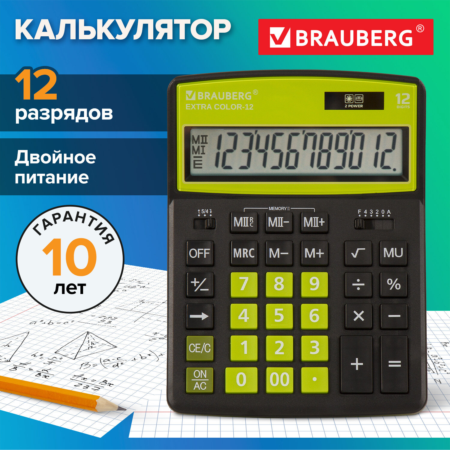 Калькулятор настольный BRAUBERG EXTRA COLOR-12-BKLG (206x155 мм), 12 разрядов, двойное питание, ЧЕРНО-САЛАТОВЫЙ Код товара: 250477 1 206,35 ₽ Купить Производитель:BRAUBERG Настольный калькулятор BRAUBERG EXTRA COLOR-12-BKLG. Большой дисплей с увеличенным углом обзора, устойчивый корпус и клавиатура с цветной дифференциацией для эффективной работы с максимальным комфортом. Калькулятор производит все основные арифметические действия: возведение в степень, вычисления с процентами, извлечение квадратного корня. Незаменим для бухгалтеров благодаря наличию клавиш двойной памяти, «00» и MU для расчетов налогов и торговой наценки. Переключатели округления и положения десятичного знака позволяют производить нужные настройки. Большой двенадцатиразрядный дисплей отображает большие значения с высокой точностью округления. Встроенный аккумулятор и солнечная батарея позволяют калькулятору работать при любом освещении, а клавиша выключения OFF и функция автоматического отключения (через 8-10 минут бездействия) позволяют максимально продлить срок его службы без замены батареи. Размер - 206x155 мм. Гарантия 10 лет.Производство: КитайРазрядность дисплея: 12Серия: ExtraТип размера: полноразмерныйТип применения: для бухгалтеровСтиль: дизайнерскийФункционал: вычисление наценки (MU)Исполнение: настольныйЧисло строк дисплея: 1Материал кнопок: пластикТип питания: 1 батарейка LR44 (LR1154/AG13), солнечный элементЦвет панели: черно-зеленыйДлина корпуса: 206 ммШирина корпуса: 155 ммВысота корпуса: 40 ммВес: 351 грРазмер упаковки: 3.7 × 24.2 × 15.7 смОбъём: 0.0019 м3Промежуточная упаковка: 20 штТранспортная упаковка: 40 штШтрих-код: 4606224282466 Сертификат-1.jpg Сертификат-2.jpg Сертификат-3.jpg