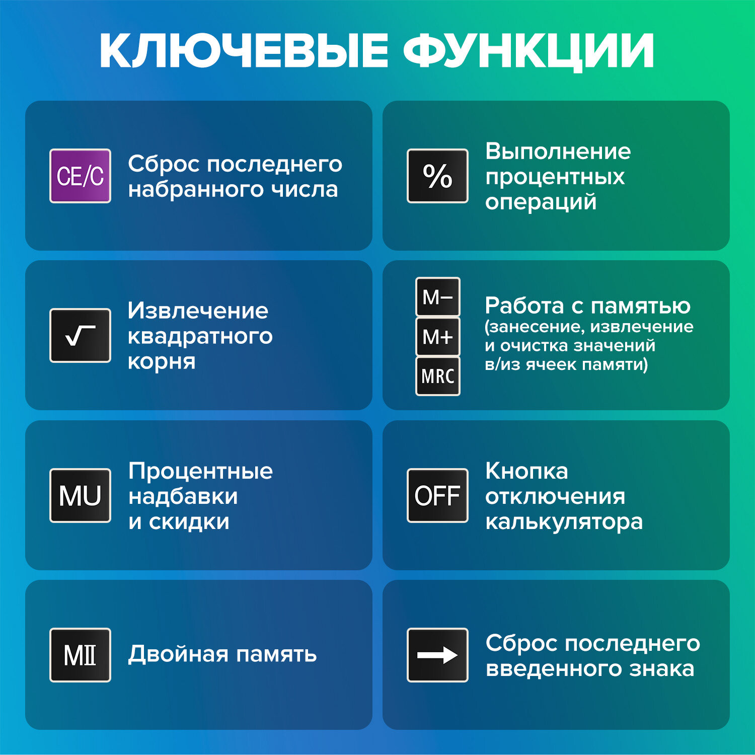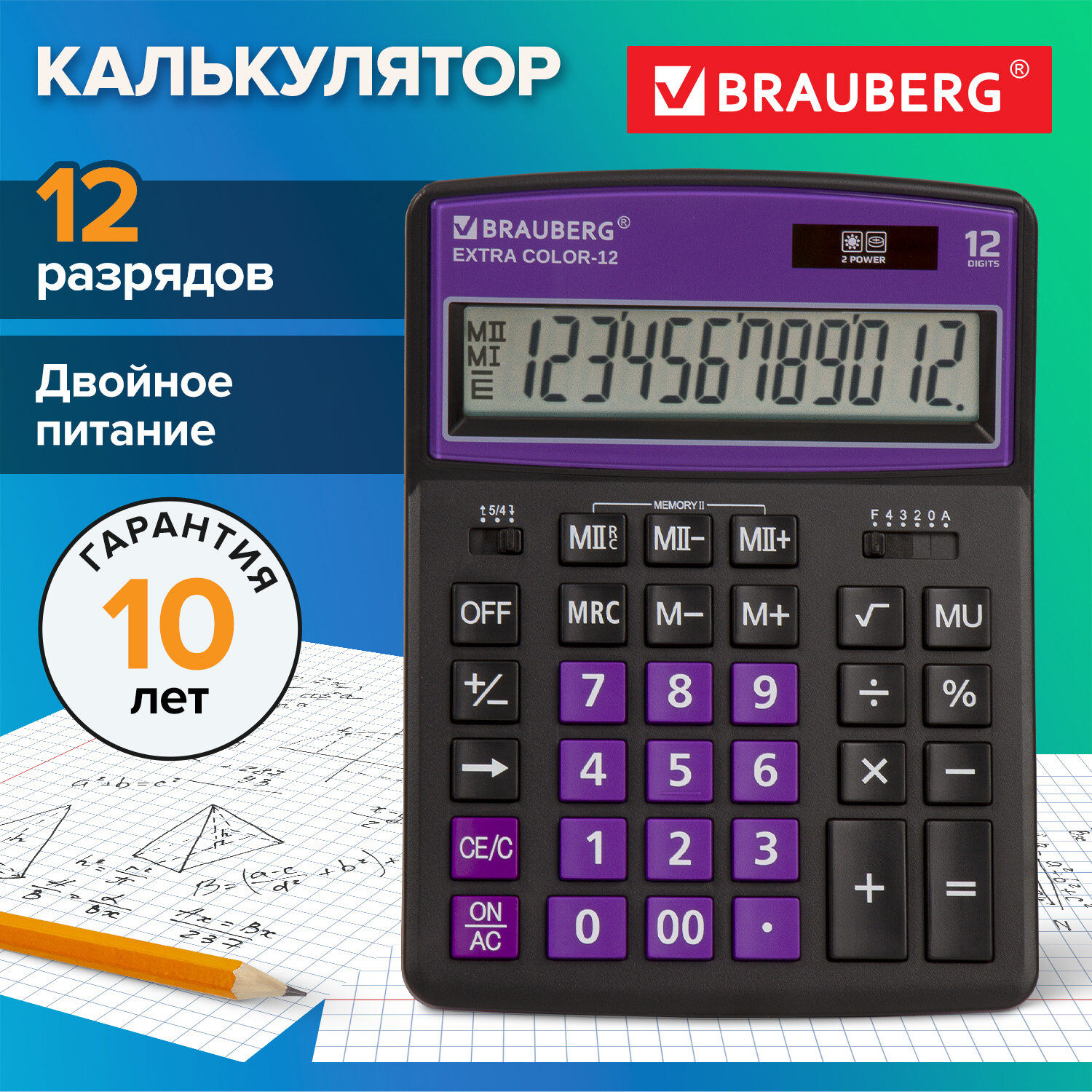 Калькулятор настольный BRAUBERG EXTRA COLOR-12-BKPR (206x155 мм),12 разрядов, двойное питание, ЧЕРНО-ФИОЛЕТОВЫЙ Код товара: 250480 1 206,35 ₽ Купить Производитель:BRAUBERG Настольный калькулятор BRAUBERG EXTRA COLOR-12-BKPR. Большой дисплей с увеличенным углом обзора, устойчивый корпус и клавиатура с цветной дифференциацией для эффективной работы с максимальным комфортом. Калькулятор производит все основные арифметические действия: возведение в степень, вычисления с процентами, извлечение квадратного корня. Незаменим для бухгалтеров благодаря наличию клавиш двойной памяти, «00» и MU для расчетов налогов и торговой наценки. Переключатели округления и положения десятичного знака позволяют производить нужные настройки. Большой двенадцатиразрядный дисплей отображает большие значения с высокой точностью округления. Встроенный аккумулятор и солнечная батарея позволяют калькулятору работать при любом освещении, а клавиша выключения OFF и функция автоматического отключения (через 8-10 минут бездействия) позволяют максимально продлить срок его службы без замены батареи. Размер - 206x155 мм. Гарантия 10 лет.Производство: КитайРазрядность дисплея: 12Серия: ExtraТип размера: полноразмерныйТип применения: для бухгалтеровСтиль: дизайнерскийФункционал: вычисление наценки (MU)Исполнение: настольныйЧисло строк дисплея: 1Материал кнопок: пластикТип питания: 1 батарейка LR44 (LR1154/AG13), солнечный элементЦвет панели: черный/фиолетовыйДлина корпуса: 206 ммШирина корпуса: 155 ммВысота корпуса: 40 ммВес: 355 грРазмер упаковки: 3.9 × 24.4 × 16.1 смОбъём: 0.0019 м3Промежуточная упаковка: 20 штТранспортная упаковка: 40 штШтрих-код: 4606224282497 Сертификат-1.jpg Сертификат-2.jpg Сертификат-3.jpg